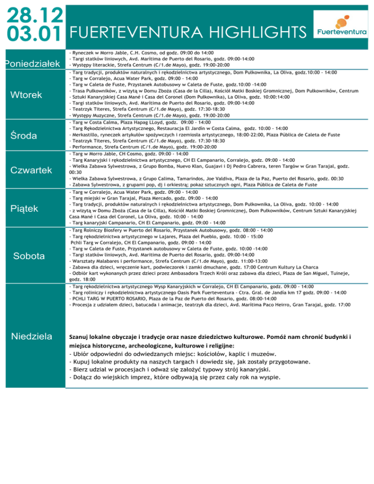 28.12 03.01 FUERTEVENTURA HIGHLIGHTS Poniedziałek - Ryneczek w Morro Jable, C.H. Cosmo, od godz. 09:00 do 14:00 - Targi statków liniowych, Avd. Marítima de Puerto del Rosario, godz. 09:00-14:00 - Występy literackie, Strefa Centrum (C/1.de Mayo), godz. 19:00-20:00 Wtorek - Targ tradycji, produktów naturalnych i rękodzielnictwa artystycznego, Dom Pułkownika, La Oliva, godz.10:00 - 14:00 Targ w Corralejo, Acua Water Park, godz. 09:00 - 14:00 Targ w Caleta de Fuste, Przystanek Autobusowy w Caleta de Fuste, godz.10:00 -14:00 Trasa Pułkowników, z wizytą w Domu Zboża (Casa de la Cilla), Kościół Matki Boskiej Gromnicznej, Dom Pułkowników, Centrum Sztuki Kanaryjskiej Casa Mané i Casa del Coronel (Dom Pułkownika), La Oliva, godz. 10:00:14:00 Targi statków liniowych, Avd. Marítima de Puerto del Rosario, godz. 09:00-14:00 Teatrzyk Titeres, Strefa Centrum (C/1.de Mayo), godz. 17:30-18:30 Występy Muzyczne, Strefa Centrum (C/1.de Mayo), godz. 19:00-20:00 Środa - Targ w Costa Calma, Plaza Hapag LLoyd, godz. 09:00 - 14:00 Targ Rękodzielnictwa Artystycznego, Restauracja El Jardín w Costa Calma, godz. 10:00 - 14:00 Merkastillo, ryneczek artykułów spożywczych i rzemiosła artystycznego, 18:00-22:00, Plaza Pública de Caleta de Fuste Teatrzyk Titeres, Strefa Centrum (C/1.de Mayo), godz. 17:30-18:30 Performance, Strefa Centrum (C/1.de Mayo), godz. 19:00-20:00 Czwartek - Targ w Morro Jable, CH Cosmo, godz. 09:00 - 14:00 - Targ Kanaryjski i rękodzielnictwa artystycznego, CH El Campanario, Corralejo, godz. 09:00 - 14:00 - Wielka Zabawa Sylwestrowa, z Grupo Bomba, Nuevo Klan, Guajavi i Dj Pedro Cabrera, teren Targów w Gran Tarajal, godz. 00:30 - Wielka Zabawa Sylwestrowa, z Grupo Calima, Tamarindos, Joe Valdiva, Plaza de la Paz, Puerto del Rosario, godz. 00:30 - Zabawa Sylwestrowa, z grupami pop, dj i orkiestrą; pokaz sztucznych ogni, Plaza Pública de Caleta de Fuste Piątek - Targ w Corralejo, Acua Water Park, godz. 09:00 - 14:00 - Targ miejski w Gran Tarajal, Plaza Mercado, godz. 09:00 - 14:00 - Targ tradycji, produktów naturalnych i rękodzielnictwa artystycznego, Dom Pułkownika, La Oliva, godz. 10:00 - 14:00 - z wizytą w Domu Zboża (Casa de la Cilla), Kościół Matki Boskiej Gromnicznej, Dom Pułkowników, Centrum Sztuki Kanaryjskiej Casa Mané i Casa del Coronel, La Oliva, godz. 10:00 - 14:00 - Targ kanaryjski Campanario, CH El Campanario, godz. 09:00 - 14:00 Sobota -Targ Rolniczy Biosfery w Puerto del Rosario, Przystanek Autobusowy, godz. 08:00 - 14:00 - Targ rękodzielnictwa artystycznego w Lajares, Plaza del Pueblo, godz. 10:00 - 15:00 Pchli Targ w Corralejo, CH El Campanario, godz. 09:00 - 14:00 - Targ w Caleta de Fuste, Przystanek autobusowy w Caleta de Fuste, godz. 10:00 -14:00 - Targi statków liniowych, Avd. Maritima de Puerto del Rosario, godz. 09:00-14:00 - Warsztaty Malabares i performance, Strefa Centrum (C/1.de Mayo), godz. 11:00-13:00 - Zabawa dla dzieci, wręczenie kart, podwieczorek i zamki dmuchane, godz. 17:00 Centrum Kultury La Charca - Odbiór kart wykonanych przez dzieci przez Ambasadora Trzech Króli oraz zabawa dla dzieci, Plaza de San Miguel, Tuineje, godz. 18:00 - Niedziela Szanujlokalneobyczajeitradycjeoraznaszedziedzictwokulturowe.Pomóżnamchronićbudynkii miejscahistoryczne,archeologiczne,kulturoweireligijne: - Targ rękodzielnictwa artystycznego Wysp Kanaryjskich w Corralejo, CH El Campanario, godz. 09:00 - 14:00 Targ roliniczy i rękodzielnictwa artystycznego Oasis Park Fuerteventura - Ctra. Gral. de Jandía km 17 godz. 09:00 - 14:00 PCHLI TARG W PUERTO ROSARIO, Plaza de la Paz de Puerto del Rosario, godz. 08:00-14:00 Procesja z udziałem dzieci, batucada i animacje, teatrzyk dla dzieci, Avd. Marítima Paco Heirro, Gran Tarajal, godz. 17:00 Ubiór odpowiedni do odwiedzanych miejsc: kościołów, kaplic i muzeów. Kupuj lokalne produkty na naszych targach i dowiedz się, jak zostały przygotowane. Bierz udział w procesjach i odważ się założyć typowy strój kanaryjski. Dołącz do wiejskich imprez, które odbywają się przez cały rok na wyspie.