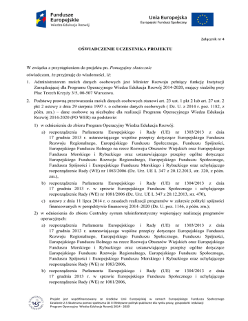 Załącznik nr 4 OŚWIADCZENIE UCZESTNIKA PROJEKTU W związku z przystąpieniem do projektu pn. Pomagajmy skutecznie oświadczam, że przyjmuję do wiadomości, iż: 1. Administratorem moich danych osobowych jest Minister Rozwoju pełniący funkcję Instytucji Zarządzającej dla Programu Operacyjnego Wiedza Edukacja Rozwój 2014-2020, mający siedzibę przy Plac Trzech Krzyży 3/5, 00-507 Warszawa. 2. Podstawę prawną przetwarzania moich danych osobowych stanowi art. 23 ust. 1 pkt 2 lub art. 27 ust. 2 pkt 2 ustawy z dnia 29 sierpnia 1997 r. o ochronie danych osobowych ( Dz. U. z 2014 r. poz. 1182, z późn. zm.) – dane osobowe są niezbędne dla realizacji Programu Operacyjnego Wiedza Edukacja Rozwój 2014-2020 (PO WER) na podstawie: 1) w odniesieniu do zbioru Program Operacyjny Wiedza Edukacja Rozwój: a) rozporządzenia Parlamentu Europejskiego i Rady (UE) nr 1303/2013 z dnia 17 grudnia 2013 r. ustanawiającego wspólne przepisy dotyczące Europejskiego Funduszu Rozwoju Regionalnego, Europejskiego Funduszu Społecznego, Funduszu Spójności, Europejskiego Funduszu Rolnego na rzecz Rozwoju Obszarów Wiejskich oraz Europejskiego Funduszu Morskiego i Rybackiego oraz ustanawiającego przepisy ogólne dotyczące Europejskiego Funduszu Rozwoju Regionalnego, Europejskiego Funduszu Społecznego, Funduszu Spójności i Europejskiego Funduszu Morskiego i Rybackiego oraz uchylającego rozporządzenie Rady (WE) nr 1083/2006 (Dz. Urz. UE L 347 z 20.12.2013, str. 320, z późn. zm.), b) rozporządzenia Parlamentu Europejskiego i Rady (UE) nr 1304/2013 z dnia 17 grudnia 2013 r. w sprawie Europejskiego Funduszu Społecznego i uchylającego rozporządzenie Rady (WE) nr 1081/2006 (Dz. Urz. UE L 347 z 20.12.2013, str. 470), c) ustawy z dnia 11 lipca 2014 r. o zasadach realizacji programów w zakresie polityki spójności finansowanych w perspektywie finansowej 2014–2020 (Dz. U. poz. 1146, z późn. zm.); 2) w odniesieniu do zbioru Centralny system teleinformatyczny wspierający realizację programów operacyjnych: a) rozporządzenia Parlamentu Europejskiego i Rady (UE) nr 1303/2013 z dnia 17 grudnia 2013 r. ustanawiającego wspólne przepisy dotyczące Europejskiego Funduszu Rozwoju Regionalnego, Europejskiego Funduszu Społecznego, Funduszu Spójności, Europejskiego Funduszu Rolnego na rzecz Rozwoju Obszarów Wiejskich oraz Europejskiego Funduszu Morskiego i Rybackiego oraz ustanawiającego przepisy ogólne dotyczące Europejskiego Funduszu Rozwoju Regionalnego, Europejskiego Funduszu Społecznego, Funduszu Spójności i Europejskiego Funduszu Morskiego i Rybackiego oraz uchylającego rozporządzenie Rady (WE) nr 1083/2006, b) rozporządzenia Parlamentu Europejskiego i Rady (UE) nr 1304/2013 z dnia 17 grudnia 2013 r. w sprawie Europejskiego Funduszu Społecznego i uchylającego rozporządzenie Rady (WE) nr 1081/2006, Projekt jest współfinansowany ze środków Unii Europejskiej w ramach Europejskiego Funduszu Społecznego Działanie 2.5 Skuteczna pomoc społeczna Oś II Efektywne polityki publiczne dla rynku pracy, gospodarki i edukacji Program Operacyjny Wiedza Edukacja Rozwój 2014 - 2020 Załącznik nr 4 c) ustawy z dnia 11 lipca 2014 r. o zasadach realizacji programów w zakresie polityki spójności finansowanych w perspektywie finansowej 2014–2020, d) rozporządzenia wykonawczego Komisji (UE) nr 1011/2014 z dnia 22 września 2014 r. ustanawiającego szczegółowe przepisy wykonawcze do rozporządzenia Parlamentu Europejskiego i Rady (UE) nr 1303/2013 w odniesieniu do wzorów służących do przekazywania Komisji określonych informacji oraz szczegółowe przepisy dotyczące wymiany informacji między beneficjentami a instytucjami zarządzającymi, certyfikującymi, audytowymi i pośredniczącymi (Dz. Urz. UE L 286 z 30.09.2014, str. 1). 3. Moje dane osobowe będą przetwarzane wyłącznie w celu realizacji projektu Pomagajmy skutecznie, w szczególności potwierdzenia kwalifikowalności wydatków, udzielenia wsparcia, monitoringu, ewaluacji, kontroli, audytu i sprawozdawczości oraz działań informacyjno-promocyjnych w ramach PO WER. 4. Moje dane osobowe zostały powierzone do przetwarzania Instytucji Pośredniczącej – Ministerstwo Rodziny, Pracy i Polityki Społecznej, ul. Nowogrodzka 1/3/5 00 – 513 Warszawa, (nazwa i adres właściwej Instytucji Pośredniczącej), beneficjentowi realizującemu projekt - Uniwersytet Szczeciński, al. Papieża Jana Pawła II 22a, 70 – 453 Szczecin (nazwa i adres beneficjenta) oraz podmiotom, które na zlecenie beneficjenta uczestniczą w realizacji projektu …………………………………………………………………………………………………………..… (nazwa i adres ww. podmiotów). Moje dane osobowe mogą zostać przekazane podmiotom realizującym badania ewaluacyjne na zlecenie Powierzającego, Instytucji Pośredniczącej lub beneficjenta. Moje dane osobowe mogą zostać również powierzone specjalistycznym firmom, realizującym na zlecenie Powierzającego, Instytucji Pośredniczącej oraz beneficjenta kontrole i audyt w ramach PO WER. 5. Podanie danych jest dobrowolne, aczkolwiek odmowa ich podania jest równoznaczna z brakiem możliwości udzielenia wsparcia w ramach projektu. 6. W terminie 4 tygodni po zakończeniu udziału w projekcie przekażę beneficjentowi dane dotyczące mojego statusu na rynku pracy oraz informacje na temat udziału w kształceniu lub szkoleniu oraz uzyskania kwalifikacji lub nabycia kompetencji. 7. W ciągu trzech miesięcy po zakończeniu udziału w projekcie udostępnię dane dotyczące mojego statusu na rynku pracy. 8. Mam prawo dostępu do treści swoich danych i ich poprawiania. …..……………………………………… MIEJSCOWOŚĆ I DATA * …………………………………………… CZYTELNY PODPIS UCZESTNIKA PROJEKTU* W przypadku deklaracji uczestnictwa osoby małoletniej oświadczenie powinno zostać podpisane przez jej prawnego opiekuna. Projekt jest współf