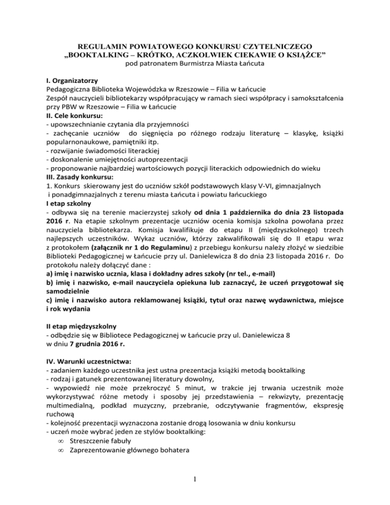 REGULAMIN POWIATOWEGO KONKURSU CZYTELNICZEGO „BOOKTALKING – KRÓTKO, ACZKOLWIEK CIEKAWIE O KSIĄŻCE” pod patronatem Burmistrza Miasta Łańcuta I. Organizatorzy Pedagogiczna Biblioteka Wojewódzka w Rzeszowie – Filia w Łańcucie Zespół nauczycieli bibliotekarzy współpracujący w ramach sieci współpracy i samokształcenia przy PBW w Rzeszowie – Filia w Łańcucie II. Cele konkursu: - upowszechnianie czytania dla przyjemności - zachęcanie uczniów do sięgnięcia po różnego rodzaju literaturę – klasykę, książki popularnonaukowe, pamiętniki itp. - rozwijanie świadomości literackiej - doskonalenie umiejętności autoprezentacji - proponowanie najbardziej wartościowych pozycji literackich odpowiednich do wieku III. Zasady konkursu: 1. Konkurs skierowany jest do uczniów szkół podstawowych klasy V-VI, gimnazjalnych i ponadgimnazjalnych z terenu miasta Łańcuta i powiatu łańcuckiego I etap szkolny - odbywa się na terenie macierzystej szkoły od dnia 1 października do dnia 23 listopada 2016 r. Na etapie szkolnym prezentacje uczniów ocenia komisja szkolna powołana przez nauczyciela bibliotekarza. Komisja kwalifikuje do etapu II (międzyszkolnego) trzech najlepszych uczestników. Wykaz uczniów, którzy zakwalifikowali się do II etapu wraz z protokołem (załącznik nr 1 do Regulaminu) z przebiegu konkursu należy złożyć w siedzibie Biblioteki Pedagogicznej w Łańcucie przy ul. Danielewicza 8 do dnia 23 listopada 2016 r. Do protokołu należy dołączyć dane : a) imię i nazwisko ucznia, klasa i dokładny adres szkoły (nr tel., e-mail) b) imię i nazwisko, e-mail nauczyciela opiekuna lub zaznaczyć, że uczeń przygotował się samodzielnie c) imię i nazwisko autora reklamowanej książki, tytuł oraz nazwę wydawnictwa, miejsce i rok wydania II etap międzyszkolny - odbędzie się w Bibliotece Pedagogicznej w Łańcucie przy ul. Danielewicza 8 w dniu 7 grudnia 2016 r. IV. Warunki uczestnictwa: - zadaniem każdego uczestnika jest ustna prezentacja książki metodą booktalking - rodzaj i gatunek prezentowanej literatury dowolny, - wypowiedź nie może przekroczyć 5 minut, w trakcie jej trwania uczestnik może wykorzystywać różne metody i sposoby jej przedstawienia – rekwizyty, prezentację multimedialną, podkład muzyczny, przebranie, odczytywanie fragmentów, ekspresję ruchową - kolejność prezentacji wyznaczona zostanie drogą losowania w dniu konkursu - uczeń może wybrać jeden ze stylów booktalking: • Streszczenie fabuły • Zaprezentowanie głównego bohatera 1 • Przedstawienie tylko jednego epizodu • Oddanie nastroju Wszystkie te style można łączyć w jednej prezentacji - uczestnicy mogą przygotować prezentację z wykorzystaniem multimediów (opiekunowie muszą zgłosić wykaz sprzętu oraz format zapisu prezentacji organizatorom konkursu najpóźniej 3 dni przed konkursem). Wskazówki dla uczestników: Booktalking to krótkie zareklamowanie książki. Nie jest to streszczenie ani recenzja, ale raczej przedstawienie bohaterów, fabuły, czy też kilku sce z książki w taki sposób, by słuchacze chcieli sięgnąć po nią i przeczytać samodzielnie. Booktalking to również dzielenie się ze słuchaczami swoim entuzjazmem do książek. Główną zasadą prezentacji książek metodą booktalkingu jest nieujawnianie wszystkich informacji o książce, ale uwzględnianie tylko „kuszących fragmentów” Style booktalkingu: Streszczenie fabuły – polega na omówieniu głównych wątków książki do punktu kluminacyjnego i zostawieniu słuchaczy z pytaniem: „Co dalej?” Zaprezentowanie głównego bohatera – skupiamy się na jednej lub kilku głównych postaciach i wyjaśniamy w wyniku jakich okoliczności znalazły się one w takiej sytuacji. Można udawać bohatera książki i prowadzić narrację w pierwszej osobie liczby pojedynczej Przedstawienie tylko jednego epizodu – opisujemy jedną scenę, anegdotę lub jedną krótką historię z dzieła, podkreślając, że jest to tylko jedna z przygód bohatera powieści. Oddanie nastroju – nasrtój książki przekazujemy odpowiednio modelując głos. Jeżeli bohater mówi w charakterystyczny sposób możemy go naśladować. Wykorzystuje się także unikatowy styl pisania autora, wplatając w swój tekst fragmenty z utworu w taki sposób, by oddać atmosferę książki. V. Obowiązki uczestników: - własny transport - opiekun dla grupy z danej szkoły- własny sprzęt (jeśli wymagany jest dodatkowy – poza zapewnionym przez organizatora) – konieczność zgłoszenia organizatorowi na 3 dni przed konkursem - właściwe – zgodne z normami szkolnymi – zachowanie podczas konkursu VI. Jury: Oceny prac w II etapie dokonuje jury powołane przez organizatorów. Komisja będzie brała pod uwagę: - podanie tytułu i autora książki - pomysłowość - poprawność językową, płynność wypowiedzi - streszczenie fabuły utworu - budowanie napięcia, niedopowiedzenia - użycie elementów reklamy - kontakt wzrokowy ze słuchaczami- przestrzeganie czasu prezentacji - ciekawy, atrakcyjny, zaskakujący sposób prezentacji (użycie multimediów, metoda i technika dowolna) - elementy istotne dla techniki booktalking : 2 • Trzymanie przed sobą książki w czasie prezentacji • Mówienie z pamięci • Nawiązanie kontaktu wzrokowego z odbiorcą, modulacja głosu • Przywoływanie najciekawszego fragmentu książki • Prezentacja głównego wątku bohaterów • Wyraziste rozpoczęcie prezentacji i przemyślana kompozycja wypowiedzi - wyniki konkursu w drugim etapie zostaną ogłoszone w dniu finału VII. Nagrody: Nagrody zostaną przyznane w trzech kategoriach: - uczniowie szkół podstawowych - gimnazjów - szkół ponadgimnazjanych Laureaci konkursu otrzymają dyplomy oraz nagrody rzeczowe. Organizatorzy przewidują wyróżnienia w każdej kategorii wiekowej. Finał odbędzie się 7 grudnia 2016 r. (środa) w czytelni Biblioteki Pedagogicznej w Łańcucie, ul. Dan