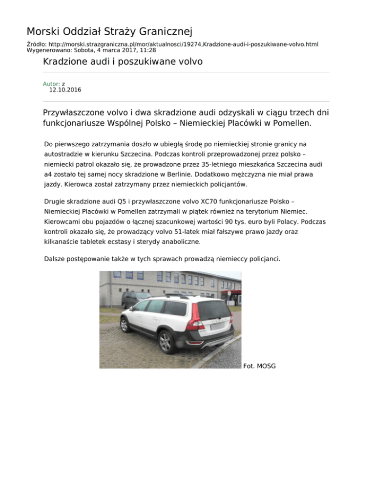 Morski Oddział Straży Granicznej Źródło: http://morski.strazgraniczna.pl/mor/aktualnosci/19274,Kradzione-audi-i-poszukiwane-volvo.html Wygenerowano: Sobota, 4 marca 2017, 11:28 Kradzione audi i poszukiwane volvo Autor: z 12.10.2016 Przywłaszczone volvo i dwa skradzione audi odzyskali w ciągu trzech dni funkcjonariusze Wspólnej Polsko – Niemieckiej Placówki w Pomellen. Do pierwszego zatrzymania doszło w ubiegłą środę po niemieckiej stronie granicy na autostradzie w kierunku Szczecina. Podczas kontroli przeprowadzonej przez polsko – niemiecki patrol okazało się, że prowadzone przez 35-letniego mieszkańca Szczecina audi a4 zostało tej samej nocy skradzione w Berlinie. Dodatkowo mężczyzna nie miał prawa jazdy. Kierowca został zatrzymany przez niemieckich policjantów. Drugie skradzione audi Q5 i przywłaszczone volvo XC70 funkcjonariusze Polsko – Niemieckiej Placówki w Pomellen zatrzymali w piątek również na terytorium Niemiec. Kierowcami obu pojazdów o łącznej szacunkowej wartości 90 tys. euro byli Polacy. Podczas kontroli okazało się, że prowadzący volvo 51-latek miał fałszywe prawo jazdy oraz kilkanaście tabletek ecstasy i sterydy anaboliczne. Dalsze postępowanie także w tych sprawach prowadzą niemieccy policjanci. Fot. MOSG