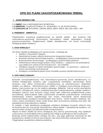 OPIS DO PLANU ZAGOSPODAROWANIA TERENU. 1. DANE EWIDENCYJNE: 1.1 OBIEKT: HALA WIDOWISKOWO-SPORTOWA 1.2 INWESTOR: GMINA RYCHWAŁ, PL. WOLNOŚCI 16, 62-570 RYCHWAŁ 1.3 LOKALIZACJA: RYCHWAŁ, DZIAŁKI 450/2; 450/3; 450/4; 452; 454; 465/1; 449 2. PRZEDMIOT INWESTYCJI. Przedmiotem inwestycji projektowanej na terenie działki jest budowa hali widowiskowo-sportowej stanowiącej samodzielny obiekt spełniający funkcję sportowo-kulturalną. Projektowany obiekt zlokalizowano od strony wschodniej istniejącej bieżni stadionu. 3. STAN ISTNIEJĄCY: Na teren działek podlegających opracowaniu znajdują się: • Stadion z trybunami i bieżnią • Nieużytkowy basen odkryty planowane zasypanie basenu • Budynek obsługi nieczynnego basenu – podlegający planowanej rozbiórce • Budynek klubu sportowego – podlegający planowanej rozbiórce • Infrastruktura nieczynnego basenu oraz stadionu – częściowo do przełożenia wg odrębnych opracowań branżowych – do rozbiórki • Istniejące wjazdy na teren kompleksu sportowego – ul. Sportowa – wjazd od strony zachodniej i południowej • Istniejące utwardzenia jezdni oraz chodnika postaci płytek betonowych 4. OPIS FUNKCJONALNY: Budynek nowoprojektowany hali widowiskowo-sportowej został zlokalizowany na terenie istniejącego stadionu jako uzupełnienie kompleksu sportowego. Bryła budynku oraz układ funkcjonalny podyktowane są urbanistycznym ułożeniem obiektu na działce. Wkomponowano obiekt w istniejącą komunikację drogową i pieszą. Usytuowano go na osi wejścia pieszego. Zbliżenie hali ze sceną zewnętrzną do bieżni i istniejących trybun podyktowane jest funkcjonalnością całego stadionu. Istniejące trybuny oraz murawa mogą służyć jako widownia projektowanej sceny zewnętrznej. Jednocześnie takie usytuowanie umożliwiło pozostawienie konstrukcji zakopanego basenu kąpielowego bez zmian. Naruszenie niecki basenowej spowodowałoby problemy konstrukcyjne oraz istotny wzrost kosztów realizacji. Ten wolny, ładny prostokątny teren może służyć jako tymczasowy parking oraz plac dla perspektywicznej rozbudowy obiektu. W związku z taką lokalizacją podlegają rozbiórce istniejące budynki, których stan techniczny jest zły oraz psują urbanistyczny układ działki – perspektywę stadionu. Ich remont byłby droższy niż pobudowanie nowej kubatury. Wjazd na teren działki od strony istniejącej ulicy (strony południowej). Przy obiekcie usytuowano nowoprojektowany parking oraz miejsce parkingowe dla autobusów. Budynek został maksymalnie cofnięty od ulicy, aby jego gabaryty stanowiły tło dla perspektywy działki od strony komunikacji i aby ekonomicznie wykorzystać teren. Ciągi piesze uzupełniono zielenią ozdobną. Obiekt wyposażony w podjazd dla osób niepełnosprawnych zlokalizowany przy wejściu głównym do hali widowiskowo-sportowej. 5. OPIS SZCZEGÓŁOWY ELEMENTÓW ZAGOSPODAROWANIA: 5.1 Parking dla samochodów osobowych, autobusów, przystanek dla autokau • • • • • • Parking prostopadły do ul. Sportowej – przewidziano jedno stanowisko dla osób niepełnosprawnych o wymiarach 3,6m x 5,5 m usytuowane w stosunku do drogi pod kątem 90°. Pozostałe miejsca parkingowe w ilości 9 o wymiarach 2,3 m x 5,0 m usytuowane wzdłuż pod kątem 90° o nawierzchni żwirowej. Parking przed halą sportową – 7 miejsc postojowych o wymiarach 2,3x5,5m Parking dla autobusów – 2 miejsca postojowe usytuowane prostopadle do ul. Sportowej o wymiarach 4,0x10,0m wykonać z koski betonowej gr. 8 cm ułożonej na warstwie 15 cm chudego betonu oraz podsypce piaskowej gr. 3cm. Zatoka – przystanek autobusowy – o wymiarach 4,0x10,0m wykonać z koski betonowej gr. 8 cm ułożonej na warstwie 15 cm chudego betonu oraz podsypce piaskowej gr. 3cm. Perspektywiczny teren pod parking dla samochodów osobowych – na zapleczu projektowanego parkingu Ponadto istniejący parking przy wjeździe na teren obiektów przy ul. Sportowej. 5.2 Dojścia piesze: • • Główne ciągi komunikacyjne piesze oraz dojścia projektuje się z kostki betonowa gr. 6 cm na warstwie 20 cm piasku zagęszczonego mechanicznie. Cześć dojść pieszych – wg planu zagospodarowania terenu projektuje się z nawierzchni żwirowej 5.3 Zasiek na śmietnik: • • • Plac o wymiarach 5,2x5,5m wyłożony kostką betonowa gr. 6 cm na warstwie 20 cm piasku zagęszczonego mechanicznie z odprowadzeniem wód opadowych. Teren ogrodzony siatką . Opłotowanie wysokość 1,5 m, słupki ogrodzenia o wymiarze 48x1,5 mm w rozstawie co około 2,5 m, Furtka wejściowa szerokości 1,2m. Wszystkie elementy ocynkowane. Wypełnienie z siatki ocynkowanej o oczkach 50x50 mm i gr. 2,5 mm. Teren opłotowany obsadzić żywopłotem – liguster złocisty z 3 stron. 5.5 Oświetlenie terenu : • Przewiduje się układ lamp parkowych oraz podświetlających elewację przy ciągach komunikacyjnych – układ i rodzaj lamp umieszczono na planie zagospodarowania terenu oraz ujęto w projekcie branży elektrycznej. 5.6 Teren utwardzony pod zbiorniki propan-butan : • Plac o wymiarach 7,35x8,0m wyłożony nawierzchnią żwirową na warstwie 15 cm piasku zagęszczonego mechanicznie. • • Teren ogrodzony siatką . Opłotowanie wysokość 2,0 m, słupki ogrodzenia o wymiarze 48x1,5 mm w rozstawie co około 2,5 m, Furtka wejściowa jednoskrzydłowa o szerokości 1,20m. Wszystkie elementy ocynkowane. Wypełnienie z siatki ocynkowanej o oczkach 50x50 mm i gr. 2,5 mm. Pod zbiorniki zaprojektowano płytę fundamentową wg obliczeń 6.0 ZESTAWIENIE POWIERZCHNIOWE: POWIERZCHNIA ZABUDOWY PROJEKTOWANEJ POWIERZCHNIA CIĄGÓW PIESZYCH , PLACÓW UTWARDZONYCH, PODESTÓW WEJŚCIOWYCH PARKING DLA SAMOCHODÓW OSOBOWYCH Z DOJAZDEM ZATOKA- PRZYSTANEK AUTOBUSOWY PARKING DLA AUTOBUSÓW Z DOJAZDEM ZAŚIEK NA ŚMIETNIK OGRODZONY TEREN NA ZBIORNIKI PROPAN-BUTAN 2024,70M2 1505,00 M2 7.0 PROJEKTOWANA INFRASTRUKTURA: • woda – istniejące przyłącze na terenie działki • ścieki socja