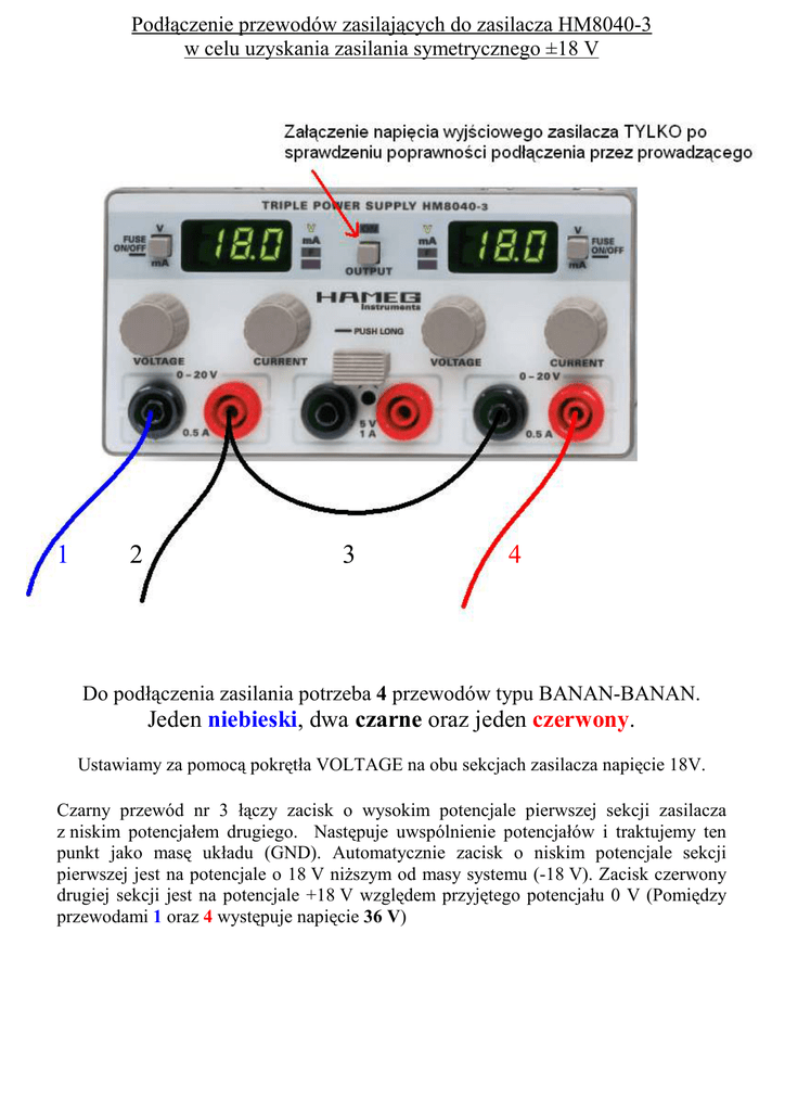 Podłączenie przewodów zasilających do zasilacza HM8040-3 w celu uzyskania zasilania symetrycznego ±18 V 1 2 3 4 Do podłączenia zasilania potrzeba 4 przewodów typu BANAN-BANAN. Jeden niebieski, dwa czarne oraz jeden czerwony. Ustawiamy za pomocą pokrętła VOLTAGE na obu sekcjach zasilacza napięcie 18V. Czarny przewód nr 3 łączy zacisk o wysokim potencjale pierwszej sekcji zasilacza z niskim potencjałem drugiego. Następuje uwspólnienie potencjałów i traktujemy ten punkt jako masę układu (GND). Automatycznie zacisk o niskim potencjale sekcji pierwszej jest na potencjale o 18 V niŜszym od masy systemu (-18 V). Zacisk czerwony drugiej sekcji jest na potencjale +18 V względem przyjętego potencjału 0 V (Pomiędzy przewodami 1 oraz 4 występuje napięcie 36 V)