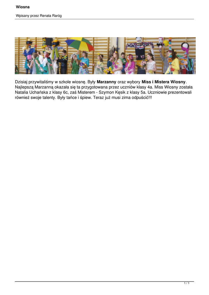 Wiosna Wpisany przez Renata Raróg Dzisiaj przywitaliśmy w szkole wiosnę. Były Marzanny oraz wybory Miss i Mistera Wiosny. Najlepszą Marzanną okazała się ta przygotowana przez uczniów klasy 4a. Miss Wiosny została Natalia Uchańska z klasy 6c, zaś Misterem - Szymon Kęsik z klasy 5a. Uczniowie prezentowali również swoje talenty. Były tańce i śpiew. Teraz już musi zima odpuścić!!! 1/1