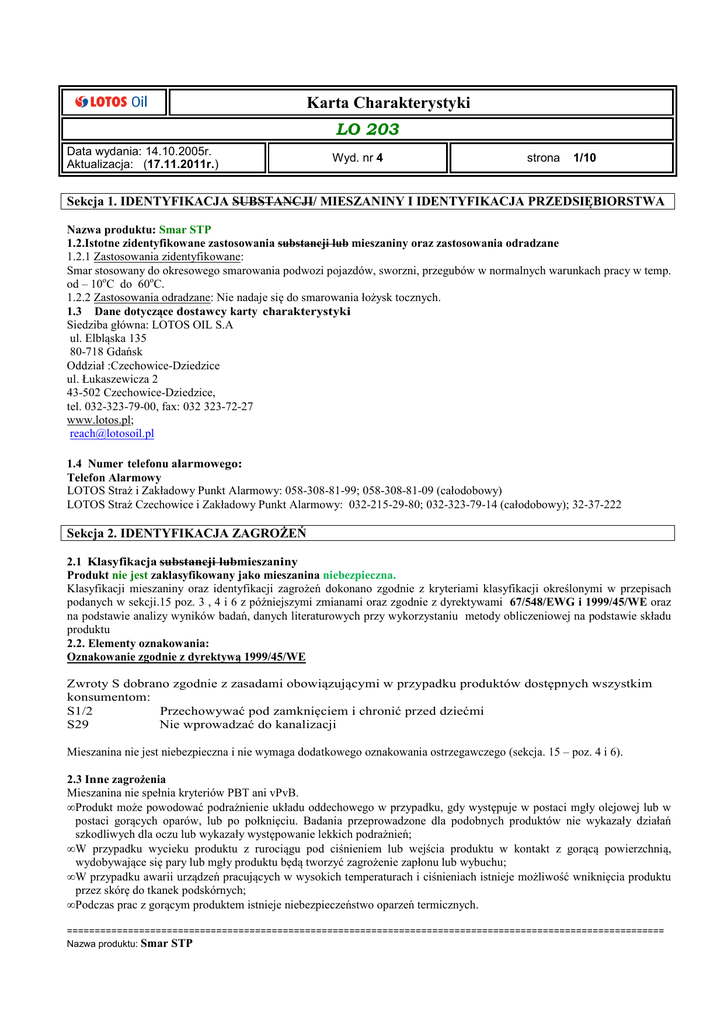 Karta Charakterystyki LO 203 Data wydania: 14.10.2005r. Aktualizacja: (17.11.2011r.) Wyd. nr 4 strona 1/10 Sekcja 1. IDENTYFIKACJA SUBSTANCJI/ MIESZANINY I IDENTYFIKACJA PRZEDSIĘBIORSTWA Nazwa produktu: Smar STP 1.2.Istotne zidentyfikowane zastosowania substancji lub mieszaniny oraz zastosowania odradzane 1.2.1 Zastosowania zidentyfikowane: Smar stosowany do okresowego smarowania podwozi pojazdów, sworzni, przegubów w normalnych warunkach pracy w temp. od – 10oC do 60oC. 1.2.2 Zastosowania odradzane: Nie nadaje się do smarowania łożysk tocznych. 1.3 Dane dotyczące dostawcy karty charakterystyki Siedziba główna: LOTOS OIL S.A ul. Elbląska 135 80-718 Gdańsk Oddział :Czechowice-Dziedzice ul. Łukaszewicza 2 43-502 Czechowice-Dziedzice, tel. 032-323-79-00, fax: 032 323-72-27 www.lotos.pl; [email protected] 1.4 Numer telefonu alarmowego: Telefon Alarmowy LOTOS Straż i Zakładowy Punkt Alarmowy: 058-308-81-99; 058-308-81-09 (całodobowy) LOTOS Straż Czechowice i Zakładowy Punkt Alarmowy: 032-215-29-80; 032-323-79-14 (całodobowy); 32-37-222 Sekcja 2. IDENTYFIKACJA ZAGROŻEŃ 2.1 Klasyfikacja substancji lubmieszaniny Produkt nie jest zaklasyfikowany jako mieszanina niebezpieczna. Klasyfikacji mieszaniny oraz identyfikacji zagrożeń dokonano zgodnie z kryteriami klasyfikacji określonymi w przepisach podanych w sekcji.15 poz. 3 , 4 i 6 z późniejszymi zmianami oraz zgodnie z dyrektywami 67/548/EWG i 1999/45/WE oraz na podstawie analizy wyników badań, danych literaturowych przy wykorzystaniu metody obliczeniowej na podstawie składu produktu 2.2. Elementy oznakowania: Oznakowanie zgodnie z dyrektywą 1999/45/WE Zwroty S dobrano zgodnie z zasadami obowiązującymi w przypadku produktów dostępnych wszystkim konsumentom: S1/2 Przechowywać pod zamknięciem i chronić przed dziećmi S29 Nie wprowadzać do kanalizacji Mieszanina nie jest niebezpieczna i nie wymaga dodatkowego oznakowania ostrzegawczego (sekcja. 15 – poz. 4 i 6). 2.3 Inne zagrożenia Mieszanina nie spełnia kryteriów PBT ani vPvB. • Produkt może powodować podrażnienie układu oddechowego w przypadku, gdy występuje w postaci mgły olejowej lub w postaci gorących oparów, lub po połknięciu. Badania przeprowadzone dla podobnych produktów nie wykazały działań szkodliwych dla oczu lub wykazały występowanie lekkich podrażnień; • W przypadku wycieku produktu z rurociągu pod ciśnieniem lub wejścia produktu w kontakt z gorącą powierzchnią, wydobywające się pary lub mgły produktu będą tworzyć zagrożenie zapłonu lub wybuchu; • W przypadku awarii urządzeń pracujących w wysokich temperaturach i ciśnieniach istnieje możliwość wniknięcia produktu przez skórę do tkanek podskórnych; • Podczas prac z gorącym produktem istnieje niebezpieczeństwo oparzeń termicznych. ============================================================================================================ Nazwa produktu: Smar STP Karta Charakterystyki LO 203 Data wydania: 14.10.2005r. Aktualizacja: (17.11.2011r.) Wyd. nr 4 strona 2/10 Sekcja 3. SKŁAD / INFORMACJA O SKŁADNIKACH Mieszanina olejów bazowych i dodatków uszlachetniających. Niebezpieczne składniki, zakresy ich stężeń w mieszaninie i numery klasyfikacyjne: nie dotyczy Sekcja 4. ŚRODKI PIERWSZEJ POMOCY Zalecenia ogólne W każdym z poniższej podanych przypadków postępowania, gdy zaburzenia nie ustępują, należy natychmiast wezwać lekarza lub odwieźć poszkodowanego do szpitala, pokazać opakowanie produktu lub etykietę. Jeżeli poszkodowany jest nieprzytomny, nie podawać niczego doustnie i ułożyć go w pozycji bocznej ustalonej. Zapewnić poszkodowanemu spokój, kontrolować jego oddech i puls. Jeżeli poszkodowany jest przytomny, nie podawać mu mleka, tłuszczu, alkoholu. W każdym przypadku szczegółowym postępować jak opisano poniżej. Po wdychaniu Jeśli obserwuje się szkodliwy wpływ oparów na poszkodowanego, należy wyprowadzić lub wynieść go z zagrożonego miejsca na świeże powietrze. Zdjąć zanieczyszczoną odzież. Zapewnić poszkodowanemu spokój i ciepło (okryć kocami). Kontrolować jego oddech i tętno. Przy występowaniu zaburzeń w oddychaniu podawać tlen. W przypadku zatrzymania oddechu stosować sztuczne oddychanie za pomocą aparatu AMBU, po uprzednim oczyszczeniu jamy ustnej z ciał obcych i śluzu. Jeżeli stanie się to konieczne, wykonać masaż serca. W przypadku kontaktu ze skórą Zdjąć zanieczyszczoną odzież. Miejsce kontaktu, a w razie potrzeby całe ciało, należy dokładnie umyć wodą z mydłem, o ile nie ma oparzeń gorącym produktem. Do mycia nie wolno używać rozpuszczalników organicznych takich jak: nafta, lekkie destylaty czy benzyna. W przypadku kontaktu gorącego produktu ze skórą oparzone miejsce należy natychmiast zanurzyć w zimnej wodzie lub poddawać działaniu strumienia bieżącej zimnej wody, przez co najmniej 10 minut. Jeśli produkt wniknął pod ciśnieniem do tkanek podskórnych, należy natychmiast udzielić poszkodowanemu pomocy medycznej. Po dostaniu się do oczu Natychmiast zdjąć szkła kontaktowe i przemywać oczy dużą ilością wody, przez co najmniej 15 min. (przy odwiniętych powiekach). W przypadku zanieczyszczenia tylko jednego oka - drugie chronić przed zanieczyszczeniem w trakcie przemywania. Unikać silnego strumienia wody ze względu na ryzyko uszkodzenia rogówki. Uwaga! Osoby narażone na skażenie oczu powinny być pouczone o konieczności i sposobie ich natychmiastowego płukania. Po połknięciu Nie należy wywoływać wymiotów, gdyż istnieje możliwość przedostania się produktu do dróg oddechowych, co może powodować zachłystowe zapalenie płuc, a to wymaga natychmiastowego leczenia. W przypadku zanieczyszczenia jamy ustnej wypłukać ją dokładnie wodą, aż zniknie smak produktu. Jeżeli poszkodowany jest przytomny, podać mu 1 szklankę płynnej parafiny do wypicia. W przypadku wystąpienia wymiotów położyć poszkodowane