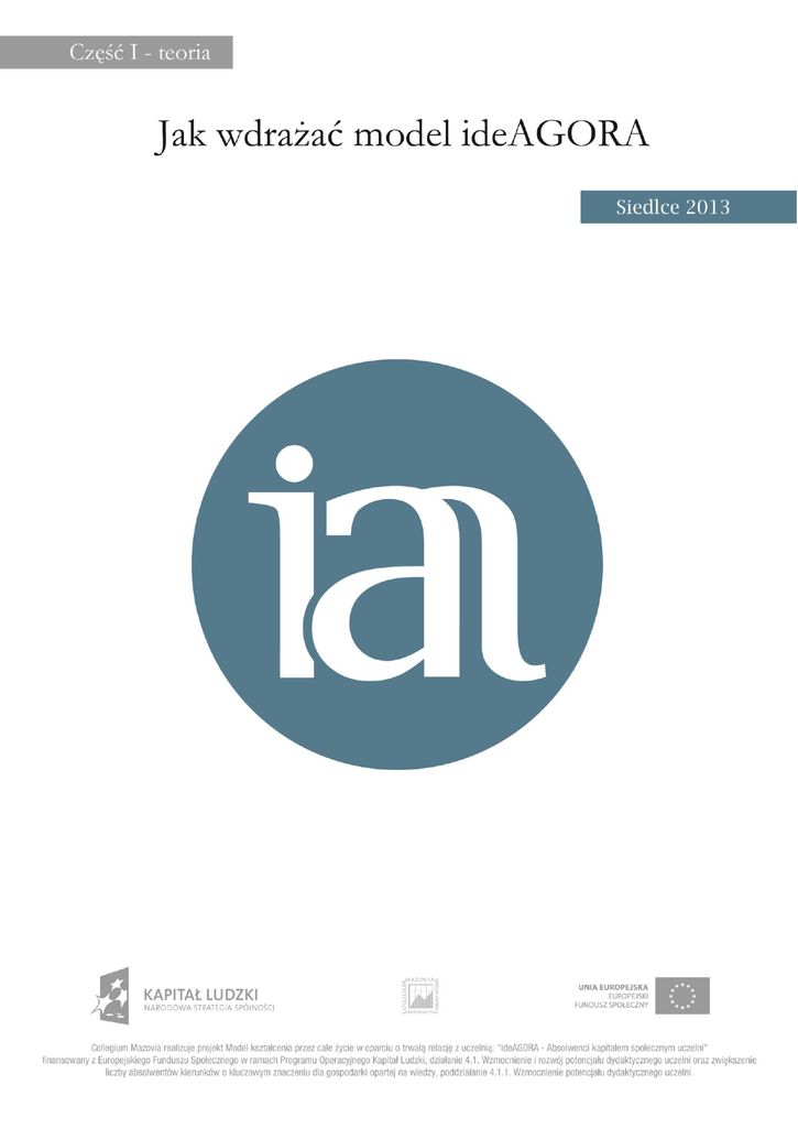 ZESPÓŁ REDAKCYJNY: prof. dr hab. Andrzej Rabczenko dr Katarzyna Sadowy dr Konrad Maj dr Tomasz Tomaszewicz dr Viacheslaw Stetsko Mariusz Szabłowski Agata Bona M. Lucjan Paszkiewicz Małgorzata Szymaniuk-Kruk Alicja Szabłowska Urszula Paczuska STRONA - 2 SPIS TREŚCI Wstęp 5 Rozdział I Dlaczego ideAGORA? 7 1. Absolwenci kapitałem społecznym uczelni 7 2. Idea 8 3. Jak działa ideAGORA 10 Rozdział II Problemy współczesnego szkolnictwa wyższego 13 1. Uczelnia obecna – Polska, UE 14 2. Uniwersytet XXI wieku 23 Rozdział III Scenariusze przyszłości szkolnictwa wyższego 30 1. Analiza szkolnictwa w krajach wysokorozwiniętych (Finlandia, USA) 30 2. Wyzwania przyszłości 39 3. Scenariusze rozwoju szkolnictwa wyższego w Polsce 40 Rozdział IV Wyzwania ideAGORY 47 1. Model kształcenia się przez całe życie w oparciu o uczelnię 47 2. Otwarty dostęp do wiedzy (na uczelni, wiedzy P2P) 56 3. Zmiana społecznej roli uczelni 61 4. Monitoring absolwentów dla poprawy oferty edukacyjnej (relacja dwustronna absolwenci dla uczelni, uczelnia dla absolwentów) 71 5. Wsparcie absolwentów w kształceniu praktycznym (adepci zawodu w relacji mistrzuczeń) 75 Rozdział V ideAGORA jako organizacja ucząca się 83 1. Myślenie systemowe 83 2. Mistrzostwo osobiste 87 3. Modele myślowe 87 STRONA - 3 4. Wspólna wizja 88 5. Zespołowe uczenie się 89 Rozdział VI Sieci społeczne: bezpośrednie, wirtualne i związane z uczelnią 92 1. Heterogeniczność a sieci społeczne 92 2. Sieci społeczne i ich moc 94 3. Sieć społeczna w Internecie 98 4. Uczelnia wyższa a sieć społeczna 100 5. ideAGORA jako archipelag 101 Rozdział VII Kompetencje XXI wieku a ideAGORA 103 1. Charakterystyka kompetencji XXI wieku 103 2. Kompetencje przyszłości a ideAGORA 111 Rozdział VIII Budowanie trwałych relacji z uczelnią – wyniki badań 113 1. Potrzeby studentów a więź z uczelnią 113 2. Potrzeby absolwentów a więź z uczelnią 115 Rozdział IX Wdrażanie innowacyjnego modelu kształcenia przez całe życie ideAGORA 118 1. Innowacyjne programy kształcenia dla studentów, absolwentów i nauczycieli 118 2. Szkolenia na start – program szkoleniowy dla absolwentów 126 3. Platforma ideAGORA 135 3.1 Co się dzieje w sieci? 135 3.2 Jak działa platforma ideAGORA 138 3.3 Co daje sieć ideAGORA. Istota samorozwoju sieci 139 4. Klub Absolwenta 142 5. Gazetka internetowa 144 6. Kwartalnik ideAGORA 146 7. Spodziewane efekty wdrożenia modelu ideAGORA 147 8. Analiza ryzyka 148 STRONA - 4 Wstęp mgr inż. arch. Mariusz Szabłowski Koncepcję modelu ideAGORA oraz zestaw narzędzi do jego budowy opracowano w Collegium Mazovia w ramach projektu innowacyjnego testującego pod tytułem Model kształcenia przez całe życie w oparciu o trwałą relację z uczelnią: "ideAGORA - absolwenci kapitałem społecznym uczelni". Celem niniejszego opracowania jest wyjaśnienie istoty modelu ideAGORA oraz ułatwienie zainteresowanym uczelniom wdrażania go w życie. Podręcznik wyjaśnia istotę modelu, podłoże jego powstania, zawiera opisy poszczególnych składników stanowiących narzędzia do jego budowy oraz zasady ich stosowania. Głównymi narzędziami są programy kształcenia, program szkoleń, skrypt Jak współpracować absolwentami, kwartalnik uczelni wraz z biuletynem internetowym, klub absolwenta oraz platforma społecznościowa. Należy jednak podkreślić, że ani dobór narzędzi, ani stosowanie ich według przedstawionej recepty nie są istotą ideAGORY. Celem jest zbudowanie aktywnej społeczności absolwentów, działającej na rzecz uczelni, i autorzy mają świadomość, że dróg do osiągnięcia tego celu może być wiele. Przy tym cel także nie ma z góry określonego kształtu ideAGORA jest wynikiem interakcji sieci społecznej i przez to dostosowuje się do potrzeb członków społeczności. Ponieważ ideAGORA jest organizacją uczącą się, miarą sukcesu jest jej zdolność do reakcji na zmienne i bieżące oczekiwania uczestników. Proponowana koncepcja opiera się na logice budowy sieci społecznej - wykształceniu liderów zmian, których zadaniem będzie kształtowanie postaw i umiejętności przyszłych absolwentów, potrafiących osiągać własne korzyści poprzez dzielenie się z innymi członkami społeczności. Właśnie te osobiste korzyści, wynikające z aktywności na rzecz społeczności zgromadzonej wokół uczelni, będą kołem zamachowym ideAGORY. Wdrożenie modelu jest niczym innym jak wprawieniem w ruch tego koła zamachowego. Nie wolno przy tym zapomnieć o zasadach mechaniki - im większe koło zamachowe, tym trudniej je rozpędzić. Model ideAGORA nie zakłada, że to metaforyczne koło zamachowe będzie rozpędzane szybko i z wielką mocą. Nawet niewielka siła oddziałująca długotrwale, systematycznie i w jednym kierunku może dać zadziwiające efekty. Ta filozofia stoi u podstaw modelu. Zaangażowanie społeczne dawnych absolwentów dałoby natychmiast widoczne rezultaty, ale wymagałoby ogromnych wysiłków ze strony uczelni. Kształcenie studentów jako przyszłych zaangażowanych absolwentów jest bardziej efektywne - niestety, na rezultaty trzeba poczekać. Przyjęta w modelu proporcja nakładów na zmianę postaw obecnych i przyszłych absolwentów jest próbą poszukiwania złotego środka, a przy tym pozwala przy pomocy najbardziej aktywnych absolwentów zbudować STRONA - 5 ideAGORĘ już dziś, w mniejszej niż docelowa skali, ale realną, funkcjonującą i przynoszącą sieciowe korzyści jej uczestnikom. Przedstawiana wersja podręcznika jest wynikiem prac zespołu projektowego na etapie przygotowania innowacji do testowania. Przyjęte zadanie okazało się znacznie bardziej złożone, niż można było się spodziewać przy tworzeniu koncepcji ideAGORY. Budowanie postaw i skłonienie ludzi do aktywności na rzecz licznej grupy społecznej, przy założeniu samofinansowania się tego mechanizmu poprzez korzyści osiągane w wyniku współpracy sieciowej