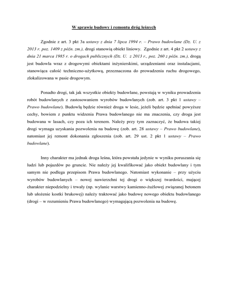 W sprawie budowy i remontu dróg leśnych Zgodnie z art. 3 pkt 3a ustawy z dnia 7 lipca 1994 r. – Prawo budowlane (Dz. U. z 2013 r. poz. 1409 z późn. zm.), drogi stanowią obiekt liniowy. Zgodnie z art. 4 pkt 2 ustawy z dnia 21 marca 1985 r. o drogach publicznych (Dz. U. z 2013 r., poz. 260 z późn. zm.), drogą jest budowla wraz z drogowymi obiektami inżynierskimi, urządzeniami oraz instalacjami, stanowiąca całość techniczno-użytkową, przeznaczona do prowadzenia ruchu drogowego, zlokalizowana w pasie drogowym. Ponadto drogi, tak jak wszystkie obiekty budowlane, powstają w wyniku prowadzenia robót budowlanych z zastosowaniem wyrobów budowlanych (zob. art. 3 pkt 1 ustawy – Prawo budowlane). Budowlą będzie również droga w lesie, jeżeli będzie spełniać powyższe cechy, bowiem z punktu widzenia Prawa budowlanego nie ma znaczenia, czy droga jest budowana w lasach, czy poza ich terenem. Należy przy tym zaznaczyć, że budowa takiej drogi wymaga uzyskania pozwolenia na budowę (zob. art. 28 ustawy – Prawo budowlane), natomiast jej remont dokonania zgłoszenia (zob. art. 29 ust. 2 pkt 1 ustawy – Prawo budowlane). Inny charakter ma jednak droga leśna, która powstała jedynie w wyniku poruszania się ludzi lub pojazdów po gruncie. Nie należy jej kwalifikować jako obiekt budowlany i tym samym nie podlega przepisom Prawa budowlanego. Natomiast wykonanie – przy użyciu wyrobów budowlanych – nowej nawierzchni tej drogi o większej twardości, mającej charakter niepodzielny i trwały (np. wylanie warstwy kamienno-żużlowej związanej betonem lub ułożenie kostki brukowej) należy traktować jako budowę nowego obiektu budowlanego (drogi – w rozumieniu Prawa budowlanego) wymagającą pozwolenia na budowę.