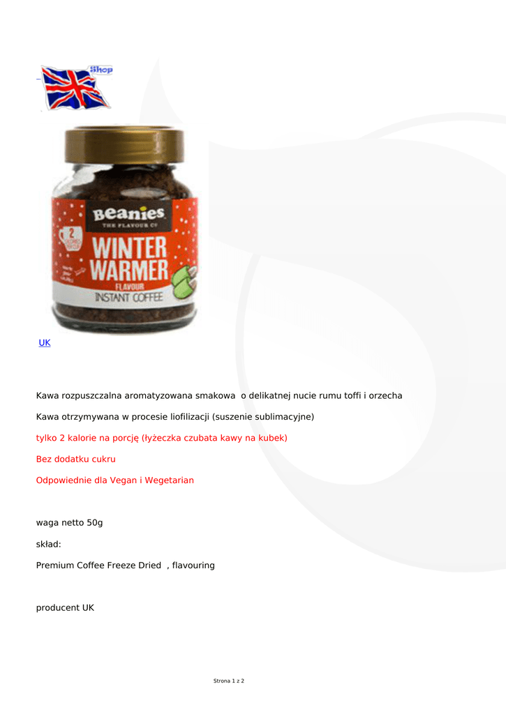 UK Kawa rozpuszczalna aromatyzowana smakowa o delikatnej nucie rumu toffi i orzecha Kawa otrzymywana w procesie liofilizacji (suszenie sublimacyjne) tylko 2 kalorie na porcję (łyżeczka czubata kawy na kubek) Bez dodatku cukru Odpowiednie dla Vegan i Wegetarian waga netto 50g skład: Premium Coffee Freeze Dried , flavouring producent UK Strona 1 z 2 Strona 2 z 2