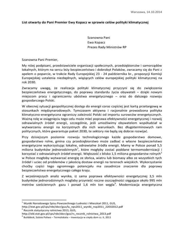 Warszawa, 14.10.2014 List otwarty do Pani Premier Ewy Kopacz w sprawie celów polityki klimatycznej Szanowna Pani Ewa Kopacz Prezes Rady Ministrów RP Szanowna Pani Premier, My niżej podpisani, przedstawiciele organizacji społecznych, przedsiębiorców i samorządów lokalnych, którym na sercu leży bezpieczeństwo i dobrobyt Polaków, zwracamy się do Pani z apelem o poparcie, w trakcie Rady Europejskiej 23 - 24 października br., propozycji Komisji Europejskiej ustalenia niezbędnych, wiążących celów europejskiej polityki klimatycznej na rok 2030. Zwracamy uwagę, że realizacja polityki klimatycznej przyczyni się do zwiększenia bezpieczeństwa energetycznego, do poprawy standardu życia obywateli – dzięki nowym miejscom pracy i ograniczeniu ubóstwa energetycznego – oraz do dalszego rozwoju gospodarczego Polski. W obecnej sytuacji geopolitycznej dostęp do energii coraz częściej jest kartą przetargową w stosunkach międzynarodowych. Tymczasem aktywna i racjonalnie prowadzona polityka klimatyczno-energetyczna ograniczy zależność Polski od importu surowców energetycznych. Ważną rolę w osiągnięciu tego celu może mieć poprawa efektywności energetycznej i rozwój odnawialnych źródeł energii, szczególnie, jeśli umożliwimy obywatelom współudział w wytwarzaniu energii na korzystnych dla nich warunkach. Bez długoterminowych ram politycznych, które gwarantuje pakiet 2030, te sektory nie będą się dobrze rozwijać. Przy dzisiejszym poziomie rozwoju technologicznego każde gospodarstwo domowe, gospodarstwo rolne, gmina czy przedsiębiorstwo może zadbać o własne bezpieczeństwo energetyczne wykorzystując lokalne, odnawialne źródła energii. Mamy w Polsce ponad 5,5 miliona budynków jednorodzinnych1, które mogłyby zostać poddane termomodernizacji i korzystać z odnawialnych źródeł energii. Większość z blisko 1,5 miliona gospodarstw rolnych2 w Polsce mogłoby wytwarzać energię ze słońca, wiatru lub biomasy albo ze wszystkich tych źródeł i uciec od problemów z jakością dostaw energii na terenach wiejskich. Wykorzystanie choćby części tego ogromnego potencjału ma zasadnicze znaczenie dla poprawy bezpieczeństwa energetycznego całego kraju. Z wcześniejszych analiz wynika, iż sama poprawa efektywności energetycznej 3,5 mln budynków jednorodzinnych mogłaby przynieść roczne oszczędności sięgające około 995 mln metrów sześciennych gazu i ponad 1,6 mln ton węgla3. Modernizacja energetyczna 1 Wyniki Narodowego Spisu Powszechnego Ludności i Mieszkań 2011, GUS, http://stat.gov.pl/cps/rde/xbcr/gus/lu_nps2011_wyniki_nsp2011_22032012.pdf 2 Rocznik statystyczny rolnictwa 2013, GUS, http://old.stat.gov.pl/cps/rde/xbcr/gus/rs_rocznik_rolnictwa_2013.pdf 3 Builddesk, Szóste Paliwo – Termolokata – Inwestycja w ciepły dom cz. II, 2011 budynków wpłynęłaby na poprawę standardu życia Polaków. To, że 75% budynków jest w Polsce niedocieplonych, ma największy wpływ na ubóstwo energetyczne4. Polityka klimatyczna to rozwój małych i średnich przedsiębiorstw, działających w innowacyjnych sektorach zielonej gospodarki: efektywności energetycznej, energetyki obywatelskiej i usług ekosystemowych. Dzięki niej Polska może stać się krajem atrakcyjnym dla ludzi młodych, którzy nie byliby zmuszeni szukać pracy zagranicą. Wzrosnąć może też potencjał ekonomiczny najsłabszych gospodarczo obszarów peryferyjnych. W perspektywie roku 2030, tylko dzięki rozwojowi sektora odnawialnych źródeł energii, w Polsce mogłoby powstać ponad 100 tys. nowych miejsc pracy5. Polityka klimatyczna może być motorem dobrobytu w Polsce. Koszty poniesione na początku procesu jej wdrażania są niskie w porównaniu do korzyści: dla bezpieczeństwa energetycznego, poprawy stanu środowiska i zdrowia obywateli. Nie są one też wcale wyższe od kosztów utrzymywania obecnego systemu energetycznego. Ponadto, wyliczenia Warszawskiego Instytutu Studiów Ekonomicznych, Karajowej Agencji Poszanowania Energii S.A. i Instytutu na rzecz Ekorozwoju wskazują, że dzięki wynikającej z polityki klimatycznej poprawie efektywności wykorzystania zasobów i innowacyjności polskie PKB w roku 2050 mogłoby być aż o 3,5% wyższe6. Musimy pamiętać także o tym, że zmiany klimatu stanowią poważne zagrożenie dla gospodarczego i społecznego rozwoju Polski. Zarejestrowane straty przypisywane zmianom klimatu powstałe w Polsce w latach 2001-2010 wynosiły ok. 54 mld zł. W przypadku niepodjęcia działań adaptacyjnych w przyszłości, prawdopodobną konsekwencją mogą być straty szacowane na poziomie około 86 mld zł do roku 2020, oraz dodatkowo 119 mld zł w latach 2021-20307. Poniosą je wszyscy obywatele naszego kraju, doświadczając skutków gwałtownych zjawisk pogodowych, takich jak huraganowe wiatry, gradobicia, powodzie czy susze. Nie możemy dłużej ignorować faktu, że rozwój oparty na spalaniu paliw kopalnych pociąga za sobą ogromne koszty, a co ważniejsze, także ludzkie tragedie. Mamy nadzieje, że podejmując decyzję co do przyszłości unijnej polityki klimatycznej, weźmie Pani pod uwagę korzyści dla Polski, które towarzyszą redukcji emisji gazów cieplarnianych. Z wyrazami szacunku, Przedstawiciele organizacji społecznych, przedsiębiorców i samorządów: Urszula Stefanowicz, Rzecznik ds. politycznych Koalicji Klimatycznej Stefan Kamiński, Prezes Krajowa Izba Gospodarcza Elektroniki i Telekomunikacji 4 Niskoemisyjna Polska 2050, jw. Greenpeace, Rewolucja energetyczna dla Polski, Warszawa 2013 6 WISE, InE, Niskoemisyjna Polska 2050, Warszawa 2013 5 7 Strategiczny plan adaptacji dla sektorów i obszarów wrażliwych na zmiany klimatu do roku 2020 z perspektywą do roku 2030 François-Xavier Moser, Prezes Grupy Saint-Gobain Polska, Rumunia, Bułgaria Zbigniew Szpak, Prezes Zarządu, Krajowa Agencja Poszanowania Energii S.A. Edmund Wach, Prezes Zarządu, Bałtycka Agencja Poszanowania Energii Wojciech Cetnars