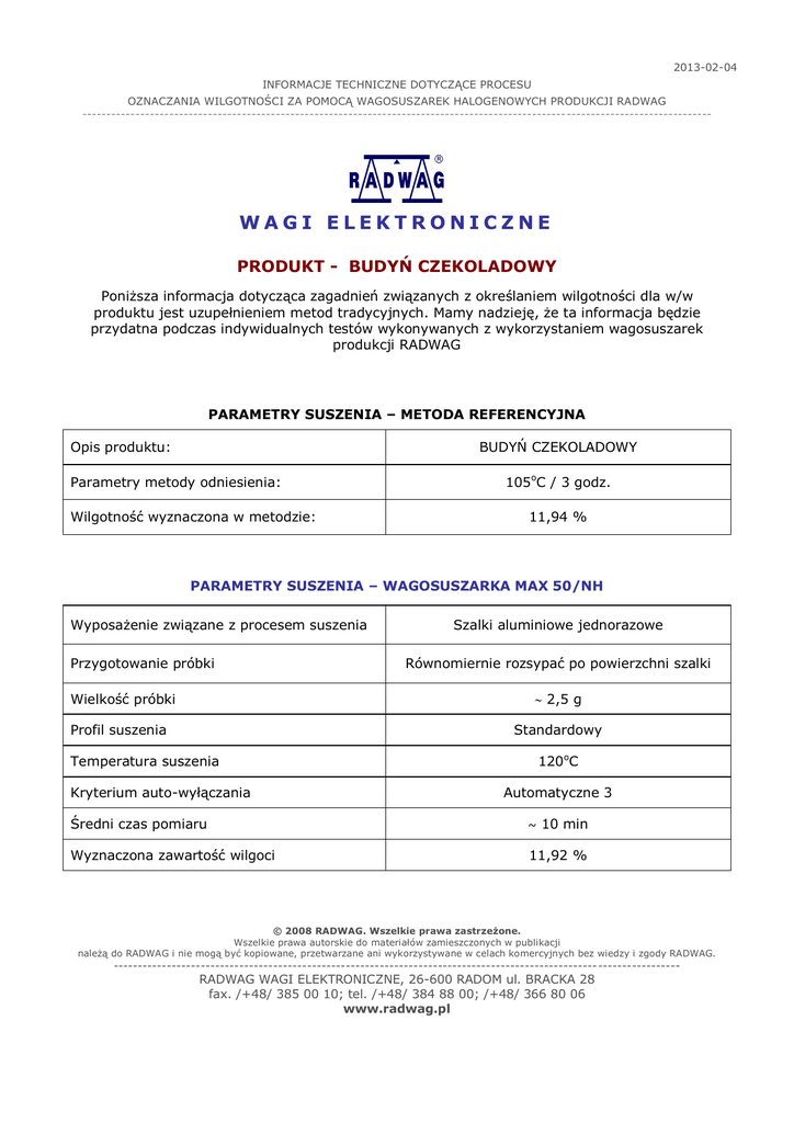 2013-02-04 INFORMACJE TECHNICZNE DOTYCZĄCE PROCESU OZNACZANIA WILGOTNOŚCI ZA POMOCĄ WAGOSUSZAREK HALOGENOWYCH PRODUKCJI RADWAG ---------------------------------------------------------------------------------------------------------------------------------- WAGI ELEKTRONICZNE PRODUKT - BUDYŃ CZEKOLADOWY Poniższa informacja dotycząca zagadnień związanych z określaniem wilgotności dla w/w produktu jest uzupełnieniem metod tradycyjnych. Mamy nadzieję, że ta informacja będzie przydatna podczas indywidualnych testów wykonywanych z wykorzystaniem wagosuszarek produkcji RADWAG PARAMETRY SUSZENIA – METODA REFERENCYJNA Opis produktu: BUDYŃ CZEKOLADOWY Parametry metody odniesienia: Wilgotność wyznaczona w metodzie: 105oC / 3 godz. 11,94 % PARAMETRY SUSZENIA – WAGOSUSZARKA MAX 50/NH Wyposażenie związane z procesem suszenia Przygotowanie próbki Wielkość próbki Szalki aluminiowe jednorazowe Równomiernie rozsypać po powierzchni szalki 2,5 g Profil suszenia Standardowy 120oC Temperatura suszenia Kryterium auto-wyłączania Automatyczne 3 Średni czas pomiaru ~ 10 min Wyznaczona zawartość wilgoci 11,92 % © 2008 RADWAG. Wszelkie prawa zastrzeżone. Wszelkie prawa autorskie do materiałów zamieszczonych w publikacji należą do RADWAG i nie mogą być kopiowane, przetwarzane ani wykorzystywane w celach komercyjnych bez wiedzy i zgody RADWAG. --------------------------------------------------------------------------------------------------------------------- RADWAG WAGI ELEKTRONICZNE, 26-600 RADOM ul. BRACKA 28 fax. /+48/ 385 00 10; tel. /+48/ 384 88 00; /+48/ 366 80 06 www.radwag.pl