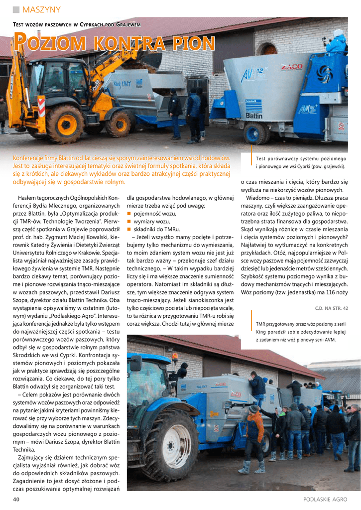 MASZYNY Test wozów paszowych w C yprkach pod Grajewem Poziom kontra pion Konferencje firmy Blattin od lat cieszą się sporym zainteresowaniem wśród hodowców. Jest to zasługa interesującej tematyki oraz świetnej formuły spotkania, która składa się z krótkich, ale ciekawych wykładów oraz bardzo atrakcyjnej części praktycznej odbywającej się w gospodarstwie rolnym. Hasłem tegorocznych Ogólnopolskich Konferencji Bydła Mlecznego, organizowanych przez Blattin, była „Optymalizacja produkcji TMR-ów. Technologie Tworzenia”. Pierwszą część spotkania w Grajewie poprowadził prof. dr. hab. Zygmunt Maciej Kowalski, kierownik Katedry Żywienia i Dietetyki Zwierząt Uniwersytetu Rolniczego w Krakowie. Specjalista wyjaśniał najważniejsze zasady prawidłowego żywienia w systemie TMR. Następnie bardzo ciekawy temat, porównujący poziome i pionowe rozwiązania tnąco-mieszające w wozach paszowych, przedstawił Dariusz Szopa, dyrektor działu Blattin Technika. Oba wystąpienia opisywaliśmy w ostatnim (lutowym) wydaniu „Podlaskiego Agro”. Interesująca konferencja jednakże była tylko wstępem do najważniejszej części spotkania – testu porównawczego wozów paszowych, który odbył się w gospodarstwie rolnym państwa Skrodzkich we wsi Cyprki. Konfrontacja systemów pionowych i poziomych pokazała jak w praktyce sprawdzają się poszczególne rozwiązania. Co ciekawe, do tej pory tylko Blattin odważył się zorganizować taki test. – Celem pokazów jest porównanie dwóch systemów wozów paszowych oraz odpowiedź na pytanie: jakimi kryteriami powinniśmy kierować się przy wyborze tych maszyn. Zdecydowaliśmy się na porównanie w warunkach gospodarczych wozu pionowego z poziomym – mówi Dariusz Szopa, dyrektor Blattin Technika. Zajmujący się działem technicznym specjalista wyjaśniał również, jak dobrać wóz do odpowiednich składników paszowych. Zagadnienie to jest dosyć złożone i podczas poszukiwania optymalnej rozwiązań 40 dla gospodarstwa hodowlanego, w głównej mierze trzeba wziąć pod uwagę: pojemność wozu, wymiary wozu, składniki do TMRu. – Jeżeli wszystko mamy pocięte i potrzebujemy tylko mechanizmu do wymieszania, to moim zdaniem system wozu nie jest już tak bardzo ważny – przekonuje szef działu technicznego. – W takim wypadku bardziej liczy się i ma większe znaczenie sumienność operatora. Natomiast im składniki są dłuższe, tym większe znaczenie odgrywa system tnąco-mieszający. Jeżeli sianokiszonka jest tylko częściowo pocięta lub niepocięta wcale, to ta różnica w przygotowaniu TMR-u robi się coraz większa. Chodzi tutaj w głównej mierze || Test porównawczy systemu poziomego i pionowego we wsi Cyprki (pow. grajewski). o czas mieszania i cięcia, który bardzo się wydłuża na niekorzyść wozów pionowych. Wiadomo – czas to pieniądz. Dłuższa praca maszyny, czyli większe zaangażowanie operatora oraz ilość zużytego paliwa, to niepotrzebna strata finansowa dla gospodarstwa. Skąd wynikają różnice w czasie mieszania i cięcia systemów poziomych i pionowych? Najłatwiej to wytłumaczyć na konkretnych przykładach. Otóż, najpopularniejsze w Polsce wozy paszowe mają pojemność zazwyczaj dziesięć lub jedenaście metrów sześciennych. Szybkość systemu poziomego wynika z budowy mechanizmów tnących i mieszających. Wóz poziomy (tzw. jedenastka) ma 116 noży || C.D. NA STR. 42 TMR przygotowany przez wóz poziomy z serii King poradził sobie zdecydowanie lepiej z zadaniem niż wóź pionowy serii AVM. PODLASKIE AGRO MASZYNY C.D. ZE STR. 40 i 116 przeciwnoży, czyli każdy nóż ma swój przeciwnóż. Natomiast każdy wóź pionowy o zbliżonej pojemności (np. dziesiątka) ma, w zależności od producenta, od ośmiu do dziesięciu noży i tylko dwa przeciwnoże. Dlatego w mechanizmach pionowych cięcie produktów paszowych trwa znacznie dłużej. – Przez to, że cięcie w wozach pionowych trwa bardzo długo, to ten TMR jest „zmęczony”. Zasada jest taka, że im się coś dłużej miesza, to robi nam się tzw. papka. Hodowcy mówią, że przygotowanie TMR-u w wozie pionowym zajmuje od 40 do 60 minut. Natomiast w naszych wozach poziomych jesteśmy w stanie przygotować całkowicie wymieszaną dawkę w czasie nieprzekraczającym 20 minut. Wówczas TMR sprawia wrażenie napowietrzonego – wyjaśnia Dariusz Szopa. Łatwo policzyć, że dwukrotne skrócenie czasu, to dwukrotnie mniejsze spalanie paliwa. To również mniejsze zaangażowanie operatora, który może w tym czasie wykonywać inne prace gospodarskie. Skoro maszyna pracuje codziennie, to trzeba również pamiętać, że dwukrotnie dłuższa praca sprawia, iż wszystkie części dwa razy szybciej mogą nam się zużyć. Według wyliczeń pracowników firmy Blattin wynika, że znacznie krótsza praca podczas mieszania TMR-u to spory zysk. Przy codziennej pracy wozu paszowego, nawet na samym paliwie, hodowca może w ciągu roku zaoszczędzić nawet do 10.000 zł. Przewaga wozów poziomych wynika również z dużo niższych kosztów eksploatacji i długowieczności systemu. – W systemach poziomych wymienia się najczęściej środkowe elementy: dwa ślimaki dolne, podłogę pod nimi i część lewej ściany. Na tym kończy się jego remont i ten wóz dalej 42 || Dobrze przygotowany TMR potrafi znacząco podnieść rentowność gospodarstwa produkującego mleko. jedzie do pracy. Natomiast w systemie pionowym musimy wymienić już cały ślimak i praktycznie całą wannę. Wówczas koszty są tak znaczne, że często opłaca się bardziej kupić nowy wóź paszowy niż inwestować w naprawy – podsumowuje pan Dariusz. – Przez całą swoją karierę zawodową śledzę żywotność obu rozwiązań i powiem, że natrafiłem na trzy przypadki wozów poziomych, które liczą sobie po 20 lat i w dalszym ciągu świetnie się spisują w gospodarstwach hodowlanych. Nie da się zaprzeczyć, że jest bardzo, ale to bardzo impo