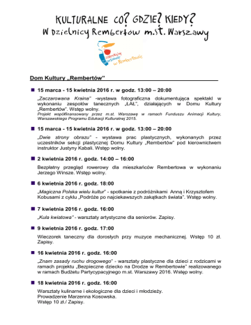 Dom Kultury „Rembertów” . 15 marca - 15 kwietnia 2016 r. w godz. 13:00 – 20:00 „Zaczarowana Kraina” -wystawa fotograficzna dokumentująca spektakl w wykonaniu zespołów tanecznych „ŁAŁ”, działających w Domu Kultury „Rembertów”. Wstęp wolny. Projekt współfinansowany przez m.st. Warszawę w ramach Funduszu Animacji Kultury, Warszawskiego Programu Edukacji Kulturalnej 2015. 15 marca - 15 kwietnia 2016 r. w godz. 13:00 – 20:00 „Dwie strony obrazu” - wystawa prac plastycznych, wykonanych przez uczestników sekcji plastycznej Domu Kultury „Rembertów” pod kierownictwem instruktor Justyny Kabali. Wstęp wolny. 2 kwietnia 2016 r. godz. 14:00 – 16:00 Bezpłatny przegląd rowerowy dla mieszkańców Rembertowa w wykonaniu Jerzego Winsze. Wstęp wolny. 6 kwietnia 2016 r. godz. 18:00 „Magiczna Polska wielu kultur” - spotkanie z podróżnikami Anną i Krzysztofem Kobusami z cyklu „Podróże po najciekawszych zakątkach świata”. Wstęp wolny. 7 kwietnia 2016 r. godz. 16:00 „Kula kwiatowa” - warsztaty artystyczne dla seniorów. Zapisy. 9 kwietnia 2016 r. godz. 17:00 Wieczorek taneczny dla dorosłych przy muzyce mechanicznej. Wstęp 10 zł. Zapisy. 16 kwietnia 2016 r. godz. 16:00 „Znam zasady ruchu drogowego” - warsztaty plastyczne dla dzieci z rodzicami w ramach projektu „Bezpieczne dziecko na Drodze w Rembertowie” realizowanego w ramach Budżetu Partycypacyjnego m.st. Warszawy 2016. Wstęp wolny. 18 kwietnia 2016 r. godz. 16:00 Warsztaty kulinarne i ekologiczne dla dzieci i młodzieży. Prowadzenie Marzenna Kosowska. Wstęp 10 zł./ Zapisy. 19 kwietnia 2016 r. godz. 17:45 „Poczytaj mi ciociu” - bajki dla dzieci czyta Grażyna Majkowska, wykładowca UW. Wstęp wolny. 20 kwietnia – 31 maja 2016 r. w godz. 13:00 – 20:00 „Drogi do Niepodległości ”– wystawa historyczna z zasobów Archiwum Polskiej Akademii Nauk. Galeria REM. Wstęp wolny. 23 kwietnia 2016 r. godz. 16:00 „Papierowy wiatr” – warsztaty z papieru czerpanego dla dzieci z rodzicami w ramach cyklu „Rodzinne spotkania ze sztuką”. Prowadzenie: Iwona Zawadzka. Wstęp wolny. 24 kwietnia 2016 r. w godz. 13:00 – 20:00 Rembertowski Klub Rowerowy T.K.T. „Kinowa” – otwarcie sezonu. W programie: rajd rowerowy wokół Falenicy, grill. Zbiórka: Falenica, ul. Derkaczy 58A, godz. 10:00. Prowadzenie: Ewa Winsze, Jerzy Winsze. Zapisy. 25 kwietnia 2016 r. godz. 10:00 "Czerwony Kapturek” - spektakl teatralny na podstawie tekstu Jana Brzechwy w wykonaniu Koła Teatralnego ze Szkoły Podstawowej nr 189 w Rembertowie. Przedstawienie przygotowały Barbara Lisowska i Anna Pastor. Wstęp wolny. 28 kwietnia 2016 r. godz. 18.00 „Taneczne ŁAŁ” - przedstawienie w wykonaniu sekcji tanecznych działających w Domu Kultury „Rembertów”. Miejsce: sala widowiskowo-konferencyjna im. gen. F. Gągora, Akademia Obrony Narodowej. Wstęp wolny. 29 kwietnia – 3 maja 2016 r. Rembertowski Klub Rowerowy T.K.T. „Kinowa” – rajd im. W. Balickiego. Miejsce: Kurpie – Czarnia k/ Myszyńca Zapisy u Jerzego Winsze. Dom Kultury Wygoda . 4 - 30 kwietnia 2016 r. w godz. 14:30 – 19:00 „Powstanie styczniowe” Załęskiego. Wstęp wolny. – wystawa fotograficzna autorstwa Aleksandra 4 kwietnia - 13 maja 2016 r. w godz. 14:30 – 19:00 „ Zwierzęta leśne wokół nas” - IV Edycja konkursu plastycznego dla dzieci i młodzieży dla placówek oświatowo-kulturalnych. Termin składania prac do 13 maja 2016 r. Regulamin znajduje się na stronie www.dkwygoda.waw.pl w zakładce konkursy. 6 - 30 kwietnia 2016 r. w godz. 14:30 – 19:00 „Wiosenne krajobrazy” – wystawa prac plastycznych uczestników sekcji plastycznej pod kierownictwem Ewy Gałczyńskiej. Wstęp wolny. 23 kwietnia 2016 r. godz. 12:00 „Janosik i Dobry Pasterz” – spektakl teatralny dla dzieci w wykonaniu Teatru Dobrego Serca. Wstęp wolny. 27 kwietnia 2016 r. godz. 18:30 „W sanatorium krynickim” – występ kabaretowy w wykonaniu Teatrzyku A’ la Kabaret” działającym od 6 lat przy Domu Kultury „Śródmieście”. Organizatorzy: Dom Kultury „Wygoda”, Ośrodek Pomocy Społecznej i Biblioteka Publiczna im. Jana Pawła II Miejsce: Biblioteka Publiczna im. Jana Pawła II ul. Gawędziarzy 8. Wstęp wolny. Biblioteka Publiczna im. Jana Pawła II 5 kwietnia 2016 r. godz. 17:00 Warsztaty w ramach Nadwiślańskiego Uniwersytetu Dziecięcego. Zapisy. Spotkanie w ramach „Budżetu partycypacyjnego 2016” 6 kwietnia 2016 godz. 17.00 Biblioteka literacko i plastycznie - warsztaty dla dzieci. Wstęp wolny 7 kwietnia godz. 9.30 Spotkanie autorskie z Elizą Piotrowską – autorką i ilustratorką książek dla dzieci, poetką, tłumaczem języka włoskiego, krytykiem sztuki. Wstęp wolny dla dzieci. 7 kwietnia godz. 16.30 Czwartkowe czytanki Pana Marcina. 7 kwietnia 2016 r. godz. 18.30 Spotkanie autorskie z Wojciechem Sumlińskim – dziennikarzem śledczym, autorem blisko dziesięciu książek i wielu artykułów w prasie polskiej i zagranicznej. Wstęp wolny. 8 kwietnia godz. 19.00 „Literacka kobieta”, czyli spotkanie z Renatą Wroną – coachem , trenerką, autorką książki „Szczęśliwa kobieta – rozwój, kariera, miłość”. 12 kwietnia 2016 r. godz. 17:00 Warsztaty w ramach Nadwiślańskiego Uniwersytetu Dziecięcego. Zapisy. Spotkanie w ramach „Budżetu partycypacyjnego 2016”. 13 kwietnia 2016 godz. 17.00 Biblioteka literacko i plastycznie - warsztaty dla dzieci. Wstęp wolny 14 kwietnia 2016 r. godz. 11:30 Czarodziejski dywanik – spotkanie dla najmłodszych. Wstęp wolny 14 kwietnia 2016 r. godz. 16:30 Czwartkowe czytanki – „Ząb czarownicy”. Spotkanie w ramach akcji Cała Polska czyta dzieciom. 18 kwietnia 2016 r. godz. 18.00 W 1050. rocznicę Chrztu Polski – spotkanie z ojcem prof. Jackiem Salij. Spotkanie w ramach „Budżetu partycypacyjnego 2016” 20 kwietnia 2016 r. godz. 18.00 Biblioteka literacko i plastycznie - warsztaty dla dzieci. Wstęp wolny 21 kwietnia 2016 r. 