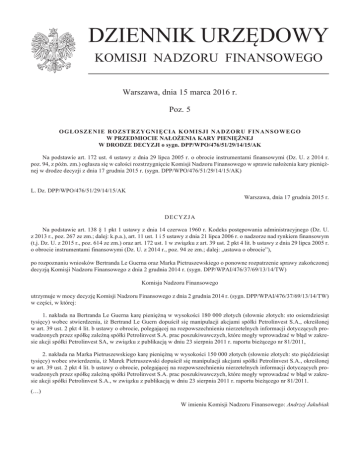 DZIENNIK URZĘDOWY KOMISJI NADZORU FINANSOWEGO Warszawa, dnia 15 marca 2016 r. Poz. 5 OGŁOSZENIE ROZSTRZYGNIĘCIA KOMISJI NADZORU FINANSOWEGO W PRZEDMIOCIE NAŁOŻENIA KARY PIENIĘŻNEJ W DRODZE DECYZJI o sygn. DPP/WPO/476/51/29/14/15/AK Na podstawie art. 172 ust. 4 ustawy z dnia 29 lipca 2005 r. o obrocie instrumentami finansowymi (Dz. U. z 2014 r. poz. 94, z późn. zm.) ogłasza się w całości rozstrzygnięcie Komisji Nadzoru Finansowego w sprawie nałożenia kary pieniężnej w drodze decyzji z dnia 17 grudnia 2015 r. (sygn. DPP/WPO/476/51/29/14/15/AK) L. Dz. DPP/WPO/476/51/29/14/15/AK Warszawa, dnia 17 grudnia 2015 r. DECYZJA Na podstawie art. 138 § 1 pkt 1 ustawy z dnia 14 czerwca 1960 r. Kodeks postępowania administracyjnego (Dz. U. z 2013 r., poz. 267 ze zm.; dalej: k.p.a.), art. 11 ust. 1 i 5 ustawy z dnia 21 lipca 2006 r. o nadzorze nad rynkiem finansowym (t.j. Dz. U. z 2015 r., poz. 614 ze zm.) oraz art. 172 ust. 1 w związku z art. 39 ust. 2 pkt 4 lit. b ustawy z dnia 29 lipca 2005 r. o obrocie instrumentami finansowymi (Dz. U. z 2014 r., poz. 94 ze zm.; dalej: „ustawa o obrocie”), po rozpoznaniu wniosków Bertranda Le Guerna oraz Marka Pietruszewskiego o ponowne rozpatrzenie sprawy zakończonej decyzją Komisji Nadzoru Finansowego z dnia 2 grudnia 2014 r. (sygn. DPP/WPAI/476/37/69/13/14/TW) Komisja Nadzoru Finansowego utrzymuje w mocy decyzję Komisji Nadzoru Finansowego z dnia 2 grudnia 2014 r. (sygn. DPP/WPAI/476/37/69/13/14/TW) w części, w której: 1. nakłada na Bertranda Le Guerna karę pieniężną w wysokości 180 000 złotych (słownie złotych: sto osiemdziesiąt tysięcy) wobec stwierdzenia, iż Bertrand Le Guern dopuścił się manipulacji akcjami spółki Petrolinvest S.A., określonej w art. 39 ust. 2 pkt 4 lit. b ustawy o obrocie, polegającej na rozpowszechnieniu nierzetelnych informacji dotyczących prowadzonych przez spółkę zależną spółki Petrolinvest S.A. prac poszukiwawczych, które mogły wprowadzać w błąd w zakresie akcji spółki Petrolinvest SA, w związku z publikacją w dniu 23 sierpnia 2011 r. raportu bieżącego nr 81/2011, 2. nakłada na Marka Pietruszewskiego karę pieniężną w wysokości 150 000 złotych (słownie złotych: sto pięćdziesiąt tysięcy) wobec stwierdzenia, iż Marek Pietruszewski dopuścił się manipulacji akcjami spółki Petrolinvest S.A., określonej w art. 39 ust. 2 pkt 4 lit. b ustawy o obrocie, polegającej na rozpowszechnieniu nierzetelnych informacji dotyczących prowadzonych przez spółkę zależną spółki Petrolinvest S.A. prac poszukiwawczych, które mogły wprowadzać w błąd w zakresie akcji spółki Petrolinvest S.A., w związku z publikacją w dniu 23 sierpnia 2011 r. raportu bieżącego nr 81/2011. (…) W imieniu Komisji Nadzoru Finansowego: Andrzej Jakubiak
