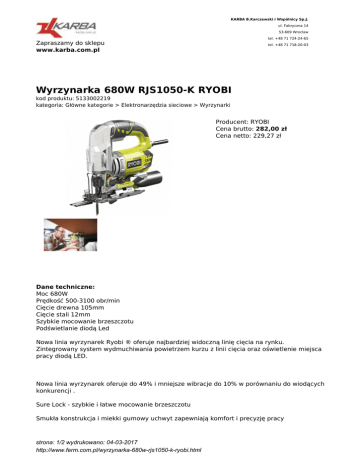 KARBA B.Karczewski i Wspólnicy Sp.J. ul. Fabryczna 14 53-609 Wrocław tel. +48 71 724-24-65 Zapraszamy do sklepu www.karba.com.pl tel. +48 71 718-20-03 Wyrzynarka 680W RJS1050-K RYOBI kod produktu: 5133002219 kategoria: Główne kategorie > Elektronarzędzia sieciowe > Wyrzynarki Producent: RYOBI Cena brutto: 282,00 zł Cena netto: 229,27 zł Dane techniczne: Moc 680W Prędkość 500-3100 obr/min Cięcie drewna 105mm Cięcie stali 12mm Szybkie mocowanie brzeszczotu Podświetlanie diodą Led Nowa linia wyrzynarek Ryobi ® oferuje najbardziej widoczną linię cięcia na rynku. Zintegrowany system wydmuchiwania powietrzem kurzu z linii cięcia oraz oświetlenie miejsca pracy diodą LED. Nowa linia wyrzynarek oferuje do 49% i mniejsze wibracje do 10% w porównaniu do wiodących konkurencji . Sure Lock - szybkie i łatwe mocowanie brzeszczotu Smukła konstrukcja i miekki gumowy uchwyt zapewniają komfort i precyzję pracy strona: 1/2 wydrukowano: 04-03-2017 http://www.ferm.com.pl/wyrzynarka-680w-rjs1050-k-ryobi.html Wyrzynarka dostępna z walizką. *Wymagana rejestracja na stronie www.ryobitools.eu w ciągu 30 dni od daty zakupu *Przy zakupie na Fakturę VAT gwarancja 1 rok strona: 2/2 wydrukowano: 04-03-2017 http://www.ferm.com.pl/wyrzynarka-680w-rjs1050-k-ryobi.html