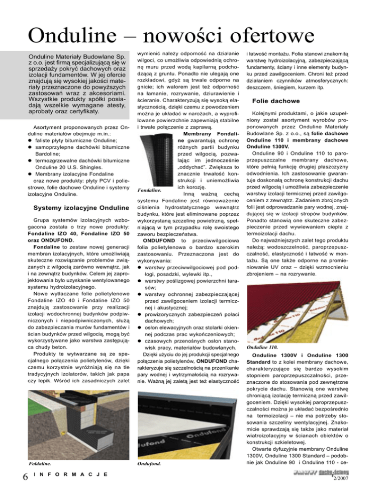Onduline – nowości ofertowe Grupa systemów izolacyjnych wzbogacona została o trzy nowe produkty: Fondaline IZO 40, Fondaline IZO 50 oraz ONDUFOND. Fondaline to zestaw nowej generacji membran izolacyjnych, które umożliwiają skuteczne rozwiązanie problemów związanych z wilgocią zarówno wewnątrz, jak i na zewnątrz budynków. Celem jej zaprojektowania było uzyskanie wentylowanego systemu hydroizolacyjnego. Nowe wytłaczane folie polietylenowe Fondaline IZO 40 i Fondaline IZO 50 znajdują zastosowanie przy realizacji izolacji wodochronnej budynków podpiwniczonych i niepodpiwniczonych, służą do zabezpieczania murów fundamentów i ścian budynków przed wilgocią, mogą być wykorzystywane jako warstwa zastępująca chudy beton. Produkty te wytwarzane są ze specjalnego połączenia polietylenów, dzięki czemu korzystnie wyróżniają się na tle tradycyjnych izolatorów, takich jak papa czy lepik. Wśród ich zasadniczych zalet wymienić należy odporność na działanie wilgoci, co umożliwia odpowiednią ochronę muru przed wodą kapilarną podchodzącą z gruntu. Ponadto nie ulegają one rozkładowi, gdyż są trwale odporne na gnicie; ich walorem jest też odporność na łamanie, rozrywanie, dziurawienie i ścieranie. Charakteryzują się wysoką elastycznością, dzięki czemu z powodzeniem można je układać w narożach, a wyprofilowane powierzchnie zapewniają stabilne i trwałe połączenie z zaprawą. Membrany Fondaline gwarantują ochronę różnych partii budynku przed wilgocią, pozwalając im jednocześnie „oddychać”. Zwiększa to znacznie trwałość konstrukcji i uniemożliwia ich korozję. Fondaline. Inną ważną cechą systemu Fondaline jest równoważenie ciśnienia hydrostatycznego wewnątrz budynku, które jest eliminowane poprzez wykorzystaną szczelinę powietrzną, spełniającą w tym przypadku rolę swoistego zaworu bezpieczeństwa. ONDUFOND to przeciwwilgociowa folia polietylenowa o bardzo szerokim zastosowaniu. Przeznaczona jest do wykonywania: l warstwy przeciwwilgociowej pod podłogi, posadzki, wylewki itp., l warstwy poślizgowej powierzchni tarasów; l warstwy ochronnej zabezpieczającej przed zawilgoceniem izolacji termicznej i akustycznej; l prowizorycznych zabezpieczeń połaci dachowych; l osłon elewacyjnych oraz stolarki okiennej podczas prac wykończeniowych; l czasowych przenośnych osłon stanowisk pracy, materiałów budowlanych. Dzięki użyciu do jej produkcji specjalnego połączenia polietylenów, ONDUFOND charakteryzuje się szczelnością na przenikanie pary wodnej i wytrzymałością na rozrywanie. Ważną jej zaletą jest też elastyczność Foldaline. Ondufond. Onduline Materiały Budowlane Sp. z o.o. jest firmą specjalizującą się w sprzedaży pokryć dachowych oraz izolacji fundamentów. W jej ofercie znajdują się wysokiej jakości materiały przeznaczone do powyższych zastosowań wraz z akcesoriami. Wszystkie produkty spółki posiadają wszelkie wymagane atesty, aprobaty oraz certyfikaty. Asortyment proponowanych przez Onduline materiałów obejmuje m.in.: l faliste płyty bitumiczne Onduline; l samoprzylepne dachówki bitumiczne Bardoline; l termozgrzewalne dachówki bitumiczne Onduline 20 U.S. Shingles. l Membrany izolacyjne Fondaline oraz nowe produkty: płyty PCV i poliestrowe, folie dachowe Onduline i systemy izolacyjne Onduline. Systemy izolacyjne Onduline 6 I N F O R M A C J E i łatwość montażu. Folia stanowi znakomitą warstwę hydroizolacyjną, zabezpieczającą fundamenty, ściany i inne elementy budynku przed zawilgoceniem. Chroni też przed działaniem czynników atmosferycznych: deszczem, śniegiem, kurzem itp. Folie dachowe Kolejnymi produktami, o jakie uzupełniony został asortyment wyrobów proponowanych przez Onduline Materiały Budowlane Sp. z o.o., są folie dachowe Onduline 110 i membrany dachowe Onduline 1300V. Onduline 90 i Onduline 110 to paroprzepuszczalne membrany dachowe, które pełnią funkcję drugiej płaszczyzny odwodnienia. Ich zastosowanie gwarantuje doskonałą ochronę konstrukcji dachu przed wilgocią i umożliwia zabezpieczenie warstwy izolacji termicznej przed zawilgoceniem z zewnątrz. Zadaniem zbrojonych folii jest odprowadzanie pary wodnej, znajdującej się w izolacji stropów budynków. Ponadto stanowią one skuteczne zabezpieczenie przed wywiewaniem ciepła z termoizolacji dachu. Do najważniejszych zalet tego produktu należą: wodoszczelność, paroprzepuszczalność, elastyczność i łatwość w montażu. Są one także odporne na promieniowanie UV oraz – dzięki wzmocnieniu zbrojeniem – na rozrywanie. Onduline 110. Onduline 1300V i Onduline 1300 Standard to z kolei membrany dachowe, charakteryzujące się bardzo wysokim stopniem paroprzepuszczalności, przeznaczone do stosowania pod zewnętrzne pokrycie dachu. Stanowią one warstwę chroniącą izolację termiczną przed zawilgoceniem. Dzięki wysokiej paroprzepuszczalności można je układać bezpośrednio na termoizolacji – nie ma potrzeby stosowania szczeliny wentylacyjnej. Znakomicie sprawdzają się także jako materiał wiatroizolacyjny w ścianach obiektów o konstrukcji szkieletowej. Otwarte dyfuzyjnie membrany Onduline 1300V, Onduline 1300 Standard – podobnie jak Onduline 90 i Onduline 110 - ce2/2007 chują się wodoszczelnością, odpornością na rozrywanie i promieniowanie UV. Są elastyczne i łatwe w montażu. Onduline 1300V. Płyty PCV i poliestrowe Stanowią możliwość doświetlenia pomieszczeń. W ich produkcji wykorzystano specjalny rodzaj żywic i związków chemicznych, hamujących przenikanie promieni ultrafioletowych, chroniących przed szkodliwym działaniem czynników atmosferycznych i uderzeniami mechanicznymi. Pozostała oferta Faliste płyty bitumiczne Onduline To sztandarowy produkt firmy Onduline, produkowany od ponad 60 lat i stosowany w ponad 100 krajach na całym świecie. Płyta Onduline jest najbardziej uniwersalnym i ekonomicznym materiałem pokryciowym i 
