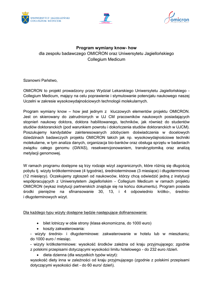 Program wymiany know- how dla zespołu badawczego OMICRON oraz Uniwersytetu Jagiellońskiego Collegium Medicum Szanowni Państwo, OMICRON to projekt prowadzony przez Wydział Lekarskiego Uniwersytetu Jagiellońskiego Collegium Medicum, mający na celu poprawienie i stymulowanie potencjału naukowego naszej Uczelni w zakresie wysokowydajnościowych technologii molekularnych. Program wymiany know – how jest jednym z kluczowych elementów projektu OMICRON. Jest on skierowany do zatrudnionych w UJ CM pracowników naukowych posiadających stopnień naukowy doktora, doktora habilitowanego, techników, jak również do studentów studiów doktoranckich (pod warunkiem powrotu i dokończenia studiów doktoranckich w UJCM). Poszukujemy kandydatów zainteresowanych zdobyciem doświadczenia w docelowych dziedzinach badawczych projektu OMICRON takich jak np. wysokowydajnościowe techniki molekularne, w tym analiza danych, organizacja bio-banków oraz obsługa sprzętu w badaniach związku całego genomu (GWAS), resekwencjonowaniem, transkryptomiką oraz analizą metylacji genomowej. W ramach programu dostępne są trzy rodzaje wizyt zagranicznych, które różnią się długością pobytu tj. wizyty krótkoterminowe (4 tygodnie), średnioterminowe (3 miesiące) i długoterminowe (12 miesięcy). Oczekujemy zgłoszeń od naukowców, którzy chcą odwiedzić jedną z instytucji współpracujących z Uniwersytetem Jagiellońskim - Collegium Medicum w ramach projektu OMICRON (wykaz instytucji partnerskich znajduje się na końcu dokumentu). Program posiada środki pieniężne na sfinansowanie 30, 13, i 4 odpowiednio krótko-, średnioi długoterminowych wizyt. Dla każdego typu wizyty dostępne będzie następujące dofinansowanie: bilet lotniczy w obie strony (klasa ekonomiczna, do 1000 euro) koszty zakwaterowania: - wizyty średnio- i długoterminowe: zakwaterowanie w hotelu lub w mieszkaniu; do 1000 euro / miesiąc. - wizyty krótkoterminowe: wysokość środków zależna od kraju przyjmującego; zgodnie z polskimi przepisami dotyczącymi wysokości limitu hotelowego - do 232 euro /dzień. dieta dzienna (dla wszystkich typów wizyt): wysokość diety inna w zależności od kraju przyjmującego (zgodnie z polskimi przepisami dotyczącymi wysokości diet - do 60 euro/ dzień). dieta na pokrycie kosztów podróży: 10% dziennej diety / dzień (wyłącznie jeżeli miejsce czasowego zamieszkania jest inne niż miejsce pracy oraz uczestnik nie korzysta z własnego samochodu). Dodatkowo dla wizyt średnio- i długoterminowych: dieta na pokrycie dodatkowych kosztów np. opłat konferencyjnych, itp.) - wizyty średnioterminowe: do 1500 euro - wizyty krótkoterminowe: do 1000 euro. Zgodnie z dokumentacja projektową całkowity budżet tego programu wyniesie około 521 940 euro. Do złożenia wniosków zachęcamy wszystkich naukowców, w szczególności tych, którzy chcieliby w przyszłości skorzystać ze sprzętu badawczego, znajdującego się w laboratorium OMICRON. Akceptowane będą również wnioski składane przez informatyków, którzy chcą zdobyć doświadczenie w zakresie przechowywania znacznych ilości danych i analizy wyników otrzymanych z wysokowydajnych badań genetycznych, epigenetycznych, z badań nad ekspresją, głębokim resekwencjonowaniem i GWAS. Po powrocie, pracownicy naukowi posiadający stopień doktora oraz doktoranci będą zobowiązani przedstawić prezentację w jednej z sal konferencyjnych UJCM. Dokumenty aplikacyjne należy przesłać pocztą elektroniczną na adres dr Mateusza Siedlińskiego ([email protected], Katedra Chorób Wewnętrznych i Medycyny Wsi UJCM) Dokumenty te powinny zawierać następujące informacje: CV z listą publikacji kandydata preferowana długość wizyty nazwa Wydziału w instytucji przyjmującej nazwa Wydziału w uczelni macierzystej szczegółowy opis projektu (tj. rodzaj wykorzystywanego sprzętu, typy próbek zanalizowanych, możliwe sposoby analizy danych, oczekiwane rezultaty itp.) i / lub techniki laboratoryjne, jakie wnioskodawca ma zamiar opanować (np. jak obsługiwać wysokoprzepustowe analizatory zakupione dla potrzeb centrum OMICRON oraz jak zarządzać dużą ilością próbek DNA / RNA) oraz na jakie kursy wnioskodawca jest skłonny uczęszczać wstępna zgoda instytucji przyjmującej źródła sfinansowania części naukowej projektu (jeżeli dotyczy). Nabór wniosków w 2013 i 2014 roku odbywa się w trybie ciągłym, a wnioskodawcy powinni spodziewać się decyzji do 2 miesięcy od dnia wpłynięcia wniosku. Komitet Sterujący programu OMICRON, wspólnie z ekspertami zewnętrznymi, należącymi do Komitetu Międzynarodowego, starannie ocenią wnioski. Każdy nabór będzie obejmował w przybliżeniu 2-3 wizyty długoterminowe 3-4 wizyty średnioterminowe i 7 wizyt krótkoterminowych. Zaznaczamy, iż możliwa jest sytuacja, w której nie wszystkie dostępne stypendia zostaną przyznane (z powodu niewystarczającej liczby kandydatów lub negatywnej oceny Komitetu Sterującego). Ponadto, jeżeli liczba wniosków zaakceptowanych przekroczy liczbę dostępnych stypendiów, Komitet Sterujący może jednorazowo zwiększyć liczbę dostępnych stypendiów. Z poważaniem, Kierownik Projektu: Członkowie Komitetu Sterującego: Prof. dr hab. med. Maciej Małecki prof. dr hab. Piotr Laidler prof. dr hab. med. Tomasz Grodzicki prof. dr hab. med. Tomasz Brzozowski prof. dr hab. med. Ryszard Korbut mgr Marcin Jędrychowski dr Paweł Wołkow prof. dr hab. Marcin Majka prof. dr hab. med. Tomasz Guzik dr hab. Marcin Barczyński mgr Ewa Klepacz-Zielińska Lista uniwersytetów/instytucji partnerskich projektu OMICRON: (1). University of Oxford, UK (2). King's College, University of London, UK, (3). University of Wuerzburg, Germany (4). Norwegian University of Science and Technology (NTNU), Trondheim, Norway, (5). Masaryk University, Brno, the Czech Republic, (6). deCODE, Reykijavik, Iceland, (7). Institute of Human Genetics, International Centre for Lif