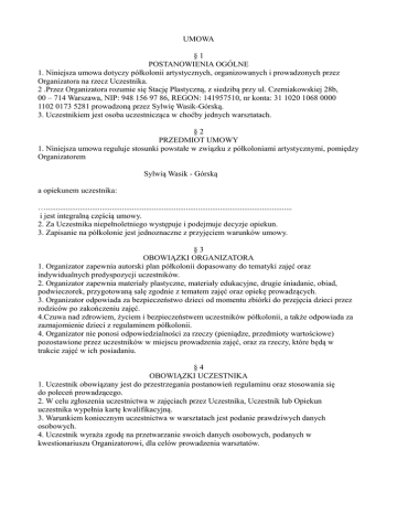 UMOWA §1 POSTANOWIENIA OGÓLNE 1. Niniejsza umowa dotyczy półkolonii artystycznych, organizowanych i prowadzonych przez Organizatora na rzecz Uczestnika. 2 .Przez Organizatora rozumie się Stację Plastyczną, z siedzibą przy ul. Czerniakowskiej 28b, 00 – 714 Warszawa, NIP: 948 156 97 86, REGON: 141957510, nr konta: 31 1020 1068 0000 1102 0173 5281 prowadzoną przez Sylwię Wasik-Górską. 3. Uczestnikiem jest osoba uczestnicząca w choćby jednych warsztatach. §2 PRZEDMIOT UMOWY 1. Niniejsza umowa reguluje stosunki powstałe w związku z półkoloniami artystycznymi, pomiędzy Organizatorem Sylwią Wasik - Górską a opiekunem uczestnika: …........................................................................................................................... i jest integralną częścią umowy. 2. Za Uczestnika niepełnoletniego występuje i podejmuje decyzje opiekun. 3. Zapisanie na półkolonie jest jednoznaczne z przyjęciem warunków umowy. §3 OBOWIĄZKI ORGANIZATORA 1. Organizator zapewnia autorski plan półkolonii dopasowany do tematyki zajęć oraz indywidualnych predyspozycji uczestników. 2. Organizator zapewnia materiały plastyczne, materiały edukacyjne, drugie śniadanie, obiad, podwieczorek, przygotowaną salę zgodnie z tematem zajęć oraz opiekę prowadzących. 3. Organizator odpowiada za bezpieczeństwo dzieci od momentu zbiórki do przejęcia dzieci przez rodziców po zakończeniu zajęć. 4.Czuwa nad zdrowiem, życiem i bezpieczeństwem uczestników półkolonii, a także odpowiada za zaznajomienie dzieci z regulaminem półkolonii. 4. Organizator nie ponosi odpowiedzialności za rzeczy (pieniądze, przedmioty wartościowe) pozostawione przez uczestników w miejscu prowadzenia zajęć, oraz za rzeczy, które będą w trakcie zajęć w ich posiadaniu. §4 OBOWIĄZKI UCZESTNIKA 1. Uczestnik obowiązany jest do przestrzegania postanowień regulaminu oraz stosowania się do poleceń prowadzącego. 2. W celu zgłoszenia uczestnictwa w zajęciach przez Uczestnika, Uczestnik lub Opiekun uczestnika wypełnia kartę kwalifikacyjną. 3. Warunkiem koniecznym uczestnictwa w warsztatach jest podanie prawdziwych danych osobowych. 4. Uczestnik wyraża zgodę na przetwarzanie swoich danych osobowych, podanych w kwestionariuszu Organizatorowi, dla celów prowadzenia warsztatów. §5 BEZPIECZEŃSTWO UCZESTNIKÓW 1.Dla bezpieczeństwa uczestników niepełnoletnich, opiekunowie uprzejmie proszeni są o podanie osób uprawnionych do odbioru uczestnika z warsztatów, ich danych personalnych oraz numerów telefonu. 2.Istnieje możliwość samodzielnego opuszczenia miejsca zajęć przez Uczestnika niepełnoletniego jedynie za pisemną zgodą opiekuna lub za każdorazowym kontaktem telefonicznym. 3.Opiekunowie uprzejmie proszeni są również o udzielenie informacji o stanie zdrowia Uczestnika, w razie potrzeby również informacji co do przyjmowanych lekach, uczuleniach i innych stosownych zagrożeniach. 4.Uczestnik niepełnoletni nie może opuszczać terenu półkolonii w trakcie trwania, chyba, że zajęcia prowadzone są w plenerze pod opieką prowadzącego, w takim wypadku uczestnik nie może oddalać się od prowadzącego i obowiązany jest po zakończeniu zajęć udać się z prowadzącym do siedziby Organizatora albo umówionego, przez Opiekuna z prowadzącym, miejsca. 5. Uczestnik odpowiada za szkody wyrządzone Organizatorowi, które nastąpiły w wyniku niewłaściwego zachowania uczestnika. Za uczestnika niepełnoletniego odpowiada opiekun. §6 PŁATNOŚCI 1. Uczestnik obowiązany jest opłacić półkolonie najpóźniej do pierwszego dnia półkolonii. 2. Płatność za półkolonie wynosi 650 zł. 3.Wniesienie zaliczki we wskazanym terminie traktowane jest jako zawarcie Umowy uczestnictwa w zajęciach. Brak wniesienia zaliczki równoznaczny jest z rezygnacją z wcześniejszego Zgłoszenia. 4. Zaliczka wynosi 200zł 5. Płatność może być dokonana gotówką lub przelewem. 6. Przelewu dokonuje się na numer konta Organizatora: Bank PKOBP, nr konta: 31 1020 1068 0000 1102 0173 5281 a Uczestnik obowiązany jest dostarczyć Organizatorowi potwierdzenie przelewu w tym samym czasie, w którym obowiązany jest do dokonania płatności. &7 REZYGNACJA Z PÓŁKOLONII 1.W przypadku rezygnacji z przyczyn nie leżących po stronie Organizatora osobie, która rezygnuje z półkolonii wypłaca się kwotę zaliczki potrąconą o koszta rezygnacji uzależnione od daty rezygnacji. • od 30 do 10 dni – potrącane jest 50% wartości zaliczki • rezygnacja poniżej 10 dni przed rozpoczęciem półkolonii lub w dniu rozpoczęcia półkolonii powoduje całkowitą utratę zaliczki. Jeżeli Opiekun wpłacił całość ceny za półkolonię to różnica pomiędzy ceną półkolonii a zaliczką zostanie zwrócona. Podpis Organizatora Podpis Opiekuna Uczestnika