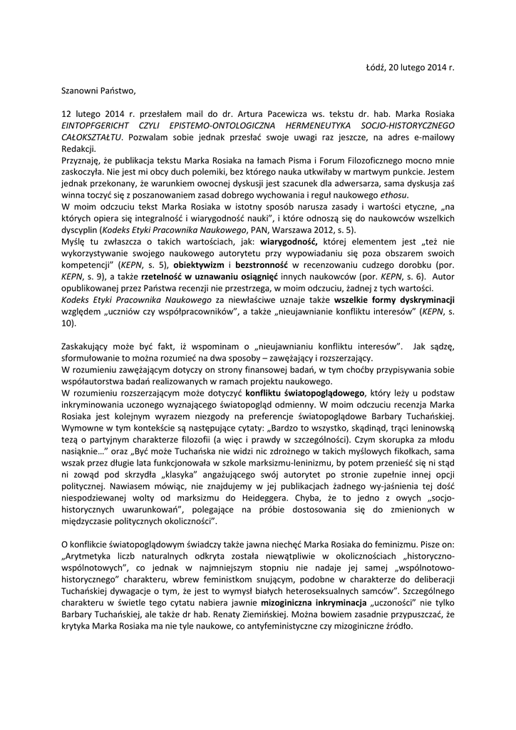 Łódź, 20 lutego 2014 r. Szanowni Państwo, 12 lutego 2014 r. przesłałem mail do dr. Artura Pacewicza ws. tekstu dr. hab. Marka Rosiaka EINTOPFGERICHT CZYLI EPISTEMO-ONTOLOGICZNA HERMENEUTYKA SOCJO-HISTORYCZNEGO CAŁOKSZTAŁTU. Pozwalam sobie jednak przesłać swoje uwagi raz jeszcze, na adres e-mailowy Redakcji. Przyznaję, że publikacja tekstu Marka Rosiaka na łamach Pisma i Forum Filozoficznego mocno mnie zaskoczyła. Nie jest mi obcy duch polemiki, bez którego nauka utkwiłaby w martwym punkcie. Jestem jednak przekonany, że warunkiem owocnej dyskusji jest szacunek dla adwersarza, sama dyskusja zaś winna toczyć się z poszanowaniem zasad dobrego wychowania i reguł naukowego ethosu. W moim odczuciu tekst Marka Rosiaka w istotny sposób narusza zasady i wartości etyczne, „na których opiera się integralność i wiarygodność nauki”, i które odnoszą się do naukowców wszelkich dyscyplin (Kodeks Etyki Pracownika Naukowego, PAN, Warszawa 2012, s. 5). Myślę tu zwłaszcza o takich wartościach, jak: wiarygodność, której elementem jest „też nie wykorzystywanie swojego naukowego autorytetu przy wypowiadaniu się poza obszarem swoich kompetencji” (KEPN, s. 5), obiektywizm i bezstronność w recenzowaniu cudzego dorobku (por. KEPN, s. 9), a także rzetelność w uznawaniu osiągnięć innych naukowców (por. KEPN, s. 6). Autor opublikowanej przez Państwa recenzji nie przestrzega, w moim odczuciu, żadnej z tych wartości. Kodeks Etyki Pracownika Naukowego za niewłaściwe uznaje także wszelkie formy dyskryminacji względem „uczniów czy współpracowników”, a także „nieujawnianie konfliktu interesów” (KEPN, s. 10). Zaskakujący może być fakt, iż wspominam o „nieujawnianiu konfliktu interesów”. Jak sądzę, sformułowanie to można rozumieć na dwa sposoby – zawężający i rozszerzający. W rozumieniu zawężającym dotyczy on strony finansowej badań, w tym choćby przypisywania sobie współautorstwa badań realizowanych w ramach projektu naukowego. W rozumieniu rozszerzającym może dotyczyć konfliktu światopoglądowego, który leży u podstaw inkryminowania uczonego wyznającego światopogląd odmienny. W moim odczuciu recenzja Marka Rosiaka jest kolejnym wyrazem niezgody na preferencje światopoglądowe Barbary Tuchańskiej. Wymowne w tym kontekście są następujące cytaty: „Bardzo to wszystko, skądinąd, trąci leninowską tezą o partyjnym charakterze filozofii (a więc i prawdy w szczególności). Czym skorupka za młodu nasiąknie…” oraz „Być może Tuchańska nie widzi nic zdrożnego w takich myślowych fikołkach, sama wszak przez długie lata funkcjonowała w szkole marksizmu-leninizmu, by potem przenieść się ni stąd ni zowąd pod skrzydła „klasyka” angażującego swój autorytet po stronie zupełnie innej opcji politycznej. Nawiasem mówiąc, nie znajdujemy w jej publikacjach żadnego wy-jaśnienia tej dość niespodziewanej wolty od marksizmu do Heideggera. Chyba, że to jedno z owych „socjohistorycznych uwarunkowań”, polegające na próbie dostosowania się do zmienionych w międzyczasie politycznych okoliczności”. O konflikcie światopoglądowym świadczy także jawna niechęć Marka Rosiaka do feminizmu. Pisze on: „Arytmetyka liczb naturalnych odkryta została niewątpliwie w okolicznościach „historycznowspólnotowych”, co jednak w najmniejszym stopniu nie nadaje jej samej „wspólnotowohistorycznego” charakteru, wbrew feministkom snującym, podobne w charakterze do deliberacji Tuchańskiej dywagacje o tym, że jest to wymysł białych heteroseksualnych samców”. Szczególnego charakteru w świetle tego cytatu nabiera jawnie mizoginiczna inkryminacja „uczoności” nie tylko Barbary Tuchańskiej, ale także dr hab. Renaty Ziemińskiej. Można bowiem zasadnie przypuszczać, że krytyka Marka Rosiaka ma nie tyle naukowe, co antyfeministyczne czy mizoginiczne źródło. Tekst recenzji nie jest też, w moim odczuciu, obiektywny i bezstronny. Zasadza się bowiem na przekonaniu, że wszystko, co wykracza poza preferowaną przez Marka Rosiaka perspektywę aksjologiczną, polityczną, ontologiczną i historyczno-filozoficzną jest – z naukowego punktu widzenia – banialuką. Warto zatem podkreślić, że badania Barbary Tuchańskiej nawiązują do szerokiego i według wielu osób istotnego nurtu współczesnych dociekań filozoficznych. Ewentualna krytyka takich badań nie powinna mieć formy szyderstwa, nie powinna być deprecjonowaniem i dyskryminowaniem dorobku innych uczonych oraz perspektyw innych niż własna. Tekst recenzji nie przestrzega także zasady rzetelnego uznawania osiągnięć innych uczonych. Sformułowania takie jak: „Skoro ona sama w trakcie trwającej długie lata akademickiej kariery nie dostrzegła konsekwencji rujnujących rozwijaną przez nią koncepcję u samych podstaw, to darmo byłoby je jej teraz wskazywać”; „Ostateczną konkluzją wywodów naszej autorki, których wy-trwała lektura grozi czytelnikowi wywichnięciem sobie stawów żuchwowych […]”; „Nie rozumie bowiem, na czym polegają problemy tej koncepcji, jak tego choćby dowodzi aprobatywne cytowanie przez nią obiekcji Renaty Ziemińskiej, że (prawdziwym) zdaniom alternatywnym nie odpowiadają po stronie rzeczywistości izomorficzne z nimi alternatywne fakty [s. 46]. Obie panie z zapałem podkreślają też, że nie ma realnego odpowiednika ogólnego kwantyfikatora, a przecież zdania mające taki prefiks bywają prawdziwe. Są to epistemologiczne banialuki na ostatnim poziomie w znanej trzystopniowej skali prawdy według śp. ks. J. Tischnera (tak zwana „góralska teoria poznania”)”; „Gdyby Tuchańska nieco gruntowniej zapoznała się z przywoływaną przez siebie formalizacją pojęcia prawdy Tarskiego [s. 42 n.], czy choćby tylko z cytowanymi [s. 40 n.] ustępami podręcznika logiki dla studentów I roku filozofii, autorstwa Grzegorza Malinowskiego, miałaby szansę poznać p