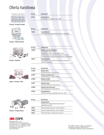 Oferta handlowa Nr kat. Zawartość 67001 Uzupełnienie 4 x butelka z proszkiem (po 100g) Nr kat. Zawartość 12245 Uzupełnienie 50 opakowań jednorazowych (0,5 ml, aplikator) Nr kat. Zawartość 12636 Zestaw wprowadzający: 2 strzykawki (po 1,2 ml) wytrawiacz w żelu Scotchbond (3 ml) 20 końcówek do aplikacji materiału (czarne) 25 końcówek do aplikacji wytrawiacza (niebieskie) 12637 Uzupełnienie: strzykawka (1,2 ml) 20 końcówek do aplikacji materiału (czarne) Nr kat. Zawartość 41923 Zestaw Mini 20 aplikatorów L-Pop (2,4 ml) 41925 Zestaw podstawowy 40 aplikatorów L-Pop (4,8 ml) 41926 Zestaw średni 100 aplikatorów L-Pop (12 ml) 41927 Zestaw duży 1200 aplikatorów L-Pop (24 ml) 41928 Zestaw ekonomiczny 500 aplikatorów L-Pop (60 ml) 41904 Uzupełnienia 50 jednorazowych aplikatorów mini, żółte Clinpro Prophy Powder TM Clinpro White Varnish TM Clinpro Sealant TM Adper Prompt L-Pop TM Clinpro Prophy Paste TM 3M Poland Sp. z o.o., 3M ESPE Dział Stomatologiczny, Al. Katowicka 117, Kajetany, 05-830 Nadarzyn, tel. 022 739 60 84 (-78), [email protected] www.3mespe.pl Nr kat. Zawartość Uzupełnienia Opakowania 400g (200 jednorazowych opakowań po 2g) 12657 Średnia wielkość ziaren, smak miętowy 12658 Ziarna o dużej średnicy, smak miętowy 12613 Drobnoziarnista, smak gumy do żucia 3M, ESPE, Clinpro, Adper są znakami handlowymi 3M lub 3M ESPE AG. © 3M 2008. Wszystkie prawa zastrzeżone. 3M™ ESPE™ ™ Skuteczna ochrona jamy ustnej Pomysł na zdrowy uśmiech Profesjonalny cykl profilaktyczny 3M ESPE bazuje na propozycji Niemieckiego Stowarzyszenia Stomatologów, którą uznano za najlepszy model gwarantujący ciągłą poprawę zdrowia jamy ustnej. Badanie i diagnoza Ostateczne sprawdzenie Edukacja i motywacja pacjenta Instrukcja higieny jamy ustnej Profesjonalne czyszczenie zębów Badanie i diagnoza Edukacja i motywacja Profesjonalne czyszczenie zębów Instrukcja higieny jamy ustnej Pierwszym etapem jest Zabiegi profilaktyczne Towarzystwa stomatolo- Dla sukcesu zabiegów badanie zębów i dziąseł są skuteczne tylko wtedy, giczne na całym świecie profilaktycznych ważne w gabinecie oraz diagnoza. gdy pacjent aktywnie zalecają profesjonalne jest także to, jak zęby Ważne są także pytania i systematycznie czyszczenie zębów jako oraz dziąsła są chronione o higienę jamy ustnej uczestniczy w tym procesie. najlepszy środek każdego dnia poza w domu. Staną się one zapobiegawczy, który gabinetem podstawą do późniejszych przynosi korzyść obu stomatologicznym. wskazówek i porad dla stronom. Jego skuteczność pacjenta. potwierdziły wyniki wielu badań klinicznych. Clinpro - profesjonalne czyszczenie zębów TM Pod marką Clinpro 3M ESPE opracowało gamę produktów obejmujących całą procedurę profesjonalnego czyszczenia i zabezpieczania zębów. Produkty, które powstały w wyniku wielu badań naukowych, są łatwe w użyciu oraz zapewniają właściwą ochronę dla zębów i dziąseł. Twój program skutecznej profilaktyki • Systematyczna profilaktyka z pełną gamą produktów Profesjonalne czyszczenie zębów powinno być dostosowane do indywidualnego • Właściwy produkt na każdym etapie procedury przypadku i jest zależne od sytuacji w jamie ustnej pacjenta. Niezależnie od założeń postawionych przez lekarza, oferta Clinpro 3M ESPE zapewni właściwe produkty • Wysoka skuteczność potwierdzona badaniami naukowymi na każdym etapie procedury. Badanie i diagnoza Próchnica Choroba dziąseł Choroba przyzębia • Produkty łatwe w użyciu • Z astosowanie przyjemne dla pacjenta Nadwrażliwość np. przewlekłe zapalenia przyzębia Dalsze badania np. badanie mikrobiologiczne/DNA Profesjonalne czyszczenie zębów Leczenie przyzębia Edukacja / Motywacja / Wskazówki Skaling nad- i poddziąsłowy Piaskowanie Clinpro Prophy Powder TM Polerowanie Clinpro Prophy Paste TM Lakierowanie Clinpro White Varnish Lakowanie Clinpro Sealant TM TM Higiena jamy ustnej Powtórna wizyta Opcjonalna terapia antybiotykowa Efekt - optymalna higiena jamy ustnej Clinpro Prophy Powder TM Proszek do profilaktyki, przeznaczony do piaskarek Zabiegi nad- i poddziąsłowe Usuwanie płytki nazębnej to najczęściej stosowany zabieg profilaktyczny. Jest jednym z najważniejszych elementów dbania o zdrowie zębów pacjenta. 3M ESPE opracowało innowacyjną technologię, która gwarantuje lekarzowi efekt wysokiej jakości zabiegów piaskowania oraz leczenia dziąseł, a pacjentowi zapewnia szybką oraz przyjemną procedurę. Tradycyjne proszki do piaskowania • Cząstki o wielkości do 200 µm • Ze względu na wysoką abrazyjność mogą być stosowane maksymalnie dwa razy w roku Minimalna abrazyjność - bezpieczne i skuteczne usuwanie płytki nazębnej W Clinpro Prophy Powder zastosowano glicynę, która posiada minimalną abrazyjność. Dzięki temu materiał skutecznie usuwa płytkę nazębną bez klinicznie obserwowanego uszkodzenia tkanek twardych, widocznego przy zastosowaniu konwencjonalnych proszków opartych na dwuwęglanie sodu/wapnia. Jest łagodny dla szkliwa, materiałów do wypełnień oraz delikatnych powierzchni korzenia. Ze względu na niższą abrazyjność Clinpro Prophy Powder można stosować częściej niż dwa razy w roku. Łagodne działanie czyszczące proszku sprawia, że po jego zastosowaniu nie jest konieczne dodatkowe polerowanie powierzchni zębów. Clinpro Prophy Powder • Cząstki mniejsze niż 63 µm • Możliwe częste zastosowanie Proszki tradycyjne Proszki mało abrazyjne (Clinpro Prophy Powder) Zabiegi poddziąsłowe --- Zabiegi poddziąsłowe +++ Usuwanie płytki nazębnej +++ Usuwanie płytki nazębnej +++ Usuwanie plam +++ Usuwanie plam ++ Oczyszczanie szkliwa ++ Oczyszczanie szkliwa +++ Oczyszczanie zębiny --- Oczyszczanie zębiny +++ Oczyszczanie korzeni --- Oczyszczanie korzeni +++ Zdrowe dziąsła Clinpro Prophy Powder skutecznie obniża poziom bakterii w patologicznych kieszonkach TM dziąsłowych. Stosowany pod