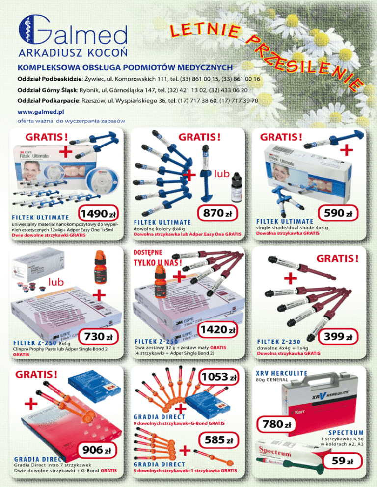 pr letnie ze KOMPLEKSOWA OBSŁUGA PODMIOTÓW MEDYCZNYCH Oddział Podbeskidzie: Żywiec, ul. Komorowskich 111, tel. (33) 861 00 15, (33) 861 00 16 silen e i Oddział Górny Śląsk: Rybnik, ul. Górnośląska 147, tel. (32) 421 13 02, (32) 433 06 20 Oddział Podkarpacie: Rzeszów, ul. Wyspiańskiego 36, tel. (17) 717 38 60, (17) 717 39 70 www.galmed.pl oferta ważna do wyczerpania zapasów GRATIS ! GRATIS ! GRATIS ! lub F I LT E K U LT I M AT E 1490 zł uniwersalny materiał nanokompozytowy do wypełnień estetycznych 12x4g+ Adper Easy One 1x5ml Dwie dowolne strzykawki GRATIS F I LT E K U LT I M AT E 870 zł dowolne kolory 6x4 g Dowolna strzykawka lub Adper Easy One GRATIS 590 zł F I LT E K U LT I M AT E single shade/dual shade 4x4 g Dowolna strzykawka GRATIS DOSTĘPNE GRATIS ! TYLKO U NAS ! lub F I LT E K Z - 2 5 0 730 zł 8x4 g Clinpro Prophy Paste lub Adper Single Bond 2 GRATIS 1420 zł F I LT E K Z - 2 5 0 Dwa zestawy 32 g + zestaw mały GRATIS (4 strzykawki + Adper Single Bond 2) GRATIS ! 1053 zł GRADIA DIRECT 9 dowolnych strzykawek+G-Bond GRATIS GRADIA DIRECT 585 zł 906 zł Gradia Direct Intro 7 strzykawek Dwie dowolne strzykawki + G-Bond GRATIS GRADIA DIRECT 5 dowolnych strzykawek+1 strzykawka GRATIS F I LT E K Z - 250 399 zł dowolne 4x4g + 1x4g Dowolna strzykawka GRATIS XRV HERCULITE 80g GENERAL 780 zł s p ectrum 1 strz ykawka 4,5g w kolorach A2, A3 59 zł GRATIS ! 341 zł 1680 zł E M P R E SS D I R E C T zestaw Basic kit 8x3g + 6 strzykawek A2, A3, A3.5 szkliwa i zębiny E M P R E SS D I R E C T zestaw 4+1 682 zł lub E M P R E SS D I R E C T 681 zł 2x Empress Direct + Adhese One F, Vivapen 0,5 ml + Fluor Protector Gel 4x Empress Direct + Adhese One F, Vivapen 2 ml za 1 zł 1260 zł T E T R I C E V O C E R A M J U M B O PA C K 5 strzykawek w kolorze A2 5 strzykawek w kolorze A3 cena za 1 strzykawkę 72 zł 216 zł T E T R I C N E X T G E N E R AT I O N 3 strzykawki T e - econom P L U S 375 zł zestaw 8 x 4g+Te-econom bond 236 zł T e - econom P LU S zestaw 4 x 4g+Te-econom bond 49 zł T E - E C O N O M F LO W 1 x strzykawka 2 g ESTELITE zestaw wprowadzający 6x3,8g + Bond force 1 ml 599 zł tetric evoflo w nanohybrydowy kompozyt typu Flow zestaw 8x2 g 595 zł nanohybrydowy kompozyt flow. 1x2g SDR C R Y S TA L L I N E 99 zł Chemoutwardzalny kompozyt EVICROL Chemoutwardzalny kompozyt 69 zł 89 zł T E T R I C E V O F LO W 540 zł Zestaw zawiera 45 kapsułek po 0,25 g + xeno 2,5 ml + akcesoria SDR UZUPEŁNIENIE 15 kapsułek po 0,25 g - 175 zł O p ti - s olo B ond A D H E S E O N E V iva p en jednoskładnikowy samowytrawiający system łączący. 1x2ml 1 x 3ml 76 zł ADPER SINGLE 2 system łączący 1x 5ml KRĄŻKI SOF-LEX GRATIS ADPER EASY ONE jednobutelkowy samowytrawiający system łączący 1x5ml KRĄŻKI SOF-LEX GRATIS 335 zł G – B ond 1 x 5ml T e – E conom B ond 1 x 5ml 84 zł 215 zł 185 zł FUJI IX EXTRA FUJI TRIAGE O N E C O AT B O N D 7 . 0 50 kapsułek jednoskładnikowy samowytrawiający materiał wiążący siódmej generacji 5ml 155 zł 218 zł 341 zł zestaw proszek+płyn 50 kapsułek PROMOCJA do 5 opakowań Fuji Triage w kapsułkach 1 opakowanie GRATIS cena pakietu 1705 zł FUJI PLUS 309 zł zestaw proszek+płyn 50 kapsułek FUJI IX GP 376 zł 219 zł 374 zł PROMOCJA do 5 opakowań Fuji IX Extra 1 opakowanie GRATIS cena pakietu 1870 zł K E TA C M O L A R do ręcznego zarabiania 126 zł K E TA C FIL PLUS do ręcznego zarabiania, 10g proszek+8,3ml płyn PROMOCJA do 5 opakowań Fuji Plus w kapsułkach 1 opakowanie GRATIS cena pakietu 1880 zł do ręcznego zarabiania, 15g proszek+6,4ml płyn FUJI IX GP 50 kapsułek 337zł 210 zł 149 zł G L A SS I X – N O R D I N wkłady szklane 1 opakowanie 6 sztuk R E LY X FIBER POST ARKONA taśmy do szynowania rozchwianych zębów 1 op. 2 x 5cm taśma 84 zł SP L I N T - I t 1 x 7cm Linka 1 mm Siatka 2 mm Taśma 3 mm 5 sztuk 75 zł 60 zł 175 zł R E LY X U 1 0 0 lub U 2 0 0 N O W O Ś Ć ! samoprzylegający, uniwersalny cement kompozytowy w wersji clicker do osadzania prac protetycznych, włókien szklanych 11g Dodatkowo GRATIS strzykawka Filtek Ultimate A2B K E TA C C E M Maxicap 50 kaps. + narzędzia 790 zł K E TA C C E M P LU S 380 zł K E TA C C E M do ręcznego zarabiania 33g proszek+12ml płyn 139 zł clear zestaw 4x5 g 220 zł BREEZE GRATIS ! MAX CEM cement szkło-jonomerowy na bazie żywicy do osadzania koron i mostów w podajniku clicker, 1x11 g Cement samoadhezyjny.O podwójnym mechaniźmie polimeryzacji. 95 zł SP E E D C E M yello w + SP E E D C E M yello w 290 zł 400 zł BUILD - IT (PENTRON) światło-chemo utwardzalny system kompozytowy 8g bez wytrawiania, bez systemu łączącego – łatwy w użyciu podwójnie utwardzalny cement kompozytowy do osadzania prac protetycznych, włókien szklanych 2x9g w kolorze yellow 84 zł M U LT I L I N K A U T O M I X uniwersalny cement adhezyjny na bazie materiału złożonego, o podwójnym mechanizmie polimeryzacji. Wskazania:cementowanie koron, mostów, wkładówkoronowo-korzeniowych, materiałów ceramicznych. 750 zł R E LY X U N I C E M A P L I C A P samoprzylegający, uniwersalny cement kompozytowy w kapsułkach do osadzania prac protetycznych, włókien szklanych. Zestaw 50 kapsułek acro s eal uszczelniacz do gutaperchi 2 strzykawki 190 zł 552 zł Wkłady szklane POSTEC PLUS rozmiar 1 1 opakowanie 1 REBILDA DC 199 zł światło-chemo utwardzalny system kompozytowy - 1 x strzykawka /10g/ zł ADSEAL uszczelniacz 110 zł APEXIT PLUS uszczelniacz A H P L U S jet uszczelniacz 109 zł 220 zł C L I P ca p s światłoutwardzalny fleczer 125 zł PROTEMP 4 materiał do wykonywania koron tymczasowych zestaw 2x67g 225 zł 670 zł Przy zakupie dwóch uzupełnień Relyx U100 GRATIS STRUCTUR 2 SC chemoutwardzalny materiał do wykonywania tymczasowych koron i mostów 1 x kartusz 76g 154 zł PROTEMP II chemoutwardzalny materiał do wykonywania tymczasowych koron i mostów do ręcznego mieszania 1 x strzykawka 28g - A3 VIRTUAL masa A-silikonowa 209 zł 48 zł T R O P I C A