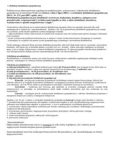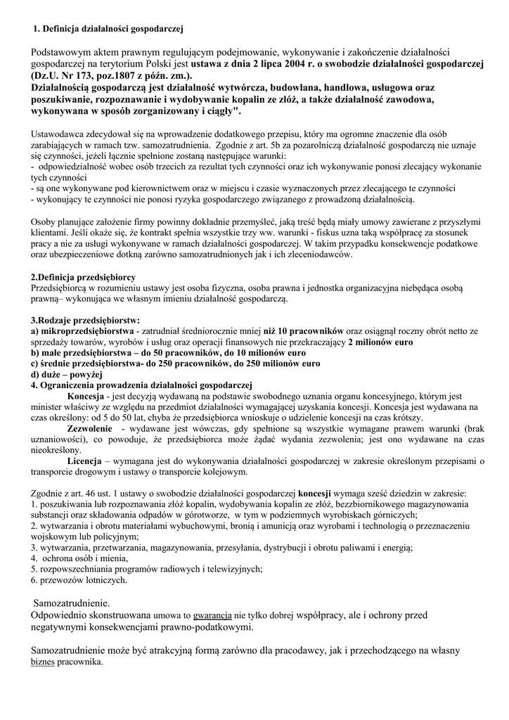1. Definicja działalności gospodarczej Podstawowym aktem prawnym regulującym podejmowanie, wykonywanie i zakończenie działalności gospodarczej na terytorium Polski jest ustawa z dnia 2 lipca 2004 r. o swobodzie działalności gospodarczej (Dz.U. Nr 173, poz.1807 z późn. zm.). Działalnością gospodarczą jest działalność wytwórcza, budowlana, handlowa, usługowa oraz poszukiwanie, rozpoznawanie i wydobywanie kopalin ze złóż, a także działalność zawodowa, wykonywana w sposób zorganizowany i ciągły". Ustawodawca zdecydował się na wprowadzenie dodatkowego przepisu, który ma ogromne znaczenie dla osób zarabiających w ramach tzw. samozatrudnienia. Zgodnie z art. 5b za pozarolniczą działalność gospodarczą nie uznaje się czynności, jeżeli łącznie spełnione zostaną następujące warunki: - odpowiedzialność wobec osób trzecich za rezultat tych czynności oraz ich wykonywanie ponosi zlecający wykonanie tych czynności - są one wykonywane pod kierownictwem oraz w miejscu i czasie wyznaczonych przez zlecającego te czynności - wykonujący te czynności nie ponosi ryzyka gospodarczego związanego z prowadzoną działalnością. Osoby planujące założenie firmy powinny dokładnie przemyśleć, jaką treść będą miały umowy zawierane z przyszłymi klientami. Jeśli okaże się, że kontrakt spełnia wszystkie trzy ww. warunki - fiskus uzna taką współpracę za stosunek pracy a nie za usługi wykonywane w ramach działalności gospodarczej. W takim przypadku konsekwencje podatkowe oraz ubezpieczeniowe dotkną zarówno samozatrudnionych jak i ich zleceniodawców. 2.Definicja przedsiębiorcy Przedsiębiorcą w rozumieniu ustawy jest osoba fizyczna, osoba prawna i jednostka organizacyjna niebędąca osobą prawną– wykonująca we własnym imieniu działalność gospodarczą. 3.Rodzaje przedsiębiorstw: a) mikroprzedsiębiorstwa - zatrudniał średniorocznie mniej niż 10 pracowników oraz osiągnął roczny obrót netto ze sprzedaży towarów, wyrobów i usług oraz operacji finansowych nie przekraczający 2 milionów euro b) małe przedsiębiorstwa – do 50 pracowników, do 10 milionów euro c) średnie przedsiębiorstwa- do 250 pracowników, do 250 milionów euro d) duże – powyżej 4. Ograniczenia prowadzenia działalności gospodarczej Koncesja - jest decyzją wydawaną na podstawie swobodnego uznania organu koncesyjnego, którym jest minister właściwy ze względu na przedmiot działalności wymagającej uzyskania koncesji. Koncesja jest wydawana na czas określony: od 5 do 50 lat, chyba że przedsiębiorca wnioskuje o udzielenie koncesji na czas krótszy. Zezwolenie - wydawane jest wówczas, gdy spełnione są wszystkie wymagane prawem warunki (brak uznaniowości), co powoduje, że przedsiębiorca może żądać wydania zezwolenia; jest ono wydawane na czas nieokreślony. Licencja – wymagana jest do wykonywania działalności gospodarczej w zakresie określonym przepisami o transporcie drogowym i ustawy o transporcie kolejowym. Zgodnie z art. 46 ust. 1 ustawy o swobodzie działalności gospodarczej koncesji wymaga sześć dziedzin w zakresie: 1. poszukiwania lub rozpoznawania złóż kopalin, wydobywania kopalin ze złóż, bezzbiornikowego magazynowania substancji oraz składowania odpadów w górotworze, w tym w podziemnych wyrobiskach górniczych; 2. wytwarzania i obrotu materiałami wybuchowymi, bronią i amunicją oraz wyrobami i technologią o przeznaczeniu wojskowym lub policyjnym; 3. wytwarzania, przetwarzania, magazynowania, przesyłania, dystrybucji i obrotu paliwami i energią; 4. ochrona osób i mienia, 5. rozpowszechniania programów radiowych i telewizyjnych; 6. przewozów lotniczych. Samozatrudnienie. Odpowiednio skonstruowana umowa to gwarancja nie tylko dobrej współpracy, ale i ochrony przed negatywnymi konsekwencjami prawno-podatkowymi. Samozatrudnienie może być atrakcyjną formą zarówno dla pracodawcy, jak i przechodzącego na własny biznes pracownika. Pracodawca: mniej papierków, niższe koszty Samozatrudnienie to tania i elastyczna forma „zatrudniania". Pracodawca rozlicza jedynie wystawiane przez „samozatrudnionego" faktury, nie musi martwić się o ZUSy czy podatki tej osoby. Łatwiej jest się z taką osobą rozstać czy powierzyć jej inne zadania (nowe zlecenie). Samozatrudniony sam dba o swoje miejsce pracy. Samozatrudniony: więcej na rękę Osoby działające w ramach jednoosobowej działalności gospodarczej płacą na ogół niższy ZUS, niż wynikało by to z umowy o pracę. Dodatkowo mogą wybrać ulgę na ZUS, a podatek płacić wg stałej, 19% stawki. Obniżeniu podatku sprzyja możliwość rozliczania kosztów uzyskania przychodów (np. zakup komputera, samochodu, mebli do biura). Takiej możliwości nie mają tradycyjni pracownicy.