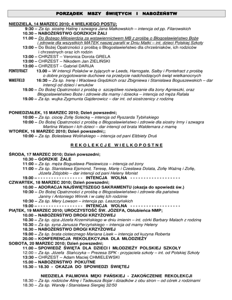 PORZĄDEK MSZY ŚWIĘTYCH IĘTYCH I NABOŻEŃSTW NIEDZIELA, 14 MARZEC 2010; 4 WIELKIEGO POSTU; 9:30 – Za śp. siostrę Halinę i szwagra Jana Małkowskich – intencja od pp. Filarowskich 10.30 – NABOŻEŃSTWO GORZKICH ŻALI 11.00 – Do Bożego Miłosierdzia za wstawiennictwem MB z prośbą o Błogosławieństwo Boże i zdrowie dla wszystkich MATEK naszej parafii w Dniu Matki – int. dzieci Polskiej Szkoły 13:00 – Do Bożej Opatrzności z prośbą o Błogosławieństwo dla chrześniaków, ich rodziców i chrzestnych oraz ich rodzin 13:00 – CHRZEST – Veronica Dorota GRELA 13:00 – CHRZEST – Nikodem Jan ZIELIŃSKI 13:00 – CHRZEST – Gabriel DARIJA PONTEFRACT 13.00 – W intencji Polaków w żyjących w Leeds, Harrogate, Salby i Pontefract z prośbą o dobre przygotowanie duchowe na przeżycie nadchodzących świąt wielkanocnych WAKEFIELD 16:30 – Za śp. Irenę i Wacława Grądzkich oraz Zbigniewa i Stanisława Boguszewskich – dar intencji od dzieci i wnuków 19.00 – Do Bożej Opatrzności z prośbą o szczęśliwe rozwiązanie dla żony Agnieszki, oraz Błogosławieństwo Boże i zdrowie dla mamy i dziecka – intencja od męża Rafała 19.00 – Za śp. wujka Zygmunta Gajderowicz – dar int. od siostrzenicy z rodziną PONIEDZIAŁEK, 15 MARZEC 2010; Dzień powszedni; 10:00 – Za śp. ciocię Zofię Solecką – intencja od Ryszarda Tybińskiego 10:00 – Do Bożej Opatrzności z prośbą o Błogosławieństwo i zdrowie dla siostry Irmy i szwagra Martina Watson i Ich dzieci – dar intencji od brata Waldemara z mamą WTOREK, 16 MARZEC 2010; Dzień powszedni;; 10:00 – Za śp. Bolesława Wolińskiego – intencja od pani Elżbiety Druś REKOLEKCJE WIELKOPOSTNE ŚRODA, 17 MARZEC 2010; Dzień powszedni; 10.30 – GORZKIE ŻALE 11:00 – Za śp. męża Bogusława Piesiewicza – intencja od żony 11:00 – Za śp. Stanisława Ejsmond, Teresę, Marię i Czesława Dolata, Zofię Ważną i Zofię, Józefa Zdzjobło – dar intencji od pani Heleny Monist 19.00 – - - - - - - - - - - - - - - - - - INTENCJA WOLNA - - - - - - - - - - - - - - - - - - CZWARTEK, 18 MARZEC 2010; Dzień powszedni; 10.00 – ADORACJA NAJŚWIĘTSZEGO SAKRAMENTU (okazja do spowiedź św.) 10:30 – Do Bożej Opatrzności z prośbą o Błogosławieństwo i zdrowie dla państwa Janiny i Antoniego Winnik i w całej Ich rodzinie 10:30 – Za śp. Mery Lowson – intencja pp. Leszczyńskich 19.00 – - - - - - - - - - - - - - - - - - INTENCJA WOLNA - - - - - - - - - - - - - - - - - - PIĄTEK, 19 MARZEC 2010; UROCZYSTOŚĆ ŚW. JÓZEFA, Oblubieńca NMP; 10.00 – NABOŻEŃSTWO DROGI KRZYŻOWEJ 10.30 – Za śp. ojca Józefa Krzemińskiego w dniu imienin – int. córki Barbary Malach z rodziną 10.30 – Za śp. syna Janusza Perzyńskiego – intencja od mamy Heleny 18.30 – NABOŻEŃSTWO DROGI KRZYŻOWEJ 19.00 – Za śp. brata ciotecznego Mariana Lisek – intencja od kuzyna Roberta 20.00 – KONFERENCJA REKOLEKCYJNA DLA MŁODZIEŻY SOBOTA, 20 MARZEC 2010; Dzień powszedni; 11.00 – SPOWIEDŹ ŚWIĘTA DLA DZIECI I MŁODZIEŻY POLSKIEJ SZKOŁY 12.00 – Za śp. Józefa Stańczyka – Prezesa SPK - przyjaciela szkoły – int. od Polskiej Szkoły 13:30 – CHRZEST – Adam Maciej CHMIELEWSKI 15.00 – NABOŻEŃSTWO POKUTNE 15.30 – 18.30 - OKAZJA DO SPOWIEDZI ŚWIĘTEJ NIEDZIELA PALMOWA MĘKI PAŃSKIEJ - ZAKOŃCZENIE REKOLEKCJI 18.30 – Za śp. rodziców Alinę i Tadeusza Bojar i dziadków z obu stron – od córek z rodzinami 18.30 – Za śp. Wandę i Stanisława Siergiej 32/50 NIEDZIELA, 21 MARZEC 2010; 5 WIELKIEGO POSTU; 9:30 – Za śp. mamę Bolesławę Obuch w 2. rocznicę śmierci i zmarłych z rodziny Obuch – intencja córki Emilii z rodziną 9:30 – Do Bożej Opatrzności z prośbą o Błogosławieństwo i zdrowie dla Hanny Skorek w rocznicę chrztu świętego, oraz dla jej rodziców Jarosława i Magdaleny oraz rodziców chrzestnych 10.30 – NABOŻEŃSTWO GORZKICH ŻALI 11.00 – Za śp. tatę Józefa Kłosińskiego – intencja od córki z rodziną 11:00 – Do Bożej Opatrzności z prośbą o Błogosławieństwo i zdrowie dla Davida Magiera w rocznicę chrztu świętego, oraz dla jego rodziców i rodziców chrzestnych HARROGATE 16.30 – Za śp. dziadka Andrzeja Król w 8 rocz. śmierci, babcię Antoninę Król – intencja od wnuczki Beaty z rodziną WAKEFIELD 16:30 – Do Bożej Opatrzności z prośbą o Błogosławieństwo dla chrześniaka, jego rodziców Remigiusza i Anny oraz chrzestnych WAKEFIELD 16:30 – CHRZEST – Amelia Elizabeth ROGOWSKA 19.00 – Za śp. Stefana Nowika w rocznicę śmierci – dar intencji od Alicji Player z dziećmi OGŁOSZENIA DUSZPASTERSKIE * NIEDZIELA LAETARE - Powagę Wielkiego Postu przerywa na chwilę dzisiejsza niedziela, którą nazywamy „niedzielą laetare”, czyli niedzielą radości. Nawet szaty liturgiczne mogą przybrać kolor różowy. Dawniej w Kościele tylko w tę niedzielę udzielano sakramentu kapłaństwa, a papież błogosławił róże na znak zwycięstwa wiosny nad zimą. W Anglii ta niedziela tradycyjnie jest Dniem Matki. * REKOLEKCJE WIELKOPOSTNE rozpoczniemy od środy 17 marca i zakończymy w niedziele 21 marca. Prowadzić je będzie Rektor Polskiej Misji Katolickiej Ks. Marian Łękawa. Prosimy Parafian o modlitwę w Jego intencji i liczny udział w nich. Spowiedź wielkanocna z udziałem spowiedników z sąsiednich parafii będzie w sobotę 20 marca. * ZBIÓRKA CHARYTATYWNA - NA PACZKI ŚWIĄTECZNE dla naszych chorych Parafian. Przeprowadzi ją w DZISIEJSZEJ NIEDZIELI – na II tacę Sekcja Charytatywna. Polecamy ją ofiarności Parafian. Jest to bardzo ważny wyraz pamięci i więzi z naszymi chorymi Rodakami – Fundatorami tej świątyni. Potraktujmy tę zbiórkę jako jałmużnę postną. * UROCZYSTOŚĆ ŚW. JÓZEFA - W piątek, 19 marca, Kościół będzie obchodził uroczystość świętego Józefa, Oblubieńca Najświętszej Maryi Panny i opiekuna Jezusa. W związku z tą uroczystością w najbliższy piątek nie 