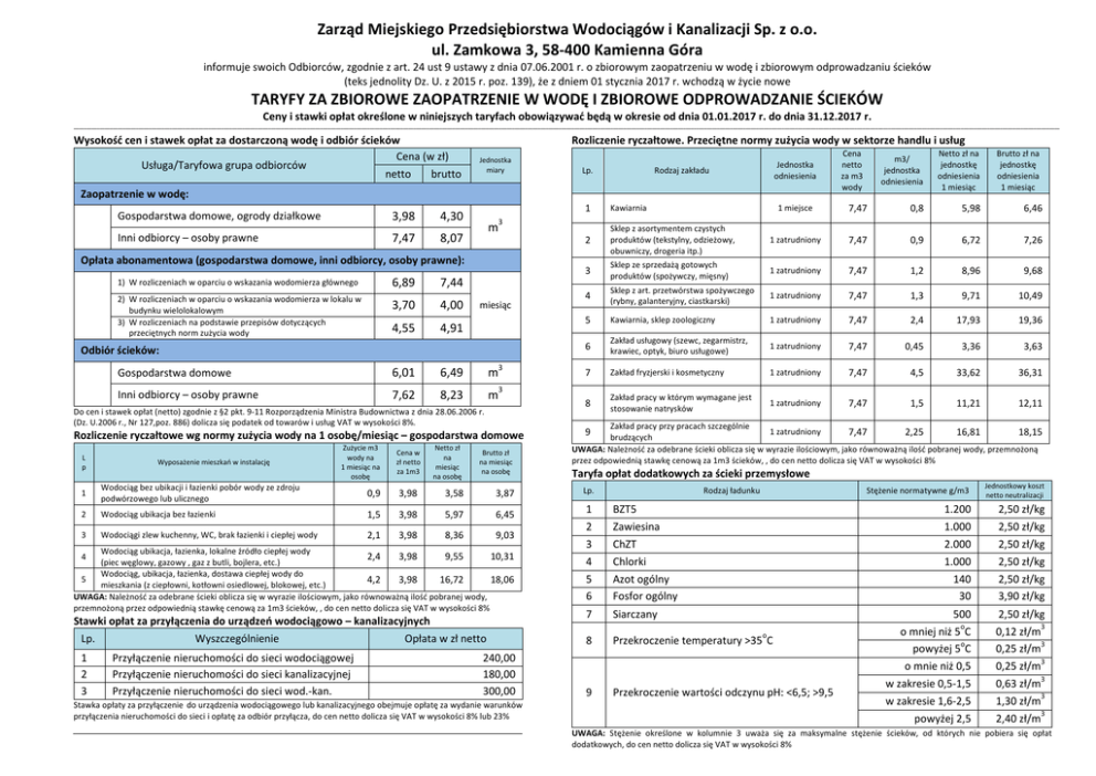 Zarząd Miejskiego Przedsiębiorstwa Wodociągów i Kanalizacji Sp. z o.o. ul. Zamkowa 3, 58-400 Kamienna Góra informuje swoich Odbiorców, zgodnie z art. 24 ust 9 ustawy z dnia 07.06.2001 r. o zbiorowym zaopatrzeniu w wodę i zbiorowym odprowadzaniu ścieków (teks jednolity Dz. U. z 2015 r. poz. 139), że z dniem 01 stycznia 2017 r. wchodzą w życie nowe TARYFY ZA ZBIOROWE ZAOPATRZENIE W WODĘ I ZBIOROWE ODPROWADZANIE ŚCIEKÓW Ceny i stawki opłat określone w niniejszych taryfach obowiązywać będą w okresie od dnia 01.01.2017 r. do dnia 31.12.2017 r. ____________________________________________________________________________________________________________________________________________________________________________________________________________________________________________________________________________________________________________________________________________________________________________________________ Wysokość cen i stawek opłat za dostarczoną wodę i odbiór ścieków Cena (w zł) Usługa/Taryfowa grupa odbiorców netto brutto Rozliczenie ryczałtowe. Przeciętne normy zużycia wody w sektorze handlu i usług Jednostka miary Lp. Jednostka odniesienia Rodzaj zakładu Zaopatrzenie w wodę: Gospodarstwa domowe, ogrody działkowe 3,98 4,30 Inni odbiorcy – osoby prawne 7,47 8,07 6,89 7,44 2) W rozliczeniach w oparciu o wskazania wodomierza w lokalu w budynku wielolokalowym 3) W rozliczeniach na podstawie przepisów dotyczących przeciętnych norm zużycia wody 3,70 4,00 4,55 4,91 6,01 7,62 Inni odbiorcy – osoby prawne miesiąc 3 6,49 m 8,23 m Rozliczenie ryczałtowe wg normy zużycia wody na 1 osobę/miesiąc – gospodarstwa domowe Wyposażenie mieszkań w instalację Zużycie m3 wody na 1 miesiąc na osobę Cena w zł netto za 1m3 Netto zł na miesiąc na osobę Brutto zł na miesiąc na osobę 1 Wodociąg bez ubikacji i łazienki pobór wody ze zdroju podwórzowego lub ulicznego 0,9 3,98 3,58 3,87 2 Wodociąg ubikacja bez łazienki 1,5 3,98 5,97 6,45 3 Wodociągi zlew kuchenny, WC, brak łazienki i ciepłej wody 2,1 3,98 8,36 9,03 Wodociąg ubikacja, łazienka, lokalne źródło ciepłej wody 4 2,4 3,98 9,55 10,31 (piec węglowy, gazowy , gaz z butli, bojlera, etc.) Wodociąg, ubikacja, łazienka, dostawa ciepłej wody do 5 4,2 3,98 16,72 18,06 mieszkania (z ciepłowni, kotłowni osiedlowej, blokowej, etc.) UWAGA: Należność za odebrane ścieki oblicza się w wyrazie ilościowym, jako równoważną ilość pobranej wody, przemnożoną przez odpowiednią stawkę cenową za 1m3 ścieków, , do cen netto dolicza się VAT w wysokości 8% Stawki opłat za przyłączenia do urządzeń wodociągowo – kanalizacyjnych Lp. 1 2 3 Wyszczególnienie Przyłączenie nieruchomości do sieci wodociągowej Przyłączenie nieruchomości do sieci kanalizacyjnej Przyłączenie nieruchomości do sieci wod.-kan. Opłata w zł netto 240,00 180,00 300,00 Stawka opłaty za przyłączenie do urządzenia wodociągowego lub kanalizacyjnego obejmuje opłatę za wydanie warunków przyłączenia nieruchomości do sieci i opłatę za odbiór przyłącza, do cen netto dolicza się VAT w wysokości 8% lub 23% Netto zł na jednostkę odniesienia 1 miesiąc Brutto zł na jednostkę odniesienia 1 miesiąc 7,47 0,8 5,98 6,46 Sklep z asortymentem czystych produktów (tekstylny, odzieżowy, obuwniczy, drogeria itp.) 1 zatrudniony 7,47 0,9 6,72 7,26 3 Sklep ze sprzedażą gotowych produktów (spożywczy, mięsny) 1 zatrudniony 7,47 1,2 8,96 9,68 4 Sklep z art. przetwórstwa spożywczego (rybny, galanteryjny, ciastkarski) 1 zatrudniony 7,47 1,3 9,71 10,49 5 Kawiarnia, sklep zoologiczny 1 zatrudniony 7,47 2,4 17,93 19,36 6 Zakład usługowy (szewc, zegarmistrz, krawiec, optyk, biuro usługowe) 1 zatrudniony 7,47 0,45 3,36 3,63 7 Zakład fryzjerski i kosmetyczny 1 zatrudniony 7,47 4,5 33,62 36,31 8 Zakład pracy w którym wymagane jest stosowanie natrysków 1 zatrudniony 7,47 1,5 11,21 12,11 3 Do cen i stawek opłat (netto) zgodnie z §2 pkt. 9-11 Rozporządzenia Ministra Budownictwa z dnia 28.06.2006 r. (Dz. U.2006 r., Nr 127,poz. 886) dolicza się podatek od towarów i usług VAT w wysokości 8%. L p 2 m3/ jednostka odniesienia 1 miejsce m Odbiór ścieków: Gospodarstwa domowe Kawiarnia 3 Opłata abonamentowa (gospodarstwa domowe, inni odbiorcy, osoby prawne): 1) W rozliczeniach w oparciu o wskazania wodomierza głównego 1 Cena netto za m3 wody Zakład pracy przy pracach szczególnie 1 zatrudniony 7,47 2,25 16,81 18,15 brudzących UWAGA: Należność za odebrane ścieki oblicza się w wyrazie ilościowym, jako równoważną ilość pobranej wody, przemnożoną przez odpowiednią stawkę cenową za 1m3 ścieków, , do cen netto dolicza się VAT w wysokości 8% 9 Taryfa opłat dodatkowych za ścieki przemysłowe Lp. Rodzaj ładunku 1 2 3 4 5 6 7 BZT5 Zawiesina ChZT Chlorki Azot ogólny Fosfor ogólny Siarczany 8 Przekroczenie temperatury >35 C 9 Przekroczenie wartości odczynu pH: <6,5; >9,5 o Stężenie normatywne g/m3 Jednostkowy koszt netto neutralizacji 1.200 1.000 2.000 1.000 140 30 500 o o mniej niż 5 C o powyżej 5 C o mnie niż 0,5 w zakresie 0,5-1,5 w zakresie 1,6-2,5 powyżej 2,5 2,50 zł/kg 2,50 zł/kg 2,50 zł/kg 2,50 zł/kg 2,50 zł/kg 3,90 zł/kg 2,50 zł/kg 3 0,12 zł/m 3 0,25 zł/m 3 0,25 zł/m 3 0,63 zł/m 3 1,30 zł/m 3 2,40 zł/m UWAGA: Stężenie określone w kolumnie 3 uważa się za maksymalne stężenie ścieków, od których nie pobiera się opłat dodatkowych, do cen netto dolicza się VAT w wysokości 8%
