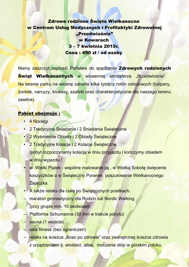 Zdrowe rodzinne Święta Wielkanocne w Centrum Usług Medycznych i Profilaktyki Zdrowotnej „Przedwiośnie” w Kowarach 3 – 7 kwietnia 2015r. Cena : 490 zł / od osoby Mamy zaszczyt zaprosić Państwa do spędzenia Zdrowych rodzinnych Świąt Wielkanocnych w wiosennej atmosferze „Przedwiośnia”. Na terenie parku na wiosnę zakwita kilka tysięcy roślin cebulowych (tulipany, żonkile, narcyzy, krokusy, szafirki oraz charakterystyczne dla naszego terenu zawilce). Pakiet obejmuje : • 4 Noclegi • 2 Tradycyjne Śniadania i 2 Śniadania Świąteczne • 2 Wyśmienite Obiady i 2 Obiady Świąteczne • 2 Tradycyjne Kolacje i 2 Kolacje Świąteczne /pobyt rozpoczynamy kolacją w dniu przyjazdu i kończymy obiadem w dniu wyjazdu / • w Wielki Piątek - wspólne malowanie jaj , w Wielką Sobotę święcenie koszyczków a w Świąteczny Poranek poszukiwanie Wielkanocnego Zajączka. • A także relaks dla ciała po Świątecznych posiłkach: – maraton gimnastyczny dla Rodzin lub Nordic Walking (przy grupie min. 10 osobowej) – Platforma Schumanna (30 min w trakcie pobytu) – sauna (1 wejście) – sala fitness (bez ograniczeń) – relaks na ścieżce „Boso po zdrowie” oraz zewnętrznej ścieżce zdrowia z urządzeniami tj. wioślarz, atlas, moczenie stóp w górskim potoku – bezpłatny dostęp do bufetu z kawą i herbatą – bezpłatny dostęp do internetu wi-fi Za dodatkowa opłatą: • Wycieczka fakultatywna autokarowa w cenie 100 zł za osobę (przy minimum dziesięcioosobowej grupie chętnych) w godzinach od 10.00 do 17.00 – obejmuje: Park Miniatur, Sztolnie Kowarskie , Kowarska Starówka, Dolina Pałaców i Ogrodów. Cena obejmuje przewóz autokarem, bilety wstępu, opiekę przewodnika i opiekuna grupy oraz suchy prowiant. • Czworonożni przyjaciele mile widziani – 5 zł/doba Z nami poczujecie Państwo prawdziwie wiosenną atmosferę... Przedwiośnia. Rezerwacja w recepcji CUMiPZ „Przedwiośnie” w Kowarach pod nr tel 75 718 22 03/ e-mail: [email protected] Honorujemy legitymacje służbowe, emerytalne i rencisty lub aktualne zaświadczenie pracy w służbach mundurowych, które upoważniają do 10% zniżki za noclegi