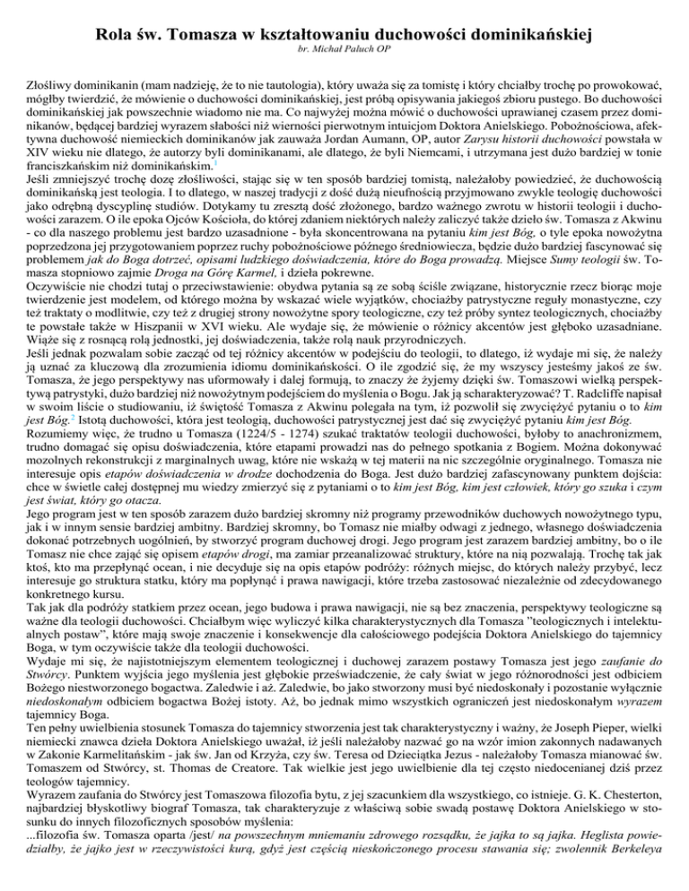 Rola św. Tomasza w kształtowaniu duchowości dominikańskiej br. Michał Paluch OP Złośliwy dominikanin (mam nadzieję, że to nie tautologia), który uważa się za tomistę i który chciałby trochę po prowokować, mógłby twierdzić, że mówienie o duchowości dominikańskiej, jest próbą opisywania jakiegoś zbioru pustego. Bo duchowości dominikańskiej jak powszechnie wiadomo nie ma. Co najwyżej można mówić o duchowości uprawianej czasem przez dominikanów, będącej bardziej wyrazem słabości niż wierności pierwotnym intuicjom Doktora Anielskiego. Pobożnościowa, afektywna duchowość niemieckich dominikanów jak zauważa Jordan Aumann, OP, autor Zarysu historii duchowości powstała w XIV wieku nie dlatego, że autorzy byli dominikanami, ale dlatego, że byli Niemcami, i utrzymana jest dużo bardziej w tonie franciszkańskim niż dominikańskim.1 Jeśli zmniejszyć trochę dozę złośliwości, stając się w ten sposób bardziej tomistą, należałoby powiedzieć, że duchowością dominikańską jest teologia. I to dlatego, w naszej tradycji z dość dużą nieufnością przyjmowano zwykle teologię duchowości jako odrębną dyscyplinę studiów. Dotykamy tu zresztą dość złożonego, bardzo ważnego zwrotu w historii teologii i duchowości zarazem. O ile epoka Ojców Kościoła, do której zdaniem niektórych należy zaliczyć także dzieło św. Tomasza z Akwinu - co dla naszego problemu jest bardzo uzasadnione - była skoncentrowana na pytaniu kim jest Bóg, o tyle epoka nowożytna poprzedzona jej przygotowaniem poprzez ruchy pobożnościowe późnego średniowiecza, będzie dużo bardziej fascynować się problemem jak do Boga dotrzeć, opisami ludzkiego doświadczenia, które do Boga prowadzą. Miejsce Sumy teologii św. Tomasza stopniowo zajmie Droga na Górę Karmel, i dzieła pokrewne. Oczywiście nie chodzi tutaj o przeciwstawienie: obydwa pytania są ze sobą ściśle związane, historycznie rzecz biorąc moje twierdzenie jest modelem, od którego można by wskazać wiele wyjątków, chociażby patrystyczne reguły monastyczne, czy też traktaty o modlitwie, czy też z drugiej strony nowożytne spory teologiczne, czy też próby syntez teologicznych, chociażby te powstałe także w Hiszpanii w XVI wieku. Ale wydaje się, że mówienie o różnicy akcentów jest głęboko uzasadniane. Wiąże się z rosnącą rolą jednostki, jej doświadczenia, także rolą nauk przyrodniczych. Jeśli jednak pozwalam sobie zacząć od tej różnicy akcentów w podejściu do teologii, to dlatego, iż wydaje mi się, że należy ją uznać za kluczową dla zrozumienia idiomu dominikańskości. O ile zgodzić się, że my wszyscy jesteśmy jakoś ze św. Tomasza, że jego perspektywy nas uformowały i dalej formują, to znaczy że żyjemy dzięki św. Tomaszowi wielką perspektywą patrystyki, dużo bardziej niż nowożytnym podejściem do myślenia o Bogu. Jak ją scharakteryzować? T. Radcliffe napisał w swoim liście o studiowaniu, iż świętość Tomasza z Akwinu polegała na tym, iż pozwolił się zwyciężyć pytaniu o to kim jest Bóg.2 Istotą duchowości, która jest teologią, duchowości patrystycznej jest dać się zwyciężyć pytaniu kim jest Bóg. Rozumiemy więc, że trudno u Tomasza (1224/5 - 1274) szukać traktatów teologii duchowości, byłoby to anachronizmem, trudno domagać się opisu doświadczenia, które etapami prowadzi nas do pełnego spotkania z Bogiem. Można dokonywać mozolnych rekonstrukcji z marginalnych uwag, które nie wskażą w tej materii na nic szczególnie oryginalnego. Tomasza nie interesuje opis etapów doświadczenia w drodze dochodzenia do Boga. Jest dużo bardziej zafascynowany punktem dojścia: chce w świetle całej dostępnej mu wiedzy zmierzyć się z pytaniami o to kim jest Bóg, kim jest człowiek, który go szuka i czym jest świat, który go otacza. Jego program jest w ten sposób zarazem dużo bardziej skromny niż programy przewodników duchowych nowożytnego typu, jak i w innym sensie bardziej ambitny. Bardziej skromny, bo Tomasz nie miałby odwagi z jednego, własnego doświadczenia dokonać potrzebnych uogólnień, by stworzyć program duchowej drogi. Jego program jest zarazem bardziej ambitny, bo o ile Tomasz nie chce zająć się opisem etapów drogi, ma zamiar przeanalizować struktury, które na nią pozwalają. Trochę tak jak ktoś, kto ma przepłynąć ocean, i nie decyduje się na opis etapów podróży: różnych miejsc, do których należy przybyć, lecz interesuje go struktura statku, który ma popłynąć i prawa nawigacji, które trzeba zastosować niezależnie od zdecydowanego konkretnego kursu. Tak jak dla podróży statkiem przez ocean, jego budowa i prawa nawigacji, nie są bez znaczenia, perspektywy teologiczne są ważne dla teologii duchowości. Chciałbym więc wyliczyć kilka charakterystycznych dla Tomasza ”teologicznych i intelektualnych postaw”, które mają swoje znaczenie i konsekwencje dla całościowego podejścia Doktora Anielskiego do tajemnicy Boga, w tym oczywiście także dla teologii duchowości. Wydaje mi się, że najistotniejszym elementem teologicznej i duchowej zarazem postawy Tomasza jest jego zaufanie do Stwórcy. Punktem wyjścia jego myślenia jest głębokie przeświadczenie, że cały świat w jego różnorodności jest odbiciem Bożego niestworzonego bogactwa. Zaledwie i aż. Zaledwie, bo jako stworzony musi być niedoskonały i pozostanie wyłącznie niedoskonałym odbiciem bogactwa Bożej istoty. Aż, bo jednak mimo wszystkich ograniczeń jest niedoskonałym wyrazem tajemnicy Boga. Ten pełny uwielbienia stosunek Tomasza do tajemnicy stworzenia jest tak charakterystyczny i ważny, że Joseph Pieper, wielki niemiecki znawca dzieła Doktora Anielskiego uważał, iż jeśli należałoby nazwać go na wzór imion zakonnych nadawanych w Zakonie Karmelitańskim - jak św. Jan od Krzyża, czy św. Teresa od Dzieciątka Jezus - należałoby Tomasza mianować św