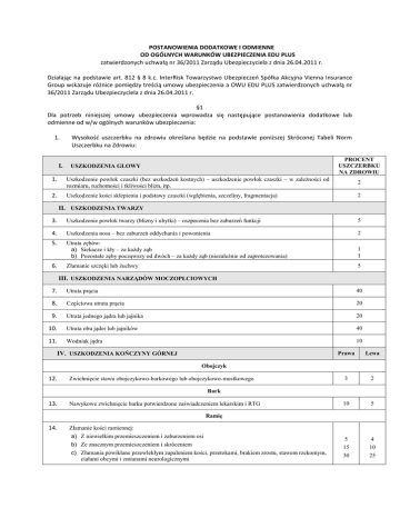 POSTANOWIENIA DODATKOWE I ODMIENNE OD OGÓLNYCH WARUNKÓW UBEZPIECZENIA EDU PLUS zatwierdzonych uchwałą nr 36/2011 Zarządu Ubezpieczyciela z dnia 26.04.2011 r. Działając na podstawie art. 812 § 8 k.c. InterRisk Towarzystwo Ubezpieczeń Spółka Akcyjna Vienna Insurance Group wskazuje różnice pomiędzy treścią umowy ubezpieczenia a OWU EDU PLUS zatwierdzonych uchwałą nr 36/2011 Zarządu Ubezpieczyciela z dnia 26.04.2011 r. §1 Dla potrzeb niniejszej umowy ubezpieczenia wprowadza się następujące postanowienia dodatkowe lub odmienne od w/w ogólnych warunków ubezpieczenia: 1. I. Wysokość uszczerbku na zdrowiu określana będzie na podstawie poniższej Skróconej Tabeli Norm Uszczerbku na Zdrowiu: PROCENT USZCZERBKU NA ZDROWIU USZKODZENIA GŁOWY 1. Uszkodzenie powłok czaszki (bez uszkodzeń kostnych) – uszkodzenie powłok czaszki – w zależności od rozmiaru, ruchomości i tkliwości blizn, itp. 2 2. Uszkodzenie kości sklepienia i podstawy czaszki (wgłębienia, szczeliny, fragmentacja) 2 II. USZKODZENIA TWARZY 3. Uszkodzenie powłok twarzy (blizny i ubytki) – oszpecenia bez zaburzeń funkcji 5 4. Uszkodzenia nosa – bez zaburzeń oddychania i powonienia 2 5. Utrata zębów: a) Siekacze i kły – za każdy ząb b) Pozostałe zęby począwszy od dwóch – za każdy ząb (niezależnie od zaprotezowania) 1 Złamanie szczęki lub żuchwy 5 6. 1 III. USZKODZENIA NARZĄDÓW MOCZOPŁCIOWYCH 7. Utrata prącia 40 8. Częściowa utrata prącia 20 9. Utrata jednego jądra lub jajnika 20 10. Utrata obu jąder lub jajników 40 11. Wodniak jądra 10 IV. USZKODZENIA KOŃCZYNY GÓRNEJ Prawa Lewa 3 2 10 5 5 15 30 4 10 25 Obojczyk 12. Zwichnięcie stawu obojczykowo-barkowego lub obojczykowo-mostkowego Bark 13. Nawykowe zwichnięcie barku potwierdzone zaświadczeniem lekarskim i RTG Ramię 14. Złamanie kości ramiennej: a) Z niewielkim przemieszczeniem i zaburzeniem osi b) Ze znacznym przemieszczeniem i skróceniem c) Złamania powikłane przewlekłym zapaleniem kości, przetokami, brakiem zrostu, stawem rzekomym, ciałami obcymi i zmianami neurologicznymi 15. Uszkodzenia mięśni, ścięgien i ich przyczepów 2 2 16. Przepukliny mięśniowe ramienia 1 1 3 12 2 10 2 10 2 10 3 10 20 2 8 15 Złamania i zwichnięcia kciuka (pierwszej kości śródręcza i paliczków kciuka): a) Zwichnięcia b) Złamania c) Złamania z dużym przemieszczeniem i zniekształceniem 1 4 10 1 2 8 Utraty w obrębie kciuka: a) Utrata opuszki b) Utrata paliczka paznokciowego c) Utrata obu paliczków z kością śródręcza 1 5 15 1 4 10 1 2 10 20 1 2 8 18 Utraty palca III, IV lub V: a) Utrata opuszki b) Utrata paliczka paznokciowego c) Utrata trzech paliczków 1 2,5 8 1 2 7 Utrata palców III, IV lub V z kością śródręcza 10 8 Staw łokciowy 17. Złamanie obwodowej nasady kości ramiennej: a) Bez większych przemieszczeń, zniekształceń i ograniczenia ruchomości b) Z dużym zniekształceniem i ze znacznym przykurczem Przedramię 18. Złamania w obrębie dalszych nasad jednej lub obu kości przedramienia, wyrostka łokciowego, głowy kości promiennej, powodujące ograniczenia ruchomości nadgarstka i zniekształcenia: a) Ze zniekształceniem b) Ze znacznym zniekształceniem, dużym ograniczeniem ruchomości i zmianami wtórnymi (troficze, krążeniowe, itp.) Nadgarstek 19. Ograniczenie ruchomości w obrębie nadgarstka w następstwie jego uszkodzeń (skręcenia, zwichnięcia, złamania kości nadgarstka, martwice aseptyczne tych kości): a) Ograniczenie ruchomości b) Ograniczenie ruchomości dużego stopnia c) Ograniczenie ruchomości dużego stopnia z ustawienie ręki czynnościowo niekorzystnym V. ŚRÓDRĘCZE I PALCE Kciuk 20. 21. Palec wskazujący 22. Utraty w obrębie palca wskazującego: a) Utrata opuszki b) Utrata paliczka paznokciowego c) Utrata trzech paliczków d) Utrata palca wskazującego z kością śródręcza Palec trzeci, czwarty i piąty 23. 24. VI. USZKODZENIE KOŃCZYNY DOLNEJ Udo 25. Złamanie kości udowej: a) b) c) 26. Z nieznacznymi zmianami Z miernymi zmianami i skróceniem od 4 do 6 cm Duże zmiany ze skróceniem ponad 6 cm 2 12 30 Uszkodzenia skóry, mięśni, ścięgien (oparzenia, przecięcia, pęknięcia podskórne, przepukliny mięśniowe, itp.) 4 Podudzie 27. Złamanie kości podudzia: a) Ze zmianami lub skróceniami do 4 cm b) Z dużymi wtórnymi zmianami lub ze skróceniem do 6 cm c) Ze skróceniem powyżej 6 cm lub bardzo rozległymi zmianami wtórnymi i z dodatkowymi powikłaniami w postaci przewlekłego zapalenia kości, zmian troficznych skóry z owrzodzeniami, stawów rzekomych, ubytków kostnych i zmian neurologicznych 4 15 25 28. Izolowane złamanie strzałki (oprócz kostki bocznej) 3 29. Uszkodzenie tkanek miękkich podudzia, uszkodzenia ścięgna Achillesa i innych ścięgien 5 Stawy skokowe, stopa 30. 31. 32. 33. Ograniczenie ruchomości i zniekształcenia w stawach skokowych (w następstwie wykręcenia, zwichnięcia, stłuczenia, złamania kości tworzących staw, zranień, ciał obcych, blizn, itp.): a) Niewielkiego stopnia b) Ze zniekształceniem, upośledzeniem funkcji ruchowej i statycznej stopy c) Powikłane przewlekłym zapaleniem kości stawu, przetokami, martwicą aseptyczną, zmianami neurologicznymi, itp. 2 10 25 Złamania kości piętowej lub skokowej z przemieszczeniem, zniekształceniem i innymi zmianami wtórnymi: a) Miernego stopnia – zależnie od wielkości zaburzeń czynnościowych b) Znacznego stopnia lub z powikłaniami – zależnie od wielkości zaburzeń czynnościowych 4 10 Uszkodzenia kości stępu z przemieszczeniem, zniekształceniami i innymi zmianami wtórnymi: a) Miernego stopnia b) Znacznego stopnia lub z innymi powikłaniami – zależnie od wielkości zaburzeń 3 10 Złamania kości śródstopia: a) Złamania I lub V kości śródstopia b) Złamania II, III lub IV kości śródstopia c) Złamanie trzech i więcej kości śródstopia 3 4 10 Palce stopy 34. Uszkodzenia palucha – (ubytki opuszki, utrata paliczka paznokciowego