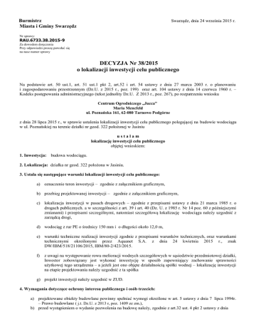 Burmistrz Miasta i Gminy Swarzędz Swarzędz, dnia 24 września 2015 r. Nr sprawy: RAU.6733.38.2015-9 Za dowodem doręczenia Przy odpowiedzi proszę powołać się na nasz numer sprawy DECYZJA Nr 38/2015 o lokalizacji inwestycji celu publicznego Na podstawie art. 50 ust.1, art. 51 ust.1 pkt 2, art.52 i art. 54 ustawy z dnia 27 marca 2003 r. o planowaniu i zagospodarowaniu przestrzennym (Dz.U. z 2015 r., poz. 199) oraz art. 104 ustawy z dnia 14 czerwca 1960 r. – Kodeks postępowania administracyjnego (tekst jednolity Dz.U. Z 2013 r., poz. 267), po rozpatrzeniu wniosku Centrum Ogrodniczego „Jucca” Maria Mencfeld ul. Poznańska 161, 62-080 Tarnowo Podgórne z dnia 28 lipca 2015 r., w sprawie ustalenia lokalizacji inwestycji celu publicznego polegającej na budowie wodociągu w ul. Poznańskiej na terenie działki nr geod. 322 położonej w Jasiniu ustalam lokalizację inwestycji celu publicznego objętej wnioskiem: 1. Inwestycja: budowa wodociągu. 2. Lokalizacja: działka nr geod. 322 położona w Jasiniu. 3. Ustala się następujące warunki lokalizacji inwestycji celu publicznego: a) oznaczenie teren inwestycji – zgodnie z załącznikiem graficznym, b) przebieg projektowanej inwestycji – zgodnie z załącznikiem graficznym, c) lokalizacja inwestycji w pasach drogowych – zgodnie z przepisami ustawy z dnia 21 marca 1985 r. o drogach publicznych. a w szczególności z art. 39 i art. 40 (Dz. U. z 1985 r. Nr 14 poz. 60 z późniejszymi zmianami) i przepisami szczególnymi, natomiast szczegółową lokalizację wodociągu należy uzgodnić z zarządcą drogi, d) wodociąg z rur PE o średnicy 150 mm i o długości około 12,0 m, e) warunki techniczne realizacji inwestycji zgodnie z przepisami warunków technicznych, oraz warunkami technicznymi określonymi przez Aquanet S.A. z dnia 24 kwietnia 2015 r., znak DW/IBM/518/21106/2015, IBM/80-2/423/2015. f) z uwagi na występowanie rowu melioracji wodnych szczegółowych w sąsiedztwie przedmiotowej działki, Inwestor zobowiązany jest wykonać inwestycję w sposób zapewniający zachowanie sprawności użytkowej tego urządzenia – a jeżeli jest ono objęte działalnością spółki wodnej – lokalizację inwestycji na etapie projektowania należy uzgodnić z ta spółka g) projekt inwestycji należy uzgodnić w ZUD. 4. Wymagania dotyczące ochrony interesu publicznego i osób trzecich: a) projektowane obiekty budowlane powinny spełniać wymogi określone w art. 5 ustawy z dnia 7 lipca 1994r. – Prawo budowlane ( j.t. Dz.U. z 2013 r, poz. 1409 ze zm.), b) przed wystąpieniem o wydanie pozwolenia na budowę należy, zgodnie z art.32 ust. 4 pkt 2 ustawy z dnia 07 lipca 1994r. - Prawo budowlane ( j.t. Dz.U. z 2013 r, poz. 1409 ze zm.) , posiadać prawo do dysponowania nieruchomością na cele budowlane, c) do wykonywania robót budowlanych można przystąpić po uzyskaniu pozwolenia na budowę od Starosty Poznańskiego, Poznań ul. Jackowskiego 18. UZASADNIENIE Stan faktyczny: Dnia 28 lipca 2015 r. został złożony wniosek w sprawie ustalenia lokalizacji inwestycji celu publicznego polegającej na budowie wodociągu w ul. Poznańskiej na terenie działki nr geod. 322 położonej w Jasiniu. W dniu 07 sierpnia 2015 r., sporządzono zawiadomienie o wszczęciu postępowania, znak RAU.6733.38.20151, oraz obwieszczenie o wszczęciu postępowania znak RAU.6733.38.2015-2. W dniu 11 sierpnia 2015 r. sporządzono projekt decyzji o lokalizacji inwestycji celu publicznego. W dniu 04 września 2015 r. zgodnie z art. 10 Kpa zawiadomiono strony postępowania o możliwości zapoznania się z całością akt zebranych w przedmiotowej sprawie oraz wniesienia ewentualnych uwag. Stan prawny: Stosownie do wymogów procedury administracyjnej (art. 10 kpa) wszystkie strony zostały zawiadomione o wszczęciu postępowania administracyjnego w niniejszej sprawie oraz o przysługujących im uprawnieniach, z których mogły korzystać bez ograniczeń, o wszczęciu postępowania poinformowano również w formie obwieszczenia. Wnioskowana inwestycja znajduje się na terenie nie objętym planem - miejscowy plan ogólny zagospodarowania przestrzennego gminy Swarzędz (uchwalony uchwałą XLIV/234/94 Rady Miejskiej w Swarzędzu z dnia 21.02.1994 roku) stracił bowiem ważność z dniem 01 stycznia 2003 roku. Działka stanowiąca teren inwestycji nie została ujęta w programie rolnym sporządzonym do planu miejscowego, jednak nie wymaga zgody na zmianę przeznaczenia gruntów rolnych na cele nierolnicze. Wobec powyższego postępowanie o wydanie niniejszej decyzji było prowadzone zgodnie z wymogami ustawy cytowanej na wstępie, jak dla terenu, dla którego brak jest planu zagospodarowania przestrzennego i dla inwestycji, dla której nie ma obowiązku sporządzania takiego planu. Przygotowanie projektu decyzji o lokalizacji celu publicznego poprzedza się badaniem podstawowych uwarunkowań prawnych i faktycznych, oraz przepisów odrębnych, które mogą wpłynąć na wydanie decyzji. Na podstawie wyników w/w analiz, a także opisu inwestycji przedstawionego we wniosku, ustalono powyższą lokalizację celu publicznego. Integralną część projektu decyzji stanowi załącznik graficzny w skali 1:500. Projekt decyzji został sporządzony przez osobę wpisaną na listę izby samorządu zawodowego architektów. W toku prowadzonego postępowania powiadomione strony nie wniosły uwag odnośnie planowanej inwestycji. Projekt został pozytywnie zaopiniowany przez organy uzgadniające. Wobec powyższego orzeczono jak w sentencji. Pouczenie: Od niniejszej decyzji służy stronom prawo wniesienia odwołania do Samorządowego Kolegium Odwoławczego w Poznaniu za pośrednictwem Burmistrza Miasta i Gminy Swarzędz, w terminie 14 dni od daty jej doręczenia. Warunkiem rozpoczęcia inwestycji jest spełnienie wymagań określonych w w/w ustawie Prawo budowlane i wydanych do niej przepisach szczególnych. Uwaga: Do wykonania robót można przystąpić po uzyskaniu pozwolenia na bu