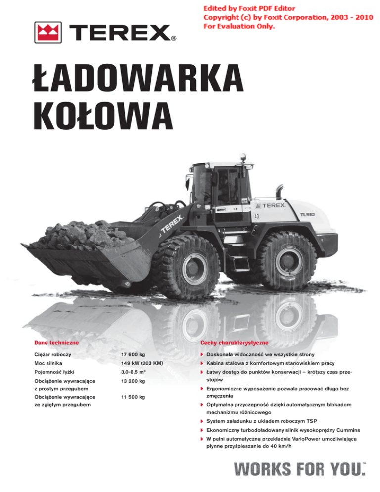 TL310 ŁADOWARKA KOŁOWA Dane techniczne Ciężar roboczy Cechy charakterystyczne 17 600 kg Doskonała widoczność we wszystkie strony Moc silnika 149 kW (203 KM) Kabina stalowa z komfortowym stanowiskiem pracy Pojemność łyżki 3,0-6,5 m3 Łatwy dostęp do punktów konserwacji – krótszy czas prze- Obciążenie wywracające 13 200 kg stojów z prostym przegubem Obciążenie wywracające ze zgiętym przegubem Ergonomiczne wyposażenie pozwala pracować długo bez 11 500 kg zmęczenia Optymalna przyczepność dzięki automatycznym blokadom mechanizmu różnicowego System załadunku z układem roboczym TSP Ekonomiczny turbodoładowany silnik wysokoprężny Cummins W pełni automatyczna przekładnia VarioPower umożliwiająca płynne przyśpieszanie do 40 km/h OPIS TECHNICZNY SILNIK Producent, model Typ Cykl pracy Pojemność skokowa Moc zgodnie z ISO 9249 przy 2200 min-1 Układ chłodzenia Cummins, QSB 6.7 6-cylindrowy silnik wysokoprężny z turbodoładowaniem, COM III/EPA III 4-suwowy, system wtryskowy Common Rail 6700 cm3 149 kW (203 KM) Woda INSTALACJA ELEKTRYCZNA Napięcie robocze Instalacja oświetleniowa zgodna z przepisami ruchu drogowego i normą europejską. 24 V UKŁAD HYDRAULICZNY UKŁAD PRZENIESIENIA NAPĘDU Hydrostatyczny napęd jazdy, zamknięty obieg, niezależny od hydrauliki ładowarki. Automatyka jazdy, tzn. automatyczna optymalizacja i adaptacja siły pociągowej i prędkości. Jednocześnie napęd jazdy działa w układzie zamkniętym jako niezużywający się hamulec roboczy. Regulacja silnika hydraulicznego w funkcji obciążenia umożliwia wybór jednego z dwóch zakresów prędkości. Płynna regulacja prędkości do przodu i do tyłu. Napęd na wszystkie koła przekazywany z przekładni redukcyjnej na tylnej osi przez wał przegubowy na przednią oś. Pedał hamulca z funkcją regulacji mocy do precyzyjnego sterowania jazdą i zatrzymywania przy wysokich obrotach silnika. 2 stopnie prędkości: „Zakres prędkości I“ 0-6 km/h „Zakres prędkości II“ 0-40 km/h OSIE Oś przednia: Oś z napędem planetarnym, sztywna. Samoblokujący mechanizm różnicowy 45%. Oś tylna: Oś z napędem planetarnym, ze zintegrowaną przekładnią redukcyjną, zawieszenie wahliwe, amortyzowana poduszkami gumowym. Samoblokujący mechanizm różnicowy 45%. Kąt wychylenia ±12° OPONY Rozmiar standardowy 23.5 R25 VJT Bridgestone HAMULCE Hamulec roboczy: Hamulec dodatkowy: Hamulec postojowy: Hydraulicznie uruchamiany 2-obiegowy hamulec ze wspomaganiem. Lamele w kąpieli olejowej w obu osiach, działające poprzez napęd na wszystkie cztery koła. Hydrostatyczny przez zamknięty obieg napędu jezdnego. Hamulec sprężynowy, działający na płytki hamulca osi tylnej. UKŁAD KIEROWNICZY W pełni hydrauliczny, proporcjonalnie działający przegub ładowarki. 2 siłowniki skrętu z obustronną amortyzacją pozycji końcowych, wspomagające wydajnie ruchy układu kierowniczego. Układ kierowniczy jest zasilany olejem w systemie Load Sensing; dzięki temu układ kierowniczy dysponuje w razie potrzeby ilością oleju hydrauliki roboczej, co umożliwia szybkie ruchy kierowania także przy małych obrotach silnika. Całkowity kąt skrętu 80° POJEMNOŚCI NAPEŁNIENIA Pojemność zbiornika paliwa Układ hydrauliczny (włącznie ze zbiornikiem) 240 l 135 l PARAMETRY EKSPLOATACYJNE, WYPOSAŻENIE STANDARDOWE Ciężar maszyny gotowej do pracy (ISO 6016) Ciężar własny Obciążenie wywracające z prostym przegubem (ISO 14397-1), montaż bezpośredni / szybkozłącze Obciążenie wywracające ze zgiętym przegubem (ISO 14397-1), montaż bezpośredni / szybkozłącze Długość całkowita, łyżka na podłożu Szerokość całkowita Promień skrętu na zewnętrznej krawędzi łyżki standardowej Promień skrętu na zewnętrznej krawędzi opony Promień skrętu na wewnętrznej krawędzi opony Rozstaw osi Wysokość z kabiną 17 600 kg 17300 kg 13200 / 12700 kg. 11500 / 11000 kg. 7600 mm 2680 mm 6475 mm 5900 mm 3065 mm 3250 mm 3400 mm Wydajność pompy 220 l/min Ciśnienie robocze 350 bar Urządzenie sterujące: 3-obiegowy blok sterowania z niezależnym rozdziałem natężenia przepływu (LUDV). Wszystkie ruchy są sterowalne równocześnie i niezależnie. Zakres precyzyjnego sterowania zachowany we wszystkich stanach obciążenia. Obiegi sterujące „podnoszenie/opuszczanie“, „przechylanie do góry/ do dołu“ wspomagane hydraulicznie. „Dodatkowy“ obwód sterowania jest uruchamiany elektrycznie z wstępnie wybieranym podziałem natężenia przepływu i pracą w trybie impulsowym i ciągłym. Dźwignia sterująca (dżojstik) ze zintegrowanym przełącznikiem kierunku jazdy i przełącznikiem dodatkowego obwodu sterującego. UKŁAD ZAŁADOWCZY Układ załadowczy z kinematyką TSP, bezpośredni montaż narzędzia. Łyżka załadowcza (ISO 7546) Udźwig łyżki załadowczej 3,0 m3, mechanizm szybkiej wymiany Udźwig łyżki załadowczej 3,1 m3, montaż bezpośredni Siła podnoszenia przy gruncie (ISO 14397-2) Siła skrawania (ISO 14397-2), układ szybkiej wymiany Siła skrawania (ISO 14397-2), montaż bezpośredni 3,10 m3 5400 kg 5580 kg 232 000 N 153 600 N PODNOŚNIK WIDŁOWY Udźwig (łączny zakres podnoszenia i skrętu) 9000 kg Szerokość wspornika wideł 1900 mm Długość zębów wideł (150x70 mm) 1200 mm Współczynnik stateczności 1,25 Wyznaczanie udźwigu użytecznego na równym podłożu = 80% obciążenia wywracającego ze zgiętym przegubem KABINA Demontowalna kabina chroniąca operatora na wypadek dachowania, z atestem ROPS wg ISO 3471, (z atestem FOPS wg ISO 3449, tylko z siatką dachową) Panoramiczne szyby z przyciemnianego szkła bezpiecznego, okno dachowe. 2 pary drzwi odchylanych o 180° oraz składane lusterka zewnętrzne. Po 2 reflektory robocze przednie i tylne. Seryjne okno przesuwne w lewych drzwiach. Wycieraczka elektryczna z cyklem przerywanym i spryskiwaczami z przodu i z tyłu. Ogrzewanie kabiny zależne od płynu chłodzącego silnik, 3-stopniowa dmuchawa