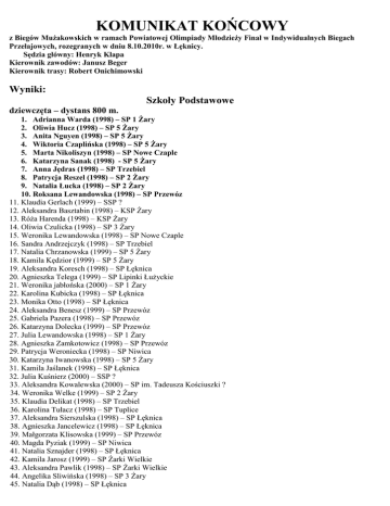 KOMUNIKAT KOŃCOWY z Biegów Mużakowskich w ramach Powiatowej Olimpiady Młodzieży Finał w Indywidualnych Biegach Przełajowych, rozegranych w dniu 8.10.2010r. w Łęknicy. Sędzia główny: Henryk Klapa Kierownik zawodów: Janusz Beger Kierownik trasy: Robert Onichimowski Wyniki: Szkoły Podstawowe dziewczęta – dystans 800 m. 1. Adrianna Warda (1998) – SP 1 Żary 2. Oliwia Hucz (1998) – SP 5 Żary 3. Anita Nguyen (1998) – SP 5 Żary 4. Wiktoria Czaplińska (1998) – SP 5 Żary 5. Marta Nikoliszyn (1998) – SP Nowe Czaple 6. Katarzyna Sanak (1998) - SP 5 Żary 7. Anna Jędras (1998) – SP Trzebiel 8. Patrycja Reszel (1998) – SP 2 Żary 9. Natalia Łucka (1998) – SP 2 Żary 10. Roksana Lewandowska (1998) – SP Przewóz 11. Klaudia Gerlach (1999) – SSP ? 12. Aleksandra Basztabin (1998) – KSP Żary 13. Róża Harenda (1998) – KSP Żary 14. Oliwia Czulicka (1998) – SP 3 Żary 15. Weronika Lewandowska (1998) – SP Nowe Czaple 16. Sandra Andrzejczyk (1998) – SP Trzebiel 17. Natalia Chrzanowska (1999) – SP 5 Żary 18. Kamila Kędzior (1999) – SP 5 Żary 19. Aleksandra Koresch (1998) – SP Łęknica 20. Agnieszka Telega (1999) – SP Lipinki Łużyckie 21. Weronika jabłońska (2000) – SP 1 Żary 22. Karolina Kubicka (1998) – SP Łęknica 23. Monika Otto (1998) – SP Łęknica 24. Aleksandra Benesz (1999) – SP Przewóz 25. Gabriela Pazera (1998) – SP Przewóz 26. Katarzyna Dolecka (1999) – SP Przewóz 27. Julia Lewandowska (1998) – SP 1 Żary 28. Agnieszka Zamkotowicz (1998) – SP Przewóz 29. Patrycja Weroniecka (1998) – SP Niwica 30. Katarzyna Iwanowska (1998) – SP 5 Żary 31. Kamila Jaślanek (1998) – SP Łęknica 32. Julia Kuśnierz (2000) – SSP ? 33. Aleksandra Kowalewska (2000) – SP im. Tadeusza Kościuszki ? 34. Weronika Welke (1999) – SP 2 Żary 35. Klaudia Delikat (1998) – SP Trzebiel 36. Karolina Tułacz (1998) – SP Tuplice 37. Aleksandra Sierszulska (1998) – SP Łęknica 38. Agnieszka Jancelewicz (1998) – SP Łęknica 39. Małgorzata Klisowska (1999) – SP Przewóz 40. Magda Pyziak (1999) – SP Niwica 41. Natalia Sznajder (1998) – SP Łęknica 42. Kamila Jarosz (1999) – SP Żarki Wielkie 43. Aleksandra Pawlik (1998) – SP Żarki Wielkie 44. Angelika Sliwińska (1998) – SP 3 Żary 45. Natalia Dąb (1998) – SP Łęknica 46. Patrycja Bogdan (1999) – SP 10 Żary 47. Aneta Krzosek (1998) – SP Łęknica 48. Alicja Lewicka (2000) – SP Tuplice 49. Emilia Kowalska (1998) – SP Tuplice 50. Dominika Bojko (1998) – SP Tuplice 51. Oliwia Izydorczyk (1998) – SP Łęknica 52. Wiktoria Brzęczek (1999) – SP Tuplice 53. Ewelina Popko (1999) – SP im. Tadeusza Kościuszki ? 54. Amelia Warchał (2000) – SP Tuplice 55. Sylwia Ciepła (1999) – SP Przewóz 56. Jagoda Kaszubska (1998) – SP Tuplice chłopcy – dystans 1000 m. 1. Adam Lorenc (1998) – SP 5 Żary 2. Michał Kulas (1998) – SP 5 Żary 3. Szymon Szklarz (1998) – SP 1 Żary 4. Norman Kremser (1998) – SP Łęknica 5. Mateusz Gajdemski (1998) – SP 1 Żary 6. Alan Żelazek (1999) – SP Nowe Czaple 7. Jakub Wojtczak (1998) – SP Nowe Czaple 8. Piotr Ratajczak (1998) – SP 2 Żary 9. Mateusz Zawadzki (1998) – SP Niwica 10. Filip Stępień (1998) – SP Przewóz 11. Kamil Ponichtera (1998) – SP Nowe Czaple 12. Marek Bardel (1998) – SP 3 Żary 13. Kamil Średniawa (1998) – SP 3 Żary 14. Michał Kępiński (1999) – SP 2 Żary 15. Maciej Filik (1998) – SP Żarki Wielkie 16. Tomasz Krupa (1999) – SP 1 Żary 17. Filip Olbryś (1998) – SP 5 Żary 18. Rafał Diduszko (1998) – SP Lipinki Łuż. 19. Karol Grześków (1998) – SP 5 Żary 20. Mateusz Szyszka (2000) – SP 10 Żary 21. Damian Gumiński (1998) – SP Trzebiel 22. Dariusz Ocimek (1998) – SP 3 Żary 23. Damian Kubacki (1998) – SP 5 Żary 24. Wojciech Weremko (1998) – SP 1 Żary 25. Michał Guldziński (1998) – SP 1 Żary 26. Dawid Chomicki (1999) – SP 10 Żary 27. Bartosz Zatoń (1998) – SPM Niwica 28. Saliko Stojanov (1998) – SP Łęknica 29. Szymon Fudali (1999) – SP Trzebiel 30. Mateusz Nocek (1998) – SP 5 Żary 31. Mateusz Izdebski (1998) – SP Lipinki Łuż. 32. Patryk Nikołajuk (2000) – SP Olbrachtów 33. Dawid Maj (1999) – SP Nowe Czaple 34. Mariusz Kopacki (2000) – SP Trzebiel 35. Piotr Dłużniewski (1998) – SP Przewóz 36. Mateusz Gembala (1998) – SP 5 Żary 37. Hubert Dobrzyniewski (2000) – SP Tuplice 38. Kacper Dąbrowski (1998) – SP 1 Żary 39. Dawid Pilkło (1998) – SP Tuplice 40. Kamil Judasz (1998) – SP Nowe Czaple 41. Sylwester Tylek (1998) – SP Lipinki Łuż. 42. Kacper Andraszak (1998) – SP Trzebiel 43. Adam Perski (1998) – SP Żarki Wielkie 44. Patryk Sałandziak (1999) – SP Olbrachtów 45. Nikodem Duszeńko (2000) – SP Tuplice 46. Daniel Medwediuk (1999) – SP Tuplice 47. Damian D ….. (1998) – SP Tuplice 48. Maciej Krawiec (1998) – SP Łęknica 49. Sebastian Nikołajuk (1999) – SP Olbrachtów 50. Paweł Kruszewski (1998) – SP 3 Żary 51. Jacek Chróściel (1998) – SP Tuplice 52. Damian Okraj (1998) – SP Łęknica 53. Łukasz Krysiński (1998) – SP Łęknica 54. Mikołaj Kubiak (1999) – SP Łęknica 55. Filip Urszyc (1999) – SP Łęknica 56. Daniel Adrer (1999) – SP Tuplice 57. Konrad Dąbrowski (1999) – SP Tuplice 58. Sebastian Mołos (1999) – SP Tuplice 59. Daniel Wilczyński (1998) – SP Łęknica 60. Jacek Kaszubski (1999) – SP Łęknica Gimnazja dziewczęta – dystans 1500 m. 1. Agnieszka Jawniak (1996) – Gim. 3 Żary 2. Sylwia Jawniak (1997) – Gim. 3 Żary 3. Alicja Zamkotowicz (1995) – Gim. Przewóz 4. Karolina Jawniak (1997) – Gim. 3 Żary 5. Laura Sękowska (1996) – Gim. Łęknica 6. Angelika Mesjasz (1996) – Gim. Przewóz 7. Kamila Mazur (1996) – Gim. 2 Żary 8. Kornela Nowak (1996) – Gim. 2 Żary 9. Paulina Drozdowska (1996) – Gim. 3 Żary 10. Justyna Chwedorzewska (1997) – Gim. Przewóz 11. Aleksandra Pachałko (1995) – Gim. 3 Żary 12. Ka
