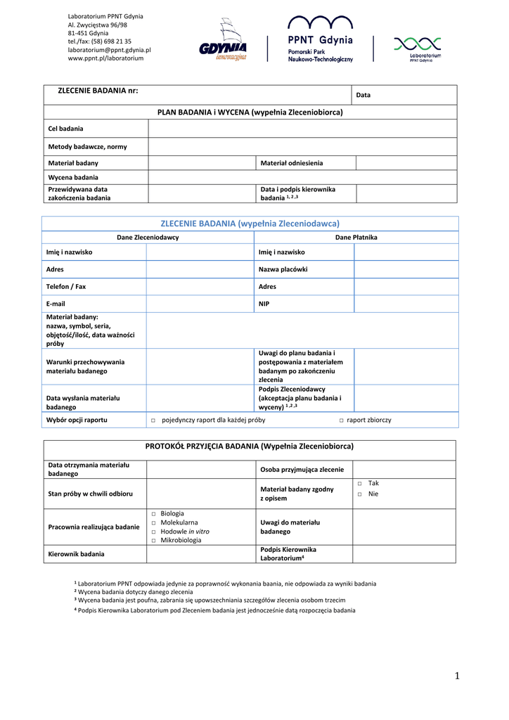 Laboratorium PPNT Gdynia Al. Zwycięstwa 96/98 81-451 Gdynia tel./fax: (58) 698 21 35 [email protected] www.ppnt.pl/laboratorium ZLECENIE BADANIA nr: Data PLAN BADANIA i WYCENA (wypełnia Zleceniobiorca) Cel badania Metody badawcze, normy Materiał badany Materiał odniesienia Wycena badania Przewidywana data zakończenia badania Data i podpis kierownika badania 1, 2 ,3 ZLECENIE BADANIA (wypełnia Zleceniodawca) Dane Zleceniodawcy Dane Płatnika Imię i nazwisko Imię i nazwisko Adres Nazwa placówki Telefon / Fax Adres E-mail NIP Materiał badany: nazwa, symbol, seria, objętość/ilość, data ważności próby Uwagi do planu badania i postępowania z materiałem badanym po zakończeniu zlecenia Podpis Zleceniodawcy (akceptacja planu badania i wyceny) 1 ,2 ,3 Warunki przechowywania materiału badanego Data wysłania materiału badanego Wybór opcji raportu □ pojedynczy raport dla każdej próby □ raport zbiorczy PROTOKÓŁ PRZYJĘCIA BADANIA (Wypełnia Zleceniobiorca) Data otrzymania materiału badanego Osoba przyjmująca zlecenie Stan próby w chwili odbioru Materiał badany zgodny z opisem Pracownia realizująca badanie Kierownik badania □ □ □ □ Biologia Molekularna Hodowle in vitro Mikrobiologia □ Tak □ Nie Uwagi do materiału badanego Podpis Kierownika Laboratorium4 1 Laboratorium PPNT odpowiada jedynie za poprawność wykonania baania, nie odpowiada za wyniki badania Wycena badania dotyczy danego zlecenia 3 Wycena badania jest poufna, zabrania się upowszechniania szczegółów zlecenia osobom trzecim 4 Podpis Kierownika Laboratorium pod Zleceniem badania jest jednocześnie datą rozpoczęcia badania 2 1