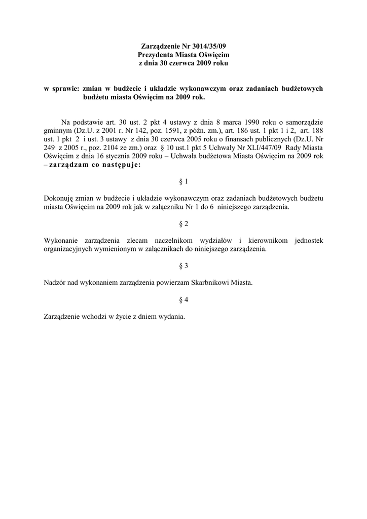 Zarządzenie Nr 3014/35/09 Prezydenta Miasta Oświęcim z dnia 30