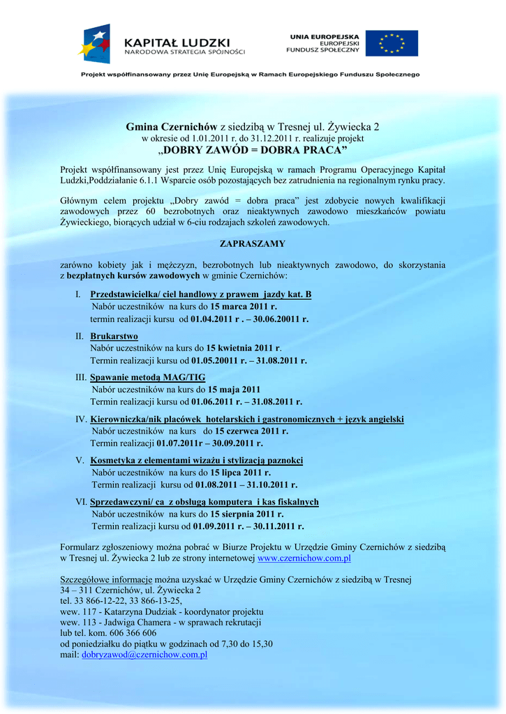 Gmina Czernichów z siedzibą w Tresnej ul. Żywiecka 2 w okresie od 1.01.2011 r. do 31.12.2011 r. realizuje projekt „DOBRY ZAWÓD = DOBRA PRACA” Projekt współfinansowany jest przez Unię Europejską w ramach Programu Operacyjnego Kapitał Ludzki,Poddziałanie 6.1.1 Wsparcie osób pozostających bez zatrudnienia na regionalnym rynku pracy. Głównym celem projektu „Dobry zawód = dobra praca” jest zdobycie nowych kwalifikacji zawodowych przez 60 bezrobotnych oraz nieaktywnych zawodowo mieszkańców powiatu Żywieckiego, biorących udział w 6-ciu rodzajach szkoleń zawodowych. ZAPRASZAMY zarówno kobiety jak i mężczyzn, bezrobotnych lub nieaktywnych zawodowo, do skorzystania z bezpłatnych kursów zawodowych w gminie Czernichów: I. Przedstawicielka/ ciel handlowy z prawem jazdy kat. B Nabór uczestników na kurs do 15 marca 2011 r. termin realizacji kursu od 01.04.2011 r . – 30.06.20011 r. II. Brukarstwo Nabór uczestników na kurs do 15 kwietnia 2011 r. Termin realizacji kursu od 01.05.20011 r. – 31.08.2011 r. III. Spawanie metodą MAG/TIG Nabór uczestników na kurs do 15 maja 2011 Termin realizacji kursu od 01.06.2011 r. – 31.08.2011 r. IV. Kierowniczka/nik placówek hotelarskich i gastronomicznych + język angielski Nabór uczestników na kurs do 15 czerwca 2011 r. Termin realizacji 01.07.2011r – 30.09.2011 r. V. Kosmetyka z elementami wizażu i stylizacją paznokci Nabór uczestników na kurs do 15 lipca 2011 r. Termin realizacji kursu od 01.08.2011 – 31.10.2011 r. VI. Sprzedawczyni/ ca z obsługą komputera i kas fiskalnych Nabór uczestników na kurs do 15 sierpnia 2011 r. Termin realizacji kursu od 01.09.2011 r. – 30.11.2011 r. Formularz zgłoszeniowy można pobrać w Biurze Projektu w Urzędzie Gminy Czernichów z siedzibą w Tresnej ul. Żywiecka 2 lub ze strony internetowej www.czernichow.com.pl Szczegółowe informacje można uzyskać w Urzędzie Gminy Czernichów z siedzibą w Tresnej 34 – 311 Czernichów, ul. Żywiecka 2 tel. 33 866-12-22, 33 866-13-25, wew. 117 - Katarzyna Dudziak - koordynator projektu wew. 113 - Jadwiga Chamera - w sprawach rekrutacji lub tel. kom. 606 366 606 od poniedziałku do piątku w godzinach od 7,30 do 15,30 mail: [email protected]