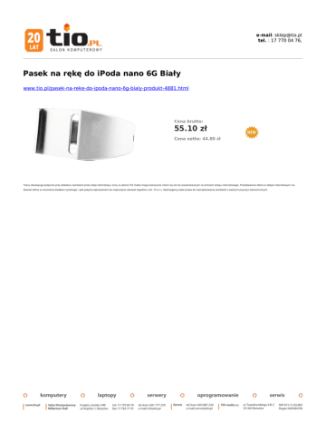 e-mail: [email protected] tel. : 17 770 04 76, Pasek na rękę do iPoda nano 6G Biały www.tio.pl/pasek-na-reke-do-ipoda-nano-6g-bialy-produkt-4881.html Cena brutto: 55.10 zł Cena netto: 44.80 zł *Ceny obowiązują wyłącznie przy składaniu zamówień przez sklep internetowy. Ceny w salonie TiO media mogą nieznacznie różnić się od cen prezentowanych na stronach sklepu internetowego. Przedstawiona oferta w sklepie internetowym nie stanowi oferty w rozumieniu Kodeksu Cywilnego, i jest jedynie zaproszeniem do rozpoczęcia rokowań (zgodnie z art. 71 k.c.). Zastrzegamy sobie prawo do niezrealizowania zamówień z ważnych przyczyn ekonomicznych.