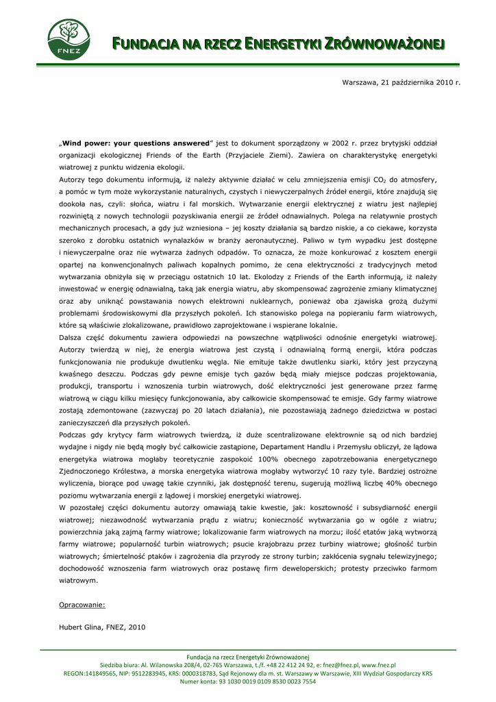 FUUNNDDAACCJJAA NNAA RRZZEECCZZ ENNEERRGGEETTYYKKII ZRRÓÓW WN NO OW WAAŻŻO ON NEEJJ Warszawa, 21 października 2010 r. „Wind power: your questions answered” jest to dokument sporządzony w 2002 r. przez brytyjski oddział organizacji ekologicznej Friends of the Earth (Przyjaciele Ziemi). Zawiera on charakterystykę energetyki wiatrowej z punktu widzenia ekologii. Autorzy tego dokumentu informują, iż należy aktywnie działać w celu zmniejszenia emisji CO2 do atmosfery, a pomóc w tym może wykorzystanie naturalnych, czystych i niewyczerpalnych źródeł energii, które znajdują się dookoła nas, czyli: słońca, wiatru i fal morskich. Wytwarzanie energii elektrycznej z wiatru jest najlepiej rozwiniętą z nowych technologii pozyskiwania energii ze źródeł odnawialnych. Polega na relatywnie prostych mechanicznych procesach, a gdy już wzniesiona – jej koszty działania są bardzo niskie, a co ciekawe, korzysta szeroko z dorobku ostatnich wynalazków w branży aeronautycznej. Paliwo w tym wypadku jest dostępne i niewyczerpalne oraz nie wytwarza żadnych odpadów. To oznacza, że może konkurować z kosztem energii opartej na konwencjonalnych paliwach kopalnych pomimo, że cena elektryczności z tradycyjnych metod wytwarzania obniżyła się w przeciągu ostatnich 10 lat. Ekolodzy z Friends of the Earth informują, iż należy inwestować w energię odnawialną, taką jak energia wiatru, aby skompensować zagrożenie zmiany klimatycznej oraz aby uniknąć powstawania nowych elektrowni nuklearnych, ponieważ oba zjawiska grożą dużymi problemami środowiskowymi dla przyszłych pokoleń. Ich stanowisko polega na popieraniu farm wiatrowych, które są właściwie zlokalizowane, prawidłowo zaprojektowane i wspierane lokalnie. Dalsza część dokumentu zawiera odpowiedzi na powszechne wątpliwości odnośnie energetyki wiatrowej. Autorzy twierdzą w niej, że energia wiatrowa jest czystą i odnawialną formą energii, która podczas funkcjonowania nie produkuje dwutlenku węgla. Nie emituje także dwutlenku siarki, który jest przyczyną kwaśnego deszczu. Podczas gdy pewne emisje tych gazów będą miały miejsce podczas projektowania, produkcji, transportu i wznoszenia turbin wiatrowych, dość elektryczności jest generowane przez farmę wiatrową w ciągu kilku miesięcy funkcjonowania, aby całkowicie skompensować te emisje. Gdy farmy wiatrowe zostają zdemontowane (zazwyczaj po 20 latach działania), nie pozostawiają żadnego dziedzictwa w postaci zanieczyszczeń dla przyszłych pokoleń. Podczas gdy krytycy farm wiatrowych twierdzą, iż duże scentralizowane elektrownie są od nich bardziej wydajne i nigdy nie będą mogły być całkowicie zastąpione, Departament Handlu i Przemysłu obliczył, że lądowa energetyka wiatrowa mogłaby teoretycznie zaspokoić 100% obecnego zapotrzebowania energetycznego Zjednoczonego Królestwa, a morska energetyka wiatrowa mogłaby wytworzyć 10 razy tyle. Bardziej ostrożne wyliczenia, biorące pod uwagę takie czynniki, jak dostępność terenu, sugerują możliwą liczbę 40% obecnego poziomu wytwarzania energii z lądowej i morskiej energetyki wiatrowej. W pozostałej części dokumentu autorzy omawiają takie kwestie, jak: kosztowność i subsydiarność energii wiatrowej; niezawodność wytwarzania prądu z wiatru; konieczność wytwarzania go w ogóle z wiatru; powierzchnia jaką zajmą farmy wiatrowe; lokalizowanie farm wiatrowych na morzu; ilość etatów jaką wytworzą farmy wiatrowe; popularność turbin wiatrowych; psucie krajobrazu przez turbiny wiatrowe; głośność turbin wiatrowych; śmiertelność ptaków i zagrożenia dla przyrody ze strony turbin; zakłócenia sygnału telewizyjnego; dochodowość wznoszenia farm wiatrowych oraz postawę firm deweloperskich; protesty przeciwko farmom wiatrowym. Opracowanie: Hubert Glina, FNEZ, 2010 Fundacja na rzecz Energetyki Zrównoważonej Siedziba biura: Al. Wilanowska 208/4, 02-765 Warszawa, t./f. +48 22 412 24 92, e: [email protected], www.fnez.pl REGON:141849565, NIP: 9512283945, KRS: 0000318783, Sąd Rejonowy dla m. st. Warszawy w Warszawie, XIII Wydział Gospodarczy KRS Numer konta: 93 1030 0019 0109 8530 0023 7554