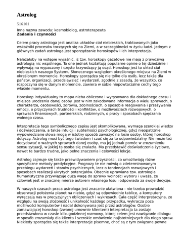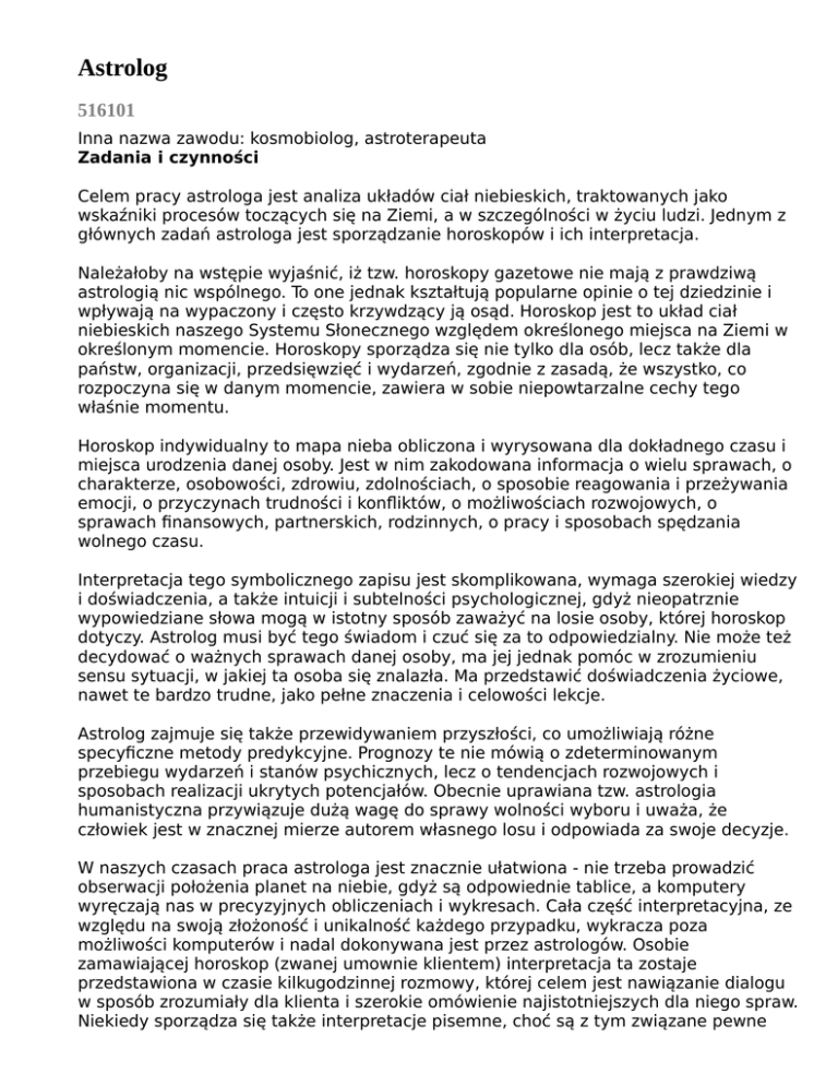 Astrolog 516101 Inna nazwa zawodu: kosmobiolog, astroterapeuta Zadania i czynności Celem pracy astrologa jest analiza układów ciał niebieskich, traktowanych jako wskaźniki procesów toczących się na Ziemi, a w szczególności w życiu ludzi. Jednym z głównych zadań astrologa jest sporządzanie horoskopów i ich interpretacja. Należałoby na wstępie wyjaśnić, iż tzw. horoskopy gazetowe nie mają z prawdziwą astrologią nic wspólnego. To one jednak kształtują popularne opinie o tej dziedzinie i wpływają na wypaczony i często krzywdzący ją osąd. Horoskop jest to układ ciał niebieskich naszego Systemu Słonecznego względem określonego miejsca na Ziemi w określonym momencie. Horoskopy sporządza się nie tylko dla osób, lecz także dla państw, organizacji, przedsięwzięć i wydarzeń, zgodnie z zasadą, że wszystko, co rozpoczyna się w danym momencie, zawiera w sobie niepowtarzalne cechy tego właśnie momentu. Horoskop indywidualny to mapa nieba obliczona i wyrysowana dla dokładnego czasu i miejsca urodzenia danej osoby. Jest w nim zakodowana informacja o wielu sprawach, o charakterze, osobowości, zdrowiu, zdolnościach, o sposobie reagowania i przeżywania emocji, o przyczynach trudności i konfliktów, o możliwościach rozwojowych, o sprawach finansowych, partnerskich, rodzinnych, o pracy i sposobach spędzania wolnego czasu. Interpretacja tego symbolicznego zapisu jest skomplikowana, wymaga szerokiej wiedzy i doświadczenia, a także intuicji i subtelności psychologicznej, gdyż nieopatrznie wypowiedziane słowa mogą w istotny sposób zaważyć na losie osoby, której horoskop dotyczy. Astrolog musi być tego świadom i czuć się za to odpowiedzialny. Nie może też decydować o ważnych sprawach danej osoby, ma jej jednak pomóc w zrozumieniu sensu sytuacji, w jakiej ta osoba się znalazła. Ma przedstawić doświadczenia życiowe, nawet te bardzo trudne, jako pełne znaczenia i celowości lekcje. Astrolog zajmuje się także przewidywaniem przyszłości, co umożliwiają różne specyficzne metody predykcyjne. Prognozy te nie mówią o zdeterminowanym przebiegu wydarzeń i stanów psychicznych, lecz o tendencjach rozwojowych i sposobach realizacji ukrytych potencjałów. Obecnie uprawiana tzw. astrologia humanistyczna przywiązuje dużą wagę do sprawy wolności wyboru i uważa, że człowiek jest w znacznej mierze autorem własnego losu i odpowiada za swoje decyzje. W naszych czasach praca astrologa jest znacznie ułatwiona - nie trzeba prowadzić obserwacji położenia planet na niebie, gdyż są odpowiednie tablice, a komputery wyręczają nas w precyzyjnych obliczeniach i wykresach. Cała część interpretacyjna, ze względu na swoją złożoność i unikalność każdego przypadku, wykracza poza możliwości komputerów i nadal dokonywana jest przez astrologów. Osobie zamawiającej horoskop (zwanej umownie klientem) interpretacja ta zostaje przedstawiona w czasie kilkugodzinnej rozmowy, której celem jest nawiązanie dialogu w sposób zrozumiały dla klienta i szerokie omówienie najistotniejszych dla niego spraw. Niekiedy sporządza się także interpretacje pisemne, choć są z tym związane pewne ograniczenia. Astrologowie bywają także proszeni o wygłaszanie wykładów popularyzatorskich, o audycje w radiu i telewizji, o wywiady i artykuły do prasy. Bardziej zaawansowani spośród nich mogą prowadzić kursy i wykłady dla osób chcących zgłębiać tę dziedzinę. Astrolog może być także autorem, redaktorem lub konsultantem wydawnictw o tej tematyce. Inne nazwy, jakie ostatnio są używane zamiast nazwy „astrolog”, to kosmobiolog i astroterapeuta. Wydają się one zapewne bardziej naukowe i nowoczesne w porównaniu z trącącą myszką nazwą “astrolog”, chodzi jednak wciąż o to samo - o powiązanie zjawisk dziejących się na niebie ze zjawiskami odbywającymi się na Ziemi, a więc te nowe nazwy, sugerujące odejście od tradycyjnej astrologii, są w gruncie rzeczy niepotrzebne i mylące. Wymagania psychologiczne Ze względu na złożoność i specyfikę swojej pracy astrolog powinien umieć nawiązywać pozytywne i bezpośrednie kontakty z ludźmi, mieć łatwość wypowiadania się, umieć słuchać tego, co mówią inni, być spostrzegawczym, zrównoważonym wewnętrznie, dyskretnym i uprzejmym. Obliczenia i wykresy wymagają dokładności i zdolności rachunkowych, do ich interpretacji potrzebna jest wnikliwość psychologiczna, dobra pamięć, wyobraźnia i zdolność logicznego myślenia. Rozmowy z ludźmi o ich życiu i problemach wymagają życzliwości i szacunku dla osób o odmiennych poglądach, bez krytycyzmu, oceniania i chęci “nawracania ich na jedynie słuszną (bo własną) drogę”, a więc szeroko pojętej tolerancji i kultury wewnętrznej. Należy też zdawać sobie sprawę z dużej odpowiedzialności moralnej za swoje słowa. Aby być dobrym astrologiem, niezbędne są szerokie zainteresowania i znajomość wielu dziedzin, głównie psychologii i astronomii, lecz także medycyny, informatyki (korzystanie z komputera), literatury pięknej, historii i filozofii. Trzeba mieć otwarty i sprawny umysł, ponieważ astrologia wiąże się z nieustannym poszerzaniem swoich horyzontów, a praca nad nią nigdy się nie kończy. Nie każdy zresztą sprawny i pojemny umysł jest w stanie zaakceptować holistyczną perspektywę postrzegania świata, jaką proponuje astrologia i pokrewne jej dziedziny. Są to tzw. paranauki, należące do odwiecznej mądrości, będące raczej wiedzą o świecie w szerokim sensie niż konkretnymi wąskimi specjalizacjami. Bycie astrologiem to bardziej powołanie życiowe, chęć zaspokojenia pasji poznawczych i znalezienia odpowiedzi na własne pytania, niż wyuczony i beznamiętnie wykonywany zawód traktowany w kategoriach finansowych. Wymagania fizyczne i zdrowotne Jest to praca lekka pod względem wysiłku fizycznego, lecz opanowanie tego zawodu wiąże się z poważn