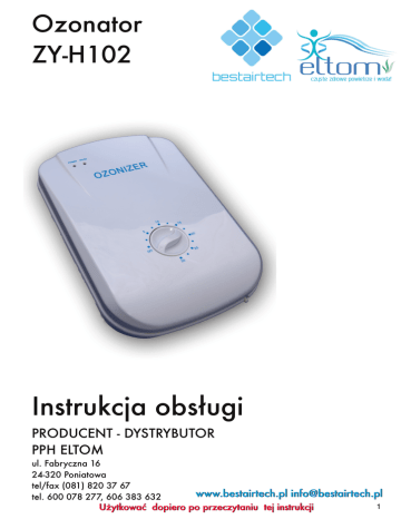 Ozonator ZY-H102 Instrukcja obsługi PRODUCENT - DYSTRYBUTOR PPH ELTOM ul. Fabryczna 16 24-320 Poniatowa tel/fax (081) 820 37 67 tel. 600 078 277, 606 383 632 www.bestairtech.pl [email protected] Użytkować dopiero po przeczytaniu tej instrukcji 1 Szanowny kliencie! Dziękujemy za wybór wyrobu z naszej dystrybucji. Dołożyliśmy wiele starań, aby funkcjonalność, trwałość, estetyka wykonania i prostota obsługi OZONATORA powietrza i wody sprawiły państwu dużo zadowolenia i prozdrowotnej satysfakcji z jego nabycia. Prosimy Państwa o uważną lekturę instrukcji obsługi przed uruchomieniem wyrobu. Przestrzeganie zawartych w niej informacji i wskazówek uchroni przed niewłaściwym użytkowaniem, a stosowanie się do zaleceń zapewni długotrwałe i niezawodne korzystanie z wyrobu. Instrukcję po przeczytaniu zachowaj i przechowuj tak abyś mógł z niej skorzystać gdy jest to potrzebne. Jeżeli masz wątpliwości lub nie wszystko co przeczytałeś jest zrozumiałe, skontaktuj się z nami, a udzielimy Ci dodatkowych informacji. Środowisko naturalne i usuwanie odpadów Opakowania i produkty po upływie ich daty ważności muszą zostać fachowo usunięte i dostarczone do kompletnych punktów utylizacyjnych. Kartony i urządzenia elektryczne należy przekazać do placówek utylizacyjnych. Dzięki Państwa współdziałaniu środowisko naturalne zostanie długofalowo odciążone, a przydatne do recyklingu materiały doprowadzone do nowego cyklu produkcyjnego. Produktu nie wolno wyrzucać do pojemnika na śmieci. W celu utylizacji wg poszczególnych składników części z tworzyw sztucznych są oznakowane. Wskazówki dotyczące bezpieczeństwa użytkowania 1. Użytkować wyrób zgodnie z wymogami opisanymi w instrukcji 2. Użytkować tylko wewnątrz pomieszczeń, nie jest odporny na zalanie wodą i gwałtowne zmiany temperatury i wilgotności powyżej 80% 3. Wyjąć wtyczkę zasilającą ozonatora z gniazdka kiedy nie używamy wyrobu lub chcemy go oczyścić 4. Nie otwierać korpusu - grozi porażeniem wysokim napięciem. 5. Nie blokować swobodnego wlotu powietrza przez kratkę ani wylotu ozonu przez cylindryczny otwór. 6. Nie stosować w pomieszczeniach z łatwopalnymi materiałami, otwartym ogniem lub w pobliżu łatwopalnych aerozoli. 7. Pojemniki do ozonowania wody i produktów spożywczych (owoce warzywa, mięso, ryby itp.) powinno być szklane, porcelanowe lub z tworzywa. Nie korzystać z naczyń miedzianych, aluminiowych i żelaznych. 8. Wyczuwalny zapach ozonu podczas cyklicznej pracy generatora ozonu jest nieszkodliwy, ponieważ przy jego wydajności ̃400 mg/h 03 stężenie ozonu w powietrzu jest poniżej wartości dopuszczalnych 9. Zabrania się używać ozonatora przez ludzi z zaburzeniami węchu 10. Zabrania się sprawdzać emisję ozonu wąchając przy wylocie rurki lub dyfuzora 11. Nie wolno używać pracującego ozonatora na dywanach, wykładzinach itp. 12. Chronić przed dostępem dzieci. 13. Nie dopuszczać do przepływu wody przez wężyk do wnętrza generatora gdyż grozi to jego zniszczeniem. Dlatego przy ozonowaniu produktów w wodzie lub samej wody należy ozonator umieszczać wyżej niż lustro wody. 14. Jeżeli generatora ozonu używamy do oczyszczania powietrza w pomieszczeniu o kubaturze poniżej 20m3, w czasie procesu oczyszczania pomieszczenie musi być zamknięte, oraz nie mogą w nim przebywać ludzie ani zwierzęta. Pomieszczenie oczyszczone można otworzyć po 20 minutach i przewietrzyć. 15.NIE WOLNO wdychać ozonu bezpośrednio z urządzenia! 16. Ozon 03 jest gazem nietrwałym. Okres połowicznego rozpadu nie przekracza 40 min w czystym powietrzu i temperatura 20oC a w zanieczyszczonym wynosi praktycznie około 30 min. Dla wody okres połowicznego rozpadu ozonu wynosi od 30 min przy temperaturze 20oC do kilku minut przy 50oC. Praktycznie po około 2 godzinach ozon przechodzi całkowicie w normalny tlen 02. Dlatego generatory ozonu o wydajności do 500mg 03/ godz. przy zachowaniu przedstawionych zaleceń są bezpieczne w stosowaniu. 2 www.bestairtech.pl [email protected] 17. Dopuszczalne maksymalne stężenie (MWC) dla 8 godz./dobę i 40 godzin na tydzień wynosi 200μg/m3 (0,2 mg/m3 ) lub w wartości względnych 0,1 ppm (100 pp b). Zalecany poziom docelowy to 120 μg/m3 (0,12mg/m3) lub 0,06 ppm. Ozon jest jednym z najskuteczniejszych środków dezynfekujących. Działanie bakteriobójcze wykazuje już w stężeniu około 13μg/ dcm3. Działanie bakteriobójcze ozonu jest 50 razy skuteczniejsze i 3000 razy szybsze niż chloru. WAŻNE OSTRZEŻENIE ELTOM nie ponosi odpowiedzialności za jakiekolwiek szkody lub uszkodzenia ciała wyrządzone przez produkt lub szkody, które mogą powstać na skutek jego wykorzystania przez użytkownika lub przez innych. Użytkownik jest odpowiedzialny za zapewnienie, że wyrób jest prawidłowo zainstalowany, obsługiwany i przechowywany zgodnie z instrukcją. Charakterystyka – działanie 1. Generator ozonu produkuje ozon, nazywany aktywnym tlenem o symbolu 03 i różni się od zwykłego tlenu tym, że tlen ma trwałą postać 02. Okres połowicznego rozpadu ozonu wynosi w powietrzu od 40 minut do 30 minut, a w wodzie od 30 min do kilku minut. W ten sposób po 2 godzinach wyprodukowany ozon prawie w całości powraca do naturalnego tlenu, a w tym czasie pełni funkcje silnego sterylizatora i utleniacza. Ozon działa bakteriobójczo, usuwa lub ogranicza bakterie wirusy, grzyby, pleśnie, pestycydy, fungicydy, roztocza, pyły i pyłki alergiczne w powietrzu i wodzie, oraz jako gaz dociera zarówno do produktów żywnościowych jak i do wszelkich przedmiotów w pomieszczeniu ozonowanym. Jako jeden z najsilniejszych utleniaczy usuwa wszelkie zapachy pochodzenia organicznego i nieorganicznego w tym tytoniowe, od zwierząt i ptaków, pożarowe, popowodziowe i inne. W większych stężeniach zabija insekty i gryzonie których żaden inny środek nie jest w stanie całkowicie wyeliminować. Ozon nie maskuje zapachów l