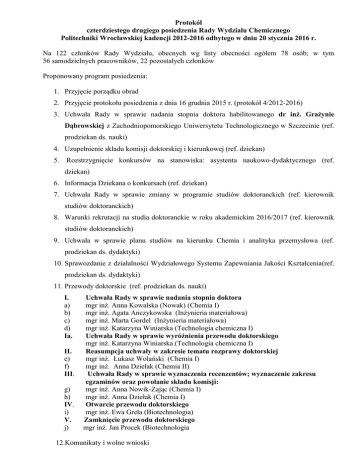 Protokół czterdziestego drugiego posiedzenia Rady Wydziału Chemicznego Politechniki Wrocławskiej kadencji 2012-2016 odbytego w dniu 20 stycznia 2016 r. Na 122 członków Rady Wydziału, obecnych wg listy obecności ogółem 78 osób; w tym 56 samodzielnych pracowników, 22 pozostałych członków Proponowany program posiedzenia: 1. Przyjęcie porządku obrad 2. Przyjęcie protokołu posiedzenia z dnia 16 grudnia 2015 r. (protokół 4/2012-2016) 3. Uchwała Rady w sprawie nadania stopnia doktora habilitowanego dr inż. Grażynie Dąbrowskiej z Zachodniopomorskiego Uniwersytetu Technologicznego w Szczecinie (ref. prodziekan ds. nauki) 4. Uzupełnienie składu komisji doktorskiej i kierunkowej (ref. dziekan) 5. Rozstrzygnięcie konkursów na stanowiska: asystenta naukowo-dydaktycznego (ref. dziekan) 6. Informacja Dziekana o konkursach (ref. dziekan) 7. Uchwała Rady w sprawie zmiany w programie studiów doktoranckich (ref. kierownik studiów doktoranckich) 8. Warunki rekrutacji na studia doktoranckie w roku akademickim 2016/2017 (ref. kierownik studiów doktoranckich) 9. Uchwała w sprawie planu studiów na kierunku Chemia i analityka przemysłowa (ref. prodziekan ds. dydaktyki) 10. Sprawozdanie z działalności Wydziałowego Systemu Zapewniania Jakości Kształcenia(ref. prodziekan ds. dydaktyki) 11. Przewody doktorskie (ref. prodziekan ds. nauki) I. a) b) c) d) Ia. II. e) f) III. g) h) IV. i) V. j) Uchwała Rady w sprawie nadania stopnia doktora mgr inż. Anna Kowalska (Nowak) (Chemia I) mgr inż. Agata Anczykowska (Inżynieria materiałowa) mgr inż. Marta Gordel (Inżynieria materiałowa) mgr inż. Katarzyna Winiarska (Technologia chemiczna I) Uchwała Rady w sprawie wyróżnienia przewodu doktorskiego mgr inż. Katarzyna Winiarska (Technologia chemiczna I) Reasumpcja uchwały w zakresie tematu rozprawy doktorskiej mgr inż. Łukasz Wolański (Chemia I) mgr inż. Anna Dziełak (Chemia II) Uchwała Rady w sprawie wyznaczenia recenzentów; wyznaczenie zakresu egzaminów oraz powołanie składu komisji: mgr inż. Anna Nowik-Zając (Chemia I) mgr inż. Anna Dziełak (Chemia I) Otwarcie przewodu doktorskiego mgr inż. Ewa Grela (Biotechnologia) Zamknięcie przewodu doktorskiego mgr inż. Jan Procek (Biotechnologia 12.Komunikaty i wolne wnioski * * * Dziekan, prof. Andrzej Trochimczuk, wręczył dyplomy Nagród Dziekana doktorantom wyróżnionym za osiągnięcia naukowe w roku akad. 2014/15. Dr inż. Anna Dawiec Mgr inż. Maciej Chomiak Mgr inż. Jan Konieczny Mgr inż. Mateusz Samoraj Mgr inż. Adam Szukalski Wyróżnienie Dziekana za działalność na rzecz doktorantów w roku akad. 2014/2015 Mgr inż. Paulina Wójcik Dziekan, prof. Andrzej Trochimczuk, pogratulował wyróżnionym. Ad.1.Przyjęcie porządku obrad Dziekan, prof. Andrzej Trochimczuk, postawił wniosek o przyjęcie porządku obrad czterdziestego drugiego posiedzenia Rady Wydziału Chemicznego. W głosowaniu jawnym Rada Wydziału Chemicznego jednogłośnie przyjęła porządek obrad. Ad. 2. Przyjęcie protokołu posiedzenia z dnia 16 grudnia 2015 r. (protokół 41/2012-2016) Dziekan, prof. Andrzej Trochimczuk, postawił wniosek o przyjęcie protokołu 41/2012-2016 z dnia 25 listopada 2015 r. W głosowaniu jawnym protokół czterdziestego pierwszego posiedzenia Rady Wydziału został jednogłośnie przyjęty. Ad. 3. Uchwała Rady w sprawie nadania stopnia doktora habilitowanego dr inż. Grażynie Dąbrowskiej z Zachodniopomorskiego Uniwersytetu Technologicznego w Szczecinie Prodziekan, prof. A. Ożyhar, przypomniał, że została wszczęta procedura postępowania habilitacyjnego w sprawie nadania dr inż. Grażynie Dąbrowskiej z Zachodniopomorskiego Uniwersytetu Technologicznego stopnia doktora habilitowanego w dziedzinie: nauki chemiczne, w dyscyplinie: chemia, na podstawie osiągnięcia habilitacyjnego: „Synteza nowych faz typu rutylu i trójrutylu tworzących się z udziałem tetratlenku diantymonu i ich fizykochemiczna charakterystyka”. Skład komisji do sprawy postępowania habilitacyjnego był następujący: prof. dr hab. Jerzy Błażejowski, Uniwersytet Gdański – przewodniczący dr hab. inż. Paweł Pohl, prof. Politechniki Wrocławskiej - sekretarz prof. dr hab. inż. Urszula Domańska-Żelazna, Politechnika Warszawska – recenzent prof. dr hab. Maria Ziółek, Uniwersytet im. Adama Mickiewicza - recenzent dr hab. Leszek Rycerz, prof. Politechniki Wrocławskiej – recenzent prof. dr hab. inż. Bogdan Szczygieł, Politechnika Wrocławska - członek dr hab. Agnieszka Lucyna Sobczak-Kupiec, Politechnika Krakowska - członek Posiedzenie komisji habilitacyjnej odbyło się 15 grudnia 2015 r. Wpłynęły recenzje, które zostały przesłane członkom Rady. Następnie dr hab. inż. Paweł Pohl, prof. PWr – sekretarz komisji, upoważniony przez prof. Jerzego Błażejowskiego – przewodniczącego komisji habilitacyjnej - przedstawił uchwałę komisji wraz z uzasadnieniem. Ponieważ głosów w dyskusji nie było, prof. Andrzej Ożyhar postawił wniosek o głosowanie w sprawie nadania dr inż. Grażynie Dąbrowskiej stopnia doktora habilitowanego w dziedzinie: nauki chemiczne, w dyscyplinie: chemia. Wynik głosowania tajnego: Uprawnionych do głosowania 73 osoby, obecnych podczas głosowania 49 osób; 46 głosów za, 1 przeciw, 2 wstrz. się Uchwała nr 832/42/2012-2016 Rady Wydziału Chemicznego z dnia 20 stycznia 2016 r. w sprawie nadania stopnia doktora habilitowanego dr inż. Grażynie Dąbrowskiej z Zachodniopomorskiego Uniwersytetu Technologicznego w Szczecinie Działając na podstawie art. 18a ust. 11 Ustawy z dnia 14 marca 2003 roku o stopniach naukowych i tytule naukowym oraz stopniach i tytule w zakresie sztuki (Dz.U. z 2014 poz. 1852), Rada Wydziału Chemicznego Politechniki Wrocławskiej podjęła uchwałę o nadaniu dr inż. Grażynie DĄBROWSKIEJ stopnia doktora habilitowanego w dziedzinie nauki chemiczne w dyscyplinie chemia. Uchwała stała się prawomocna z chwilą jej podjęcia. Ad.4. Uzupełnien