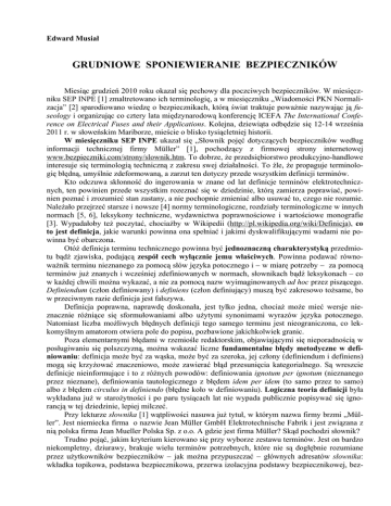 Edward Musiał GRUDNIOWE SPONIEWIERANIE BEZPIECZNIKÓW Miesiąc grudzień 2010 roku okazał się pechowy dla poczciwych bezpieczników. W miesięczniku SEP INPE [1] zmaltretowano ich terminologię, a w miesięczniku „Wiadomości PKN Normalizacja” [2] sparodiowano wiedzę o bezpiecznikach, którą świat traktuje poważnie nazywając ją fuseology i organizując co cztery lata międzynarodową konferencję ICEFA The International Conference on Electrical Fuses and their Applications. Kolejna, dziewiąta odbędzie się 12-14 września 2011 r. w słoweńskim Mariborze, mieście o blisko tysiącletniej historii. W miesięczniku SEP INPE ukazał się „Słownik pojęć dotyczących bezpieczników według informacji technicznej firmy Müller” [1], pochodzący z firmowej strony internetowej www.bezpieczniki.com/strony/slownik.htm. To dobrze, że przedsiębiorstwo produkcyjno-handlowe interesuje się terminologią techniczną z zakresu swej działalności. To źle, że propaguje terminologię błędną, umyślnie zdeformowaną, a zarzut ten dotyczy przede wszystkim definicji terminów. Kto odczuwa skłonność do ingerowania w znane od lat definicje terminów elektrotechnicznych, ten powinien przede wszystkim rozeznać się w dziedzinie, którą zamierza poprawiać, powinien poznać i zrozumieć stan zastany, a nie pochopnie zmieniać albo usuwać to, czego nie rozumie. Należało przejrzeć starsze i nowsze [4] normy terminologiczne, rozdziały terminologiczne w innych normach [5, 6], leksykony techniczne, wydawnictwa poprawnościowe i wartościowe monografie [3]. Wypadałoby też poczytać, chociażby w Wikipedii (http://pl.wikipedia.org/wiki/Definicja), co to jest definicja, jakie warunki powinna ona spełniać i jakimi dyskwalifikującymi wadami nie powinna być obarczona. Otóż definicja terminu technicznego powinna być jednoznaczną charakterystyką przedmiotu bądź zjawiska, podającą zespół cech wyłącznie jemu właściwych. Powinna podawać równoważnik terminu nieznanego za pomocą słów języka potocznego i − w miarę potrzeby − za pomocą terminów już znanych i wcześniej zdefiniowanych w normach, słownikach bądź leksykonach – co w każdej chwili można wykazać, a nie za pomocą nazw wyimaginowanych ad hoc przez piszącego. Definiendum (człon definiowany) i definiens (człon definiujący) muszą być zakresowo tożsame, bo w przeciwnym razie definicja jest fałszywa. Definicja poprawna, naprawdę doskonała, jest tylko jedna, chociaż może mieć wersje nieznacznie różniące się sformułowaniami albo użytymi synonimami wyrazów języka potocznego. Natomiast liczba możliwych błędnych definicji tego samego terminu jest nieograniczona, co lekkomyślnym amatorom otwiera pole do popisu, pozbawione jakichkolwiek granic. Poza elementarnymi błędami w rzemiośle redaktorskim, objawiającymi się nieporadnością w posługiwaniu się polszczyzną, można wskazać liczne fundamentalne błędy metodyczne w definiowaniu: definicja może być za wąska, może być za szeroka, jej człony (definiendum i definiens) mogą się krzyżować znaczeniowo, może zawierać błąd przesunięcia kategorialnego. Są wreszcie definicje nieinformujące i to z różnych powodów: definiowania ignotum per ignotum (nieznanego przez nieznane), definiowania tautologicznego z błędem idem per idem (to samo przez to samo) albo z błędem circulus in definiendo (błędne koło w definiowaniu). Logiczna teoria definicji była wykładana już w starożytności i po paru tysiącach lat nie wypada publicznie popisywać się ignorancją w tej dziedzinie, lepiej milczeć. Przy lekturze słownika [1] wątpliwości nasuwa już tytuł, w którym nazwa firmy brzmi „Müller”. Jest niemiecka firma o nazwie Jean Müller GmbH Elektrotechnische Fabrik i jest związana z nią polska firma Jean Mueller Polska Sp. z o.o. A gdzie jest firma Müller? Skąd pochodzi słownik? Trudno pojąć, jakim kryterium kierowano się przy wyborze zestawu terminów. Jest on bardzo niekompletny, dziurawy, brakuje wielu terminów potrzebnych, które nie są dogłębnie rozumiane przez użytkowników bezpieczników − jak można przypuszczać − głównych adresatów słownika: wkładka topikowa, podstawa bezpiecznikowa, przerwa izolacyjna podstawy bezpiecznikowej, bez- piecznik ograniczający, klasa bezpiecznika, kategoria użytkowania, bezpiecznik dobezpieczeniowy, bezpiecznik ogólnego zastosowania, bezpiecznik pełnozakresowy, zakres wyłączania, granice charakterystyk pasmowych, napięcie powrotne, przepięcie wyłączeniowe, prąd wyłączalny najmniejszy. Zarazem są terminy mniej potrzebne (charakterystyka przeciążeniowa, prąd spodziewany wyłączeniowy), są terminy ogólnoelektryczne dotyczące nie tylko bezpieczników (obciążalność prądowa, przeciążenie, przetężenie) i są osobno definiowane synonimy (selektywność i wybiórczość) bez wzmianki o ich wzajemnej relacji. Bywa też, że terminy pokrewne są definiowane niespójnie (bezpiecznik niezamienialny i niezamienialność, przeciążenie i przetężenie). A wystarczyło sięgnąć do polskojęzycznych wersji normy PN-EN 60269-1 [5, 6] zawierających obszerny rozdział 2 Terminy i definicje, dotyczący wszelkich bezpieczników niskonapięciowych, którym poświęcone są kolejne arkusze tej normy. I wystarczyło za normą wiernie powtórzyć wybrane terminy i ich definicje, mozolnie wypracowane przez zespół specjalistów tworzących Komitet Techniczny nr 75 ds. Bezpieczników Elektroenergetycznych. Jako aktywny uczestnik tych prac już od 16 lat, niżej podpisany cierpi widząc profanowanie wieloletniej pracy zespołu. Albowiem autorzy słownika [1] włożyli wiele wysiłku, aby okaleczyć niemal każdą definicję albo przynajmniej „Uwagę” do definicji, no i niektóre terminy (np. charakterystyka czasowoprądowa, zamiast charakterystyka czasowo-prądowa, prąd spodziewany wyłączeniowy zamiast prąd wyłączeniowy spodziewa