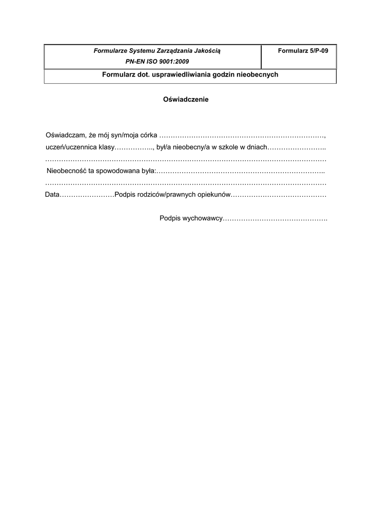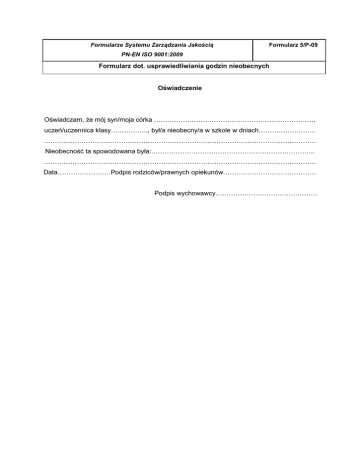 Formularze Systemu Zarządzania Jakością Formularz 5/P-09 PN-EN ISO 9001:2009 Formularz dot. usprawiedliwiania godzin nieobecnych Oświadczenie Oświadczam, że mój syn/moja córka ………………………………………………………………, uczeń/uczennica klasy…………….., był/a nieobecny/a w szkole w dniach…………………….. …………………………………………………………………………………………………………… Nieobecność ta spowodowana była:……………………………………………………………….. …………………………………………………………………………………………………………… Data……………………Podpis rodziców/prawnych opiekunów…………………………………… Podpis wychowawcy………………………………………. Formularze Systemu Zarządzania Jakością Formularz 6/P-09 PN-EN ISO 9001:2009 Formularz dot. zwolnienia ucznia z zajęć lekcyjnych Zwolnienie z zajęć lekcyjnych Imię i nazwisko ucznia/uczennicy……………………………………………….klasa…………….. Proszę o zwolnienie w dniu………………………………….. o godzinie …………………………. z powodu ……………………………………………………………………………………………….. …………………………………………………………………………………………………………… Biorę odpowiedzialność za bezpieczeństwo dziecka w czasie jego nieobecności w szkole. Data………………………………..Podpis rodziców……………………………………………… Podpis wychowawcy…………………………………………