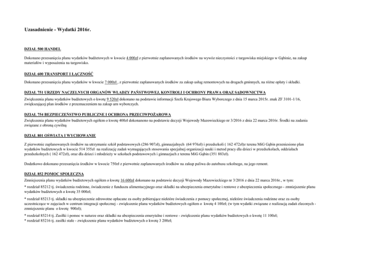 Uzasadnienie - Wydatki 2016r. DZIAŁ 500 HANDEL Dokonano przesunięcia planu wydatków budżetowych w kwocie 4 000zł z pierwotnie zaplanowanych środków na wywóz nieczystości z targowiska miejskiego w Gąbinie, na zakup materiałów i wyposażenia na targowisko. DZIAŁ 600 TRANSPORT I ŁĄCZNOŚĆ Dokonano przesunięcia planu wydatków w kwocie 7 000zł , z pierwotnie zaplanowanych środków za zakup usług remontowych na drogach gminnych, na różne opłaty i składki. DZIAŁ 751 URZĘDY NACZELNYCH ORGANÓW WŁADZY PAŃSTWOWEJ, KONTROLI I OCHRONY PRAWA ORAZ SĄDOWNICTWA Zwiększenia planu wydatków budżetowych o kwotę 9 520zł dokonano na podstawie informacji Szefa Krajowego Biura Wyborczego z dnia 15 marca 2015r. znak ZF 3101-1/16, zwiększającej plan środków z przeznaczeniem na zakup urn wyborczych. DZIAŁ 754 BEZPIECZEŃSTWO PUBLICZNE I OCHRONA PRZECIWPOŻAROWA Zwiększenia planu wydatków budżetowych ogółem o kwotę 400zł dokonanono na podstawie decyzji Wojewody Mazowieckiego nr 3/2016 z dnia 22 marca 2016r. Środki na zadania związane z obroną cywilną DZIAŁ 801 OŚWIATA I WYCHOWANIE Z pierwotnie zaplanowanych środków na utrzymanie szkół podstawowych (286 907zł), gimnazjalnych (64 976zł) i przedszkoli ( 162 472zł)z terenu MiG Gąbin przeniesiono plan wydatków budżetowych w kwocie 514 355zł na realizację zadań wymagających stosowania specjalnej organizacji nauki i metod pracy dla dzieci w przedszkolach, oddziałach przedszkolnych ( 162 472zł), oraz dla dzieci i młodzieży w szkołach podstawowych i gimnazjach z terenu MiG Gąbin (351 883zł). Dodatkowo dokonano przesunięcia środków w kwocie 750zł z pierwotnie zaplanowanych środków na zakup paliwa do autobusu szkolnego, na jego remont. DZIAŁ 852 POMOC SPOŁECZNA Zmniejszenia planu wydatków budżetowych ogółem o kwotę 16 600zł dokonano na podstawie decyzji Wojewody Mazowieckiego nr 3/2016 z dnia 22 marca 2016r., w tym: * rozdział 85212 tj. świadczenia rodzinne, świadczenie z funduszu alimentacyjnego oraz składki na ubezpieczenia emerytalne i rentowe z ubezpieczenia społecznego - zmniejszenie planu wydatków budżetowych o kwotę 35 000zł; * rozdział 85213 tj. składki na ubezpieczenie zdrowotne opłacane za osoby pobierające niektóre świadczenia z pomocy społecznej, niektóre świadczenia rodzinne oraz za osoby uczestniczące w zajęciach w centrum integracji społecznej - zwiększenie planu wydatków budżetowych ogółem o kwotę 4 100zł; (w tym wydatki związane z realizacją zadań zleconych zmniejszenie planu o kwotę 900zł); * rozdział 85214 tj. Zasiłki i pomoc w naturze oraz składki na ubezpieczenia emerytalne i rentowe - zwiększenie planu wydatków budżetowych o kwotę 11 100zł; * rozdział 85216 tj. zasiłki stałe - zwiększenie planu wydatków budżetowych o kwotę 3 200zł;