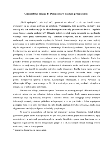 Gimnastyka mózgu P. Dennisona w naszym przedszkolu „Siedź spokojnie”, „nie kręć się”, „przestań się wiercić” – tak my dorośli często zwracamy się do dzieci, próbując je uspokoić. Wymagamy, żeby patrzyły, słuchały i nie ruszały się, tzn. zachęcamy je do nieruchomego uczenia się, poznawania świata i ogólnie rzecz biorąc „bycia spokojnym”. Obecnie dzieci częściej mają skłonność do spędzania wolnego czasu przed telewizorem czy ekranem komputera, niż na uprawianiu zabaw ruchowych, czy wykonywaniu regularnych ćwiczeń. Konsekwencją tego są coraz częściej pojawiające się u dzieci problemy z koncentracją uwagi, rozumieniem przez dziecko tego, co się do niego mówi, a także problemy z równowagą i koordynacją ruchową. Tymczasem, aby być twórczym, aby uczyć się i myśleć – dzieci muszą się ruszać. Myślenie jest bowiem ściśle powiązany z ciałem. To ono właśnie dostarcza do mózgu bodźce z otoczenia, dzięki którym rozumiemy otaczającą nas rzeczywistość oraz podejmujemy twórcze działania. Ruch jest ponadto źródłem poznawania otaczającej nas rzeczywistości w sposób radosny i twórczy. Dziecko ze swej natury jest aktywne, ciekawskie i nieustannie szuka możliwości poruszania się, niestety my dorośli tę naturalna potrzebę ciągle blokujemy. Każda forma ruchu wpływa pozytywnie na nasze samopoczucie i zdrowie. Istnieją jednak ćwiczenia, dzięki którym poprawia się funkcjonowanie i praca naszego mózgu oraz następuje integrowanie pracy obu półkul mózgowych (prawej i lewej). Kinezjologia edukacyjna, z której wywodzi się Gimnastyka Mózgu, zwraca uwagę na fakt, iż uczenie się to proces, który zachodzi nie tylko w mózgu, ale w całym ciele człowieka. Gimnastyka Mózgu, stworzona przez Dennisona za pomocą prostych ukierunkowanych ćwiczeń ruchowych ma pobudzać funkcje mózgu przed nauką, dzięki czemu przyswajanie informacji staje się bardziej efektywne i radosne. Dzięki nim następuje dobry przepływ informacji pomiędzy obiema półkulami mózgowymi, a co za tym idzie – dobra współpraca pomiędzy nimi. To z kolei powoduje, że ciało dziecka cechuje dobra koordynacja, a nauka staje się procesem łatwiejszym i przez to bardziej przyjemnym. W naszym przedszkolu od dawna już pracujemy metodą Dennisona, dotąd jednak głównie w grupie dzieci autystycznych. W tym roku jednak także grupa II (dzieci starsze) będą uczestniczyły w zajęciach prowadzonych tą metodą. Wspólnie z panią Asią będziemy raz w tygodniu organizować zajęcia integracyjne grupy II i III, na których dzieci poznają wesołe ćwiczenia, które w łatwy sposób: * poprawią koordynację całego ciała * poprawią funkcjonowanie umysłu, a więc m. in. koncentrację, zapamiętywanie * zwiększą motywację do nauki i dodadzą energii do pracy i zabawy. * pomogą zrelaksować się, * kształtują motorykę dużą i małą, * pomagają obniżyć poziom stresu, * pobudzają twórcze myślenie, * wspomagają zdobywanie umiejętności matematycznych. Ćwiczenia są dużą przyjemnością dla dzieci, towarzyszą im piosenki i zabawy muzyczno – ruchowe. Picie niegazowanej wody jest niezbędnym elementem gimnastyki mózgu, gdyż woda wspomaga oddychanie, rozpuszczając tlen i wprowadzając go do krwi oraz dodaje energii, co w rezultacie wspomaga przyswajanie nowych wiadomości i umiejętności. Dlatego też proszę, aby dzieci przynosiły ze sobą do przedszkola w umówione wcześniej dni butelkę wody mineralnej, którą będą popijać sobie w trakcie ćwiczeń. W skład Gimnastyki Mózgu wchodzą m.in. następujące ćwiczenia, które mogą Państwo wykonywać wspólnie z dziećmi w dowolnej chwili: RYSOWANIE OBURĄCZ: - wiele radości sprawia dzieciom to „ symetryczne bazgranie”, które polega na rysowaniu obiema rękami jednocześnie; nie jest istotne, co powstaje na rysunku – wszystko, co spełnia warunek symetryczności jest dobre; ćwiczenie to poprawia koordynację ruchów rąk i gałek ocznych, rozwijając umiejętność pisania, oraz ma wpływ na orientację przestrzenną - na dużym arkuszu papieru lub na tablicy rysujemy dowolne, symetryczne wzory pisakiem lub kredą, obiema rękami jednocześnie, wykonując duże ruchy ramionami - również na dużym arkuszu papieru malujemy farbami do malowania palcami obiema rękami równocześnie, tworząc barwne kompozycje - na plaży możemy rysować na piasku: klęczymy wygodnie na piasku i rysujemy obiema rękami fikuśne obrazki: muszelki, fale morskie, i co nam tylko przyjdzie do głowy… Nie jest tu ważny efekt!! Nigdy nie oceniamy prac dziecka!! MASOWANIE PUNKTÓW NA MYŚLENIE - powodują przesyłanie informacji z prawej półkuli mózgu do lewej strony ciała i odwrotnie, poprawiając jasność naszego umysłu; są to wgłębienia tzw. dołki podobojczykowe, symetryczne po obu stronach mostka - masujemy je palcami jednej ręki, podczas gdy drugą trzymamy nieruchomo na pępku - w tym samym czasie wodzimy wzrokiem od prawej do lewej strony i z powrotem POZYCJA DENNISONA 1 - obie te pozycje przywracają równowagę, odstresowują i relaksują - siadamy wygodnie na krześle i wyciągamy przed siebie ręce z kciukami w dół - krzyżujemy ręce (prawa na lewą) i splatamy dłonie, a potem przyciągamy je do klatki piersiowej - krzyżujemy nogi (lewa noga na prawą) - oddychamy spokojnie język trzymając na podniebieniu, jak przy wymowie głoski „l” - patrzymy w górę POZYCJA DENNISONA 2 - siedzimy na krześle, nogi ugięte w kolanach, stopy ustawione równolegle na ziemi - łączymy palce obu dłoni dotykając je opuszkami - wzrok skierowany w dół, oddychamy głęboko KAPTUREK MYŚLICIELA - masujemy nasze uszy, oba jednocześnie: palcami chwytamy brzegi małżowiny usznej i odwijamy je na zewnątrz: od góry do dolnych płatków - po masażu: rozciągamy uszy we wszystkich kierunkach: do góry, w dół, do tyłu; - rozluźnione i ukrwione za p