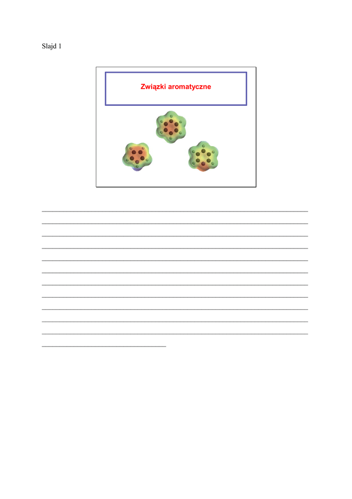 Slajd 1 Związki aromatyczne ___________________________________________________________________________ ___________________________________________________________________________ ___________________________________________________________________________ ___________________________________________________________________________ ___________________________________________________________________________ ___________________________________________________________________________ ___________________________________________________________________________ ___________________________________________________________________________ ___________________________________________________________________________ ___________________________________________________________________________ ___________________________________________________________________________ ___________________________________ Slajd 2 Reguły aromatyczności 1. Związek musi posiadać cykliczną chmurę elektronową ponad i pod płaszczyzną cząsteczki 2. Chmura elektronów π musi zawierać nieparzystą liczbę par elektronowych ___________________________________________________________________________ ___________________________________________________________________________ ___________________________________________________________________________ ___________________________________________________________________________ ___________________________________________________________________________ ___________________________________________________________________________ ___________________________________________________________________________ ___________________________________________________________________________ ___________________________________________________________________________ ___________________________________________________________________________ ___________________________________________________________________________ ___________________________________ Slajd 3 Reguła Hückela Płaski i cykliczny związek aby mieć charakter aromatyczny musi posiadać cykliczna chmurę (4n + 2) elektronów π, gdzie n to liczba naturalna ___________________________________________________________________________ ___________________________________________________________________________ ___________________________________________________________________________ ___________________________________________________________________________ ___________________________________________________________________________ ___________________________________________________________________________ ___________________________________________________________________________ ___________________________________________________________________________ ___________________________________________________________________________ ___________________________________________________________________________ ___________________________________________________________________________ ___________________________________ Slajd 4 oczekiwana energia oczekiwana energia rezonansu energia rezonansu ___________________________________________________________________________ ___________________________________________________________________________ ___________________________________________________________________________ ___________________________________________________________________________ ___________________________________________________________________________ ___________________________________________________________________________ ___________________________________________________________________________ ___________________________________________________________________________ ___________________________________________________________________________ ___________________________________________________________________________ ___________________________________________________________________________ ___________________________________ Slajd 5 cyklobutadien benzen cyklooktatetraen Cyklobutadien nie jest aromatyczny ponieważ ma parzystą liczbę par elektronowych Cyklooktatetraen nie jest aromatyczny ponieważ nie jest płaski ___________________________________________________________________________ ___________________________________________________________________________ ___________________________________________________________________________ ___________________________________________________________________________ ___________________________________________________________________________ ___________________________________________________________________________ ___________________________________________________________________________ ___________________________________________________________________________ ___________________________________________________________________________ ___________________________________________________________________________ ___________________________________________________________________________ ___________________________________ Slajd 6 Kation cyklopropenowy ma charakter aromatyczny struktury rezonansowe kationu cyklopropenu hybryda rezonansowa ___________________________________________________________________________ ___________________________________________________________________________ ___________________________________________________________________________ ___________________________________________________________________________ ___________________________________________________________________________ ___________________________________________________________________________ ___________________________________________________________________________ ___________________________________________________________________________ ___________________________________________________________________________ ___________________________________________________________________________ ___________________________________________________________________________ ________