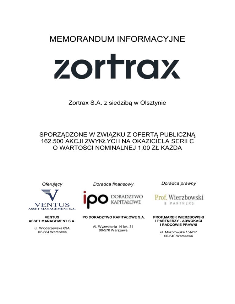 MEMORANDUM INFORMACYJNE Zortrax S.A. z siedzibą w Olsztynie SPORZĄDZONE W ZWIĄZKU Z OFERTĄ PUBLICZNĄ 162.500 AKCJI ZWYKŁYCH NA OKAZICIELA SERII C O WARTOŚCI NOMINALNEJ 1,00 ZŁ KAŻDA Oferujący Doradca finansowy Doradca prawny VENTUS ASSET MANAGEMENT S.A. IPO DORADZTWO KAPITAŁOWE S.A. ul. Włodarzewska 69A 02-384 Warszawa Al. Wyzwolenia 14 lok. 31 00-570 Warszawa PROF.MAREK WIERZBOWSKI I PARTNERZY - ADWOKACI I RADCOWIE PRAWNI ul. Mokotowska 15A/17 00-640 Warszawa WSTĘP MEMORANDUM INFORMACYJNE ZORTRAX S.A. WSTĘP Niniejsze Memorandum Informacyjne zostało przygotowane w związku z Ofertą Publiczną 162.500 (słownie: sto sześćdziesiąt dwa tysiące pięćset) Akcji zwykłych na okaziciela serii C o wartości nominalnej 1,00 zł (słownie: jeden złotych 00/100) każda Akcja Spółki Zortrax S.A. z siedzibą w Olsztynie. Oferowanie Akcji zwykłych na okaziciela serii C odbywa się wyłącznie na warunkach i zgodnie z zasadami określonymi w niniejszym Memorandum Informacyjnym, które jest jedynym prawnie wiążącym dokumentem zawierającym informacje o Akcjach serii C, ich ofercie i Emitencie. 1. EMITENT Nazwa (firma): Nazwa (skrócona): Forma prawna: Kraj siedziby: Siedziba: Adres: Telefon: Fax: Poczta elektroniczna: Strona internetowa: Numer KRS: Oznaczenie Sądu: REGON: NIP: 2. NAZWA (FIRMA) Zortrax Spółka Akcyjna Zortrax S.A. Spółka Akcyjna Polska Olsztyn ul. Wyszyńskiego 1/219, 10-457 Olsztyn +48 602 658 145 [email protected] www.zortrax.pl, www.zortrax.com 0000564079 Sąd Rejonowy w Olsztynie, VIII Wydział Gospodarczy Krajowego Rejestru Sądowego 281551179 7393864289 LUB IMIĘ I NAZWISKO ORAZ SIEDZIBA (MIEJSCE ZAMIESZKANIA) SPRZEDAJĄCEGO Nie występuje podmiot sprzedający Akcje Emitenta. 3. LICZBA, RODZAJ, JEDNOSTKOWĄ WARTOŚĆ NOMINALNĄ I OZNACZENIE PAPIERÓW WARTOŚCIOWYCH OFEROWANYCH W TRYBIE OFERTY PUBLICZNEJ EMISJI Na podstawie niniejszego Memorandum Informacyjnego oferuje się 162.500 Akcji zwykłych na okaziciela serii C, o wartości nominalnej 1,00 zł każda. Akcje serii C oferowane są z wyłączeniem prawa poboru dla dotychczasowych akcjonariuszy. Oferta publiczna Akcji serii C przeprowadzana jest w ramach oferty pre-IPO. Emitent zamierza ubiegać się o dopuszczenie oraz wprowadzenie Akcji serii C do obrotu na rynku regulowanym GPW prowadzonym przez Giełdę Papierów Wartościowych w Warszawie S.A. po przeprowadzeniu oferty publicznej akcji (IPO), która planowana jest w I półroczu 2016 roku. 4. PODMIOT UDZIELAJĄCY ZABEZPIECZENIA ZABEZPIECZENIA (GWARANTUJĄCY), ZE WSKAZANIEM Nie występuje podmiot udzielający zabezpieczenia (gwarantujący) dla Oferty Publicznej Akcji serii C Emitenta. 2 z 197 MEMORANDUM INFORMACYJNE ZORTRAX S.A. 5. WSTĘP CENA EMISYJNA (SPRZEDAŻY) OFEROWANYCH PAPIERÓW WARTOŚCIOWYCH ALBO SPOSÓB JEJ USTALENIA ORAZ TRYB I TERMIN UDOSTĘPNIENIA CENY DO PUBLICZNEJ WIADOMOŚCI Cena emisyjna Akcji serii C wynosi 32,50 zł (słownie: trzydzieści dwa złote 50/100) za jedną akcję. Cena emisyjna Akcji serii C została określona przez Nadzwyczajne Walne Zgromadzenie Spółki Zortrax S.A. na podstawie Uchwały nr 3 w przedmiocie podwyższenia kapitału zakładowego Spółki w drodze oferty publicznej nowej emisji akcji serii C z pozbawieniem dotychczasowych akcjonariuszy prawa poboru oraz w sprawie zmiany Statutu Spółki. 6. PRZEPIS USTAWY, ZGODNIE Z KTÓRYM OFERTA PUBLICZNA MOŻE BYĆ PROWADZONA NA PODSTAWIE MEMORANDUM Akcje zwykłe na okaziciela serii C oferowane na podstawie niniejszego Memorandum Informacyjnego są oferowane w trybie oferty publicznej w rozumieniu art. 3 ust 1 Ustawy o Ofercie Publicznej i w sposób wskazany w art. 7 ust. 9 tej Ustawy. Zgodnie z art. 41 ust. 1 Ustawy o Ofercie Publicznej, w przypadkach, o których mowa w art. 7 ust. 9, Emitent udostępnia do publicznej wiadomości Memorandum Informacyjne. Treść niniejszego Memorandum nie wymaga zatwierdzenia przez Komisję Nadzoru Finansowego. 7. PODMIOTY BIORĄCE UDZIAŁ W PRZYGOTOWANIU I PRZEPROWADZENIU OFERTY PUBLICZNEJ - PODMIOT OFERUJĄCY, SUBEMITENCI I POZOSTAŁE PODMIOTY OFERUJĄCY: Nazwa (firma): Siedziba: Adres: Adres do korespondencji: Telefon: Fax: Adres poczty elektronicznej: Adres strony internetowej: Ventus Asset Management Spółka Akcyjna Warszawa, Polska ul. Włodarzewska 69A, 02-384 Warszawa ul. Moniuszki 1A, 00-014 Warszawa +48 22 668 85 58 +48 22 659 20 70 [email protected] www.ventusam.pl DORADCA FINANSOWY: Nazwa (firma): Siedziba: Adres: Adres do korespondencji: Telefon: Fax: Adres poczty elektronicznej: Adres strony internetowej: IPO Doradztwo Kapitałowe Spółka Akcyjna Warszawa, Polska Al. Wyzwolenia 14 lok. 31, 00-570 Warszawa ul. Moniuszki 1A, 00-014 Warszawa +48 22 250 84 14 +48 22 250 84 17 [email protected] www.ipo.com.pl Na dzień Memorandum Informacyjnego Emitent nie zawarł i nie planuje zawarcia umowy o submisję usługową lub inwestycyjną. 3 z 197 MEMORANDUM INFORMACYJNE ZORTRAX S.A. 8. WSTĘP DATA WAŻNOŚCI MEMORANDUM ORAZ DATA, DO KTÓREJ INFORMACJE AKTUALIZUJĄCE MEMORANDUM ZOSTAŁY UWZGLĘDNIONE W JEGO TREŚCI Niniejsze Memorandum zostało opublikowane w dniu 30 czerwca 2015 r. Termin ważności Memorandum rozpoczyna się z chwilą jego publikacji i kończy się z Dniem Przydziału Akcji, tj. w terminie do 16 lipca 2015 r. Informacje aktualizujące zostały uwzględnione w jego treści do dnia 30 czerwca 2015 r. 9. TRYB, W JAKIM INFORMACJE O ZMIANIE DANYCH ZAWARTYCH W MEMORANDUM, W OKRESIE JEGO WAŻNOŚCI, BĘDĄ PODAWANE DO PUBLICZNEJ WIADOMOŚCI W przypadku odwołania przez Emitenta Oferty Publicznej Akcji zwykłych na okaziciela serii C ważność Memorandum kończy się z dniem podania do publicznej wiadomości o tym fakcie w sposób określony w art. 47 ust. 1 Ustawy o Ofercie. Informacje o istotnych błędach lub niedokładnościach w jego treści lub znaczących czynnikach, mogących wpłynąć na ocenę papieru wartościowego, zaistniałych w okresie od udostępnienia Memorandum Informacyjnego do publicznej