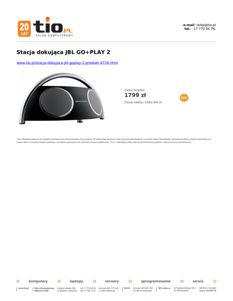 e-mail: [email protected] tel. : 17 770 04 76, Stacja dokująca JBL GO+PLAY 2 www.tio.pl/stacja-dokujaca-jbl-goplay-2-produkt-4716.html Cena brutto: 1799 zł Cena netto: 1462.60 zł *Ceny obowiązują wyłącznie przy składaniu zamówień przez sklep internetowy. Ceny w salonie TiO media mogą nieznacznie różnić się od cen prezentowanych na stronach sklepu internetowego. Przedstawiona oferta w sklepie internetowym nie stanowi oferty w rozumieniu Kodeksu Cywilnego, i jest jedynie zaproszeniem do rozpoczęcia rokowań (zgodnie z art. 71 k.c.). Zastrzegamy sobie prawo do niezrealizowania zamówień z ważnych przyczyn ekonomicznych.