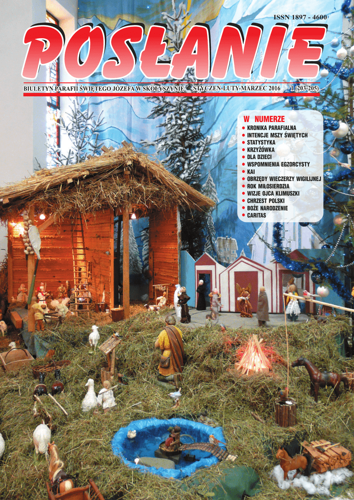 ISSN 1897 - 4600 STYCZEŃ-LUTY-MARZEC 2016 1 (203-205) W NUMERZE KRONIKA PARAFIALNA INTENCJE MSZY ŚWIĘTYCH STATYSTYKA KRZYŻÓWKA DLA DZIECI WSPOMNIENIA EGZORCYSTY KAI OBRZĘDY WIECZERZY WIGILIJNEJ ROK MIŁOSIERDZIA WIZJE OJCA KLIMUSZKI CHRZEST POLSKI BOŻE NARODZENIE CARITAS KRONIKA PARAFIALNA Rekolekcje 11 listopada Dzień Misia Poświęcenie medalików Pasowanie pierwszoklasistów Święty Mikołaj 3 KRONIKA PARAFIALNA 1. 25 pażdziernika odbyły się Wybory Parlamentarne . Prawica po raz pierwszy w historii zdobyła większość mandatów w sejmie i senacie. Może więc rządzić samodzielnie. Zjednoczona lewica nie uzyskała progu i nie weszła do parlamentu. Cóż, po raz pierwszy po wojnie mamy Sejm bez lewicy. 2. 1 listopada modliliśmy się na cmentarzu w Skołyszynie i Sławęcinie za naszych bliskich zmarłych. Przez cały miesiąc listopad polecaliśmy Bogu w modlitwie różańcowej zmarłych wspominanych w wypominkach. 3. Początkiem listopada definitywnie zakończyliśmy tegoroczny etap budowy kaplicy cmentarnej. Otwory okienne i drzwiowe zostały na razie prowizorycznie zabezpieczone. Bóg zapłać za składane ofiary na wyrównanie zaległości finansowych związanych z tą budową. 4. 11 listopada przeżywaliśmy 97 rocznicę Odzyskania Niepodległości. W ZSP w Skołyszynie miała miejsce okolicznościowa Akademia. 5. 16 listopada w naszej świątyni sprawowana była kolejna msza św. z modlitwą o uzdrowienie. 6. 28 listopada uroczyste otwarcie w katedrze w Rzeszowie Jubileuszu 1050 rocznicy Chrztu Polski. 7. Początkiem grudnia Samorząd Uczniowski SP w Skołyszynie zorganizował Uroczystość Dnia Misia. Było bardzo pluszowo, radośnie i miło. 8. 5 grudnia w Peru beatyfikacja misjonarzy, męczenników o.Zbigniewa i o. Michała – franciszkanów z Polski. 9. 6 grudnia do dzieci naszej parafii przybył św. Mikołaj. 10. 7 grudnia kolejna msza św. w naszej świątyni z modlitwą o uzdrowienie. 11. 8 grudnia w Uroczystość Niepokalanego Poczęcia NMP dzieci przygotowujące się do I Komunii św. otrzymały poświęcone wcześniej medaliki. 12. 22 grudnia poprzez Sakrament Pokuty w scenerii na nowo składanej , ruchomej szopki, przygotowaliśmy się do uroczystego obchodu Świąt Bożego Narodzenia. Na rodzinne i radosne przeżywanie Świąt Bożego Narodzenia z łamaniem się opłatkiem i piękną kolędą, życzę wszystkim Szczęść Boże! Wasz proboszcz Ks. T. Wawryszko Wszystkim czytelnikom Posłania życzymy: radosnych, szczęśliwych, błogosławionych Świąt, aby Chrystus przychodząc w pamiątce swego narodzenia, napełnił wszystkich ludzi dobrej woli swoimi łaskami i błogosławieństwem. Redakcja Posłania POSŁANIE 1 (203 - 205) 4 Obrzędy wieczerzy wigilijnej Obrzęd modlitwy przed wieczerzą wigilijną prowadzi ojciec rodziny. W szczególnych przypadkach może modlitwę prowadzić ktoś inny. W tekście zamieszczonym poniżej słowa wypowiadane przez osobę prowadzącą (ojca rodziny) oznaczono przez O, a przez W słowa wypowiadane przez wszystkich. Wieczerzę wigilijną rozpoczynamy pieśnią adwentową np: “Niebiosa rosę”, „Oto Pan Bóg przyjdzie” lub “Spuśćcie nam na ziemskie niwy”. Po odśpiewaniu pieśni ojciec rodziny, lub ktoś inny zapala świece. O: Światło Chrystusa. W: Bogu niech będą dzięki. Wszyscy odmawiają „Anioł Pański”. Jeden z uczestników odczytuje słowa Ewangelii (Łk 2,1-7): Słowa Ewangelii według świętego Łukasza. W owym czasie wyszło rozporządzenie Cezara Augusta, żeby przeprowadzić spis ludności w całym państwie. Pierwszy ten spis odbył się wówczas, gdy wielkorządcą Syrii był Kwiryniusz. Wybierali się wszyscy, aby dać się zapisać, każdy do swego miasta. Udał się także Józef z Galilei, z miasta Nazaret do Judei, do miasta Dawidowego zwanego Betlejem, ponieważ pochodził z domu i rodu Dawida, ażeby dać się zapisać z poślubioną sobie Maryją, która była brzemienna. Kiedy tam przebywali, nadszedł dla Maryi czas rozwiązania. Porodziła swego pierworodnego Syna, owinęła Go w pieluszki i położyła w żłobie, gdyż nie było dla nich miejsca w gospodzie. Oto słowo Pańskie W: Chwała Tobie Chryste. Po odczytaniu Ewangelii ojciec przewodniczy modlitwie, w której pamiętamy o Ojcu Świętym, 1 (203 - 205) POSŁANIE o kapłanach, siostrach zakonnych, o naszych krewnych, przyjaciołach i sąsiadach, o potrzebujących i zmarłych. Można posłużyć się poniższym wzorem: O: Boże, Ojcze nasz, w tej uroczystej godzinie wychwalamy Cię i dziękujemy za noc. w której posłałeś nam swojego Syna Jezusa Chrystusa naszego Pana i Zbawiciela. Prosimy Cię. Udziel naszej rodzinie daru miłości, zgody i pokoju. W: Wysłuchaj nas Panie. O: Daj Ojcu Świętemu siły i zdrowie, aby mógł jeszcze wiele lat przewodniczyć Kościołowi W: Wysłuchaj nas Panie. O: Otaczaj swą nieustanną opieką wszystkich księży i siostry zakonne. W: Wysłuchaj nas Panie. O: Błogosław naszym krewnym, przyjaciołom i sąsiadom. W: Wysłuchaj nas Panie. O: Przyjmij do swojej wiecznej chwały naszych bliskich zmarłych. W: Wysłuchaj nas Panie. Wszyscy odmawiają: “OJCZE NASZ”. Ojciec rodziny podaje na talerzu wszystkim opłatki i składa życzenia. Następuje składanie życzeń i łamanie się opłatkiem. Po zakończeniu wieczerzy śpiewamy kolędy oczekując na Pasterkę. 5 BOŻE NARODZENIE Kolejny raz przygotowujemy się do obchodu Świąt znanych nam od dzieciństwa. Kolejny raz będzie radość w domach, rodzinach. Jakie one będą? Jakie były w ostatnich kilkunastu, czy kilkudziesięciu latach? Można by sięgać pamięcią dalekich czasów, ale nie o to chodzi. Warto jednak nieco wrócić do historii. Na te święta można patrzeć z różnych stron, ale chcę w skrócie wypowiedzieć moje spostrzeżenia. Starsi pamiętają, że te święta miały szczególny charakter : mróz szczypiący w nosy i uszy. Pod butami skrzypiący śnieg. W drodze na Pasterkę z mroków wyłaniali