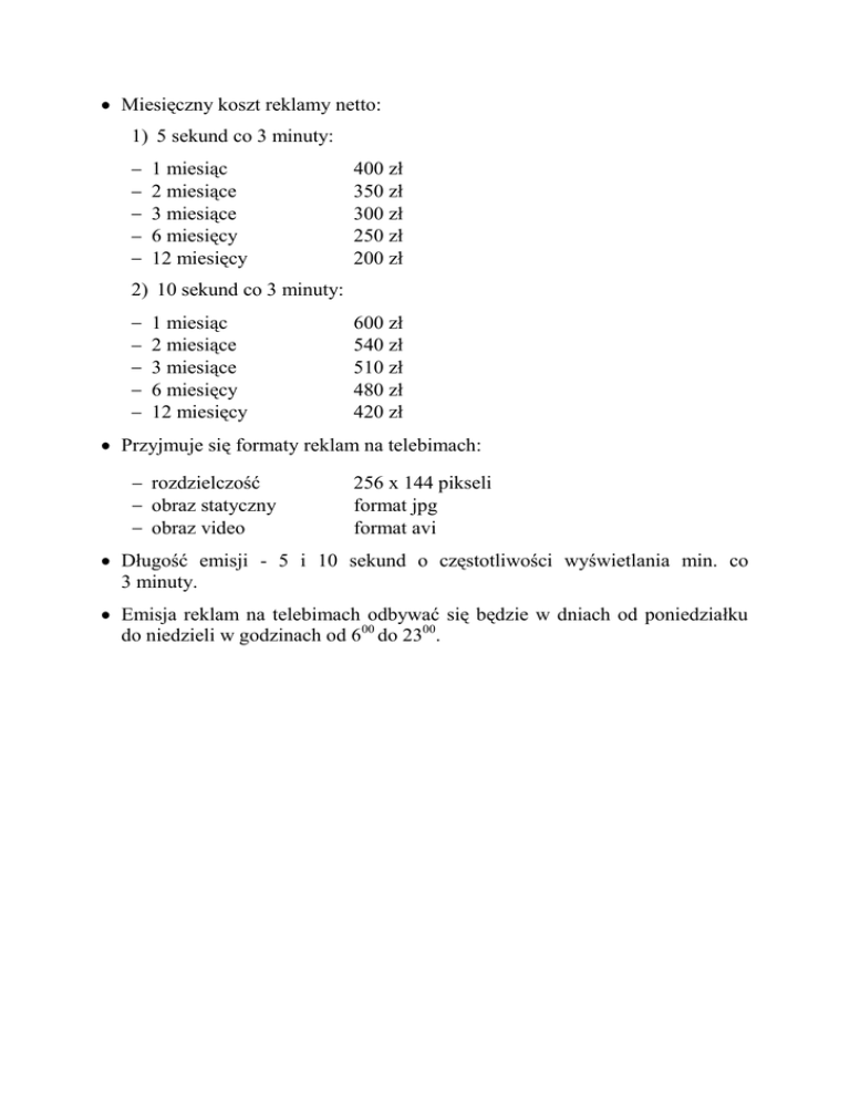 Miesięczny koszt reklamy netto: 1) 5 sekund co 3 minuty: 1 miesiąc 2 miesiące 3 miesiące 6 miesięcy 12 miesięcy 400 zł 350 zł 300 zł 250 zł 200 zł 2) 10 sekund co 3 minuty: 1 miesiąc 2 miesiące 3 miesiące 6 miesięcy 12 miesięcy 600 zł 540 zł 510 zł 480 zł 420 zł Przyjmuje się formaty reklam na telebimach: rozdzielczość obraz statyczny obraz video 256 x 144 pikseli format jpg format avi Długość emisji - 5 i 10 sekund o częstotliwości wyświetlania min. co 3 minuty. Emisja reklam na telebimach odbywać się będzie w dniach od poniedziałku do niedzieli w godzinach od 600 do 2300.