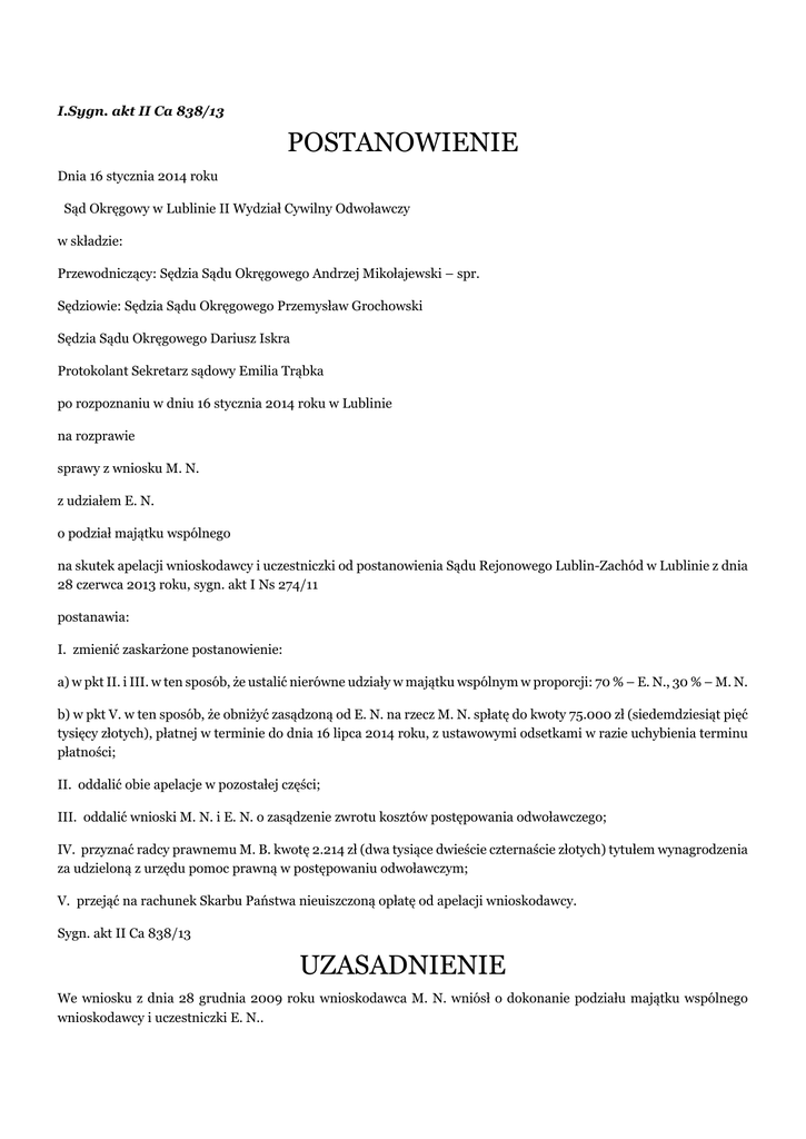 I.Sygn. akt II Ca 838/13 POSTANOWIENIE Dnia 16 stycznia 2014 roku Sąd Okręgowy w Lublinie II Wydział Cywilny Odwoławczy w składzie: Przewodniczący: Sędzia Sądu Okręgowego Andrzej Mikołajewski – spr. Sędziowie: Sędzia Sądu Okręgowego Przemysław Grochowski Sędzia Sądu Okręgowego Dariusz Iskra Protokolant Sekretarz sądowy Emilia Trąbka po rozpoznaniu w dniu 16 stycznia 2014 roku w Lublinie na rozprawie sprawy z wniosku M. N. z udziałem E. N. o podział majątku wspólnego na skutek apelacji wnioskodawcy i uczestniczki od postanowienia Sądu Rejonowego Lublin-Zachód w Lublinie z dnia 28 czerwca 2013 roku, sygn. akt I Ns 274/11 postanawia: I. zmienić zaskarżone postanowienie: a) w pkt II. i III. w ten sposób, że ustalić nierówne udziały w majątku wspólnym w proporcji: 70 % – E. N., 30 % – M. N. b) w pkt V. w ten sposób, że obniżyć zasądzoną od E. N. na rzecz M. N. spłatę do kwoty 75.000 zł (siedemdziesiąt pięć tysięcy złotych), płatnej w terminie do dnia 16 lipca 2014 roku, z ustawowymi odsetkami w razie uchybienia terminu płatności; II. oddalić obie apelacje w pozostałej części; III. oddalić wnioski M. N. i E. N. o zasądzenie zwrotu kosztów postępowania odwoławczego; IV. przyznać radcy prawnemu M. B. kwotę 2.214 zł (dwa tysiące dwieście czternaście złotych) tytułem wynagrodzenia za udzieloną z urzędu pomoc prawną w postępowaniu odwoławczym; V. przejąć na rachunek Skarbu Państwa nieuiszczoną opłatę od apelacji wnioskodawcy. Sygn. akt II Ca 838/13 UZASADNIENIE We wniosku z dnia 28 grudnia 2009 roku wnioskodawca M. N. wniósł o dokonanie podziału majątku wspólnego wnioskodawcy i uczestniczki E. N.. W toku postępowania uczestniczka E. N. wniosła o ustalenie nierównych udziałów w majątku wspólnym w ten sposób, aby udział uczestniczki ustalić na 9/10, a uczestnika na 1/10. Jeżeli chodzi o podział ruchomości oraz o żądanie uczestniczki rozliczenia poczynionych przez nią nakładów na majątek wspólny stron po ustaniu wspólności majątkowej, strony w tym zakresie cofnęły wnioski. * Postanowieniem z dnia 28 czerwca 2013 roku Sąd Rejonowy Lublin-Zachód w Lublinie: I. ustalił, że w skład majątku wspólnego wnioskodawcy M. N. i uczestniczki E. N. wchodzi spółdzielcze własnościowe prawo do lokalu mieszkalnego nr (...) położonego w L. przy ulicy (...), o powierzchni 61 m( 2), znajdującego się w zasobach mieszkaniowych Spółdzielni (...) w L., dla którego to prawa jest prowadzona księga wieczysta nr (...); II. ustalił, że udział w majątku wspólnym wnioskodawcy M. N. wynosi 40 %, zaś udział uczestniczki E. N.wynosi 60 %; III. oddalił wniosek uczestniczki E. N. o ustalenie nierównych udziałów w majątku wspólnym w pozostałym zakresie; IV. dokonał podziału majątku wspólnego M. N. i E. N., opisanego w pkt I. postanowienia, w ten sposób, że przyznał spółdzielcze własnościowe prawo do lokalu mieszkalnego nr (...) położonego w L. przy ulicy (...) uczestniczce E. N.; V. zasądził od uczestniczki E. N. na rzecz M. N. tytułem spłaty kwotę 100.000 zł, płatną w dwóch równych ratach po 50.000 zł każda, przy czym pierwsza rata płatna w terminie jednego roku od daty uprawomocnienia się niniejszego postanowienia, a druga rata płatna w terminie dwóch lat od daty uprawomocnienia się niniejszego postanowienia, z ustawowymi odsetkami w razie uchybienia terminu płatności którejkolwiek z rat; VI. umorzył postępowanie w zakresie podziału ruchomości wchodzących w skład majątku wspólnego; VII. umorzył postępowanie w zakresie roszczenia o rozliczenie nakładów z majątku osobistego uczestniczki E. N. na majątek wspólny; VIII. przejął na rachunek Skarbu Państwa kwotę 214,82 zł tytułem brakującej zaliczki na poczet dowodu z opinii biegłego oraz kwotę 1.000 zł tytułem brakującej opłaty od wniosku; IX. przyznał radcy prawnemu M. B. wynagrodzenie za udzielenie wnioskodawcy M. N. pomocy prawnej z urzędu w kwocie 3.600 zł, którą nakazał wypłacić ze Skarbu Państwa – Kasy Sądu Rejonowy Lublin-Zachód w Lublinie; X. stwierdził, że każdy z uczestników ponosi pozostałe koszty postępowania związane ze swoim udziałem w sprawie. Sąd Rejonowy ustalił następujący stan faktyczny: E. N. i M. N. zawarli związek małżeński w dniu 30 czerwca 1973 roku, umów małżeńskich majątkowych nie zawierali, pozostawali w ustroju wspólności majątkowej małżeńskiej. Wyrokiem z dnia 2 grudnia 2005 roku, sygn. akt III C 385/04, prawomocnym od dnia 22 marca 2006 roku, Sąd Okręgowy w Lublinie rozwiązał ich małżeństwo przez rozwód z wyłącznej winy pozwanego M. N.. W czasie trwania małżeństwa byli małżonkowie uzyskali przydział spółdzielczego lokatorskiego prawa do lokalu mieszkalnego położonego przy ul. (...) w L., znajdującego się w zasobach Spółdzielni (...) w L.. M. N.był członkiem (...) Spółdzielni Mieszkaniowej (...) od dnia 31 lipca 1975 roku do dnia 13 czerwca 1979 roku. W dniu 7 lipca 1979 roku dokonał cesji swojego udziału członkowskiego i wpisowego na rzecz żony E. N., która decyzją Wojewody L. z dnia 31 mają 1979 roku została skierowana do przydziału mieszkania w Spółdzielni Mieszkaniowej (...). Decyzją Zarządu Spółdzielni z dnia 6 sierpnia 1979 roku E. N.otrzymała przydział przedmiotowego lokalu. Wkład mieszkaniowy w kwocie 39.700 zł (przed denominacją) został pokryty częściowo z pożyczki udzielonej M. N. z (...) Fabryki (...) w kwocie 29.600 zł oraz z kwoty 21.809,50 zł uzyskanej w wyniku likwidacji książeczki mieszkaniowej M. N., założonej w dniu 6 stycznia 1975 roku. Środki na książeczce mieszkaniowej pochodziły z wpłat dokonywanych przez uczestników w trakcie trwania ich małżeństwa. W dniu l sierpnia 1989 roku E. i M. N. złożyli wniosek o przekształcenie lokatorskiego prawa do lokalu w spółdzielcze własnościowe prawo do lokalu. Wymagana z tego tytułu kwot